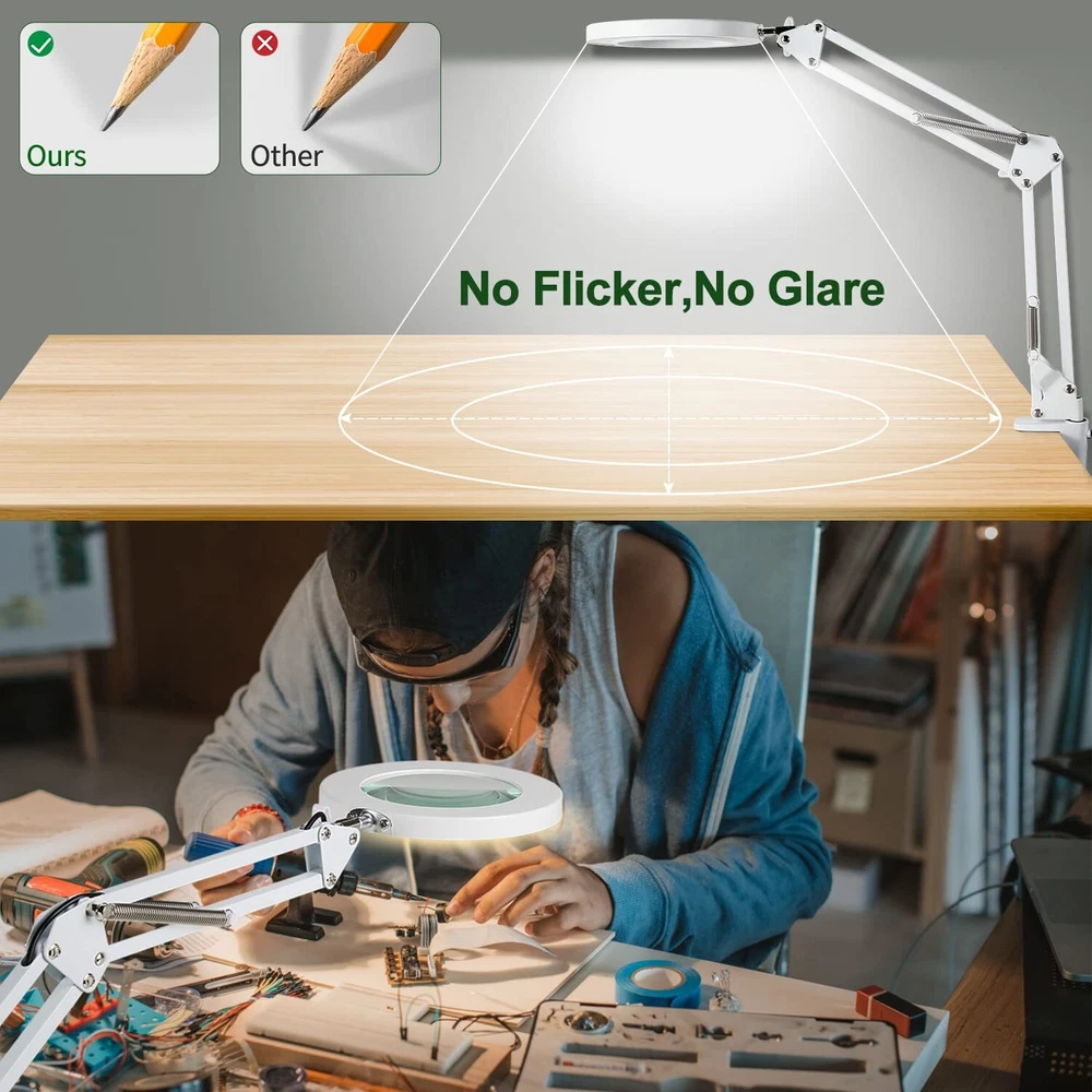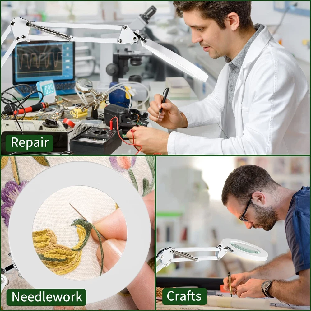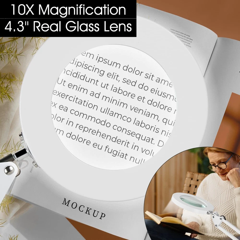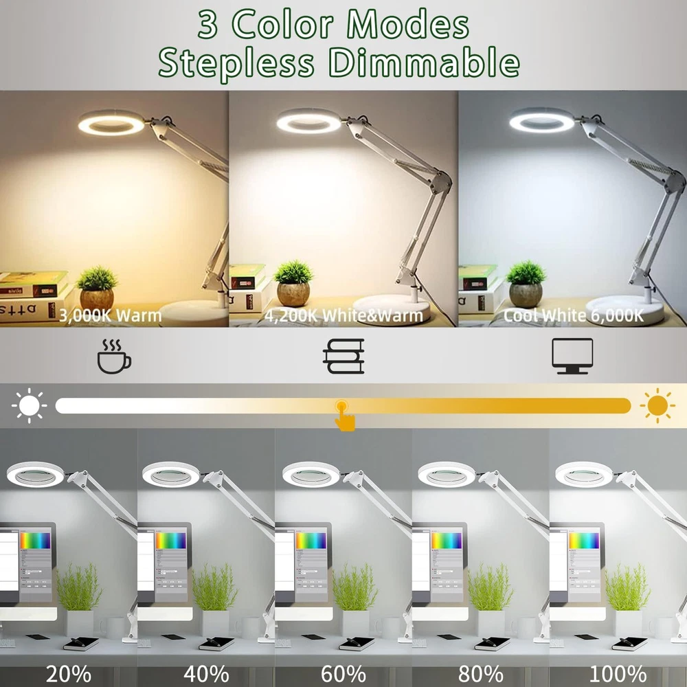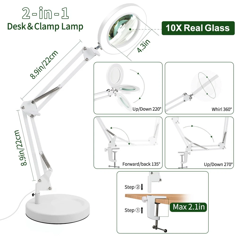 【10x Magnification & Real Glass Lens】LED magnifying glass is professionally designed with a 4.3" real glass lens, which can provide a clear magnifying view without distortion. Up to 10x magnification makes reading/viewing small prints, sewing, repairing, carving, manicuring, soldering, etc easier. It is designed for people who need to work continuously at close range or who need visual aids. There is no dizziness even if use it for a long time. 【3 Color Modes & Adjustable Lighting 10-Levels 】Magnifier with light has 72pcs high-brightness LED lamp beads with an up of 12W &1200 lumens. It's designed with 3 color modes (white, warm, and cool) and stepless dimmable, you can easily adjust the brightness level between 10% and 100%, and choose the most appropriate light source for your environment. 【2-in-1 Desk Lamp & Clamp Light】Magnifying glass with light and stand come with a weighted base and clip. You can use the base as a table lamp, or mount it on any flat surface (maximum thickness <2.1") as a clip light. The clamp can be easily mounted on a desktop, shelf, or workbench without any tools, which not only saves space but also can be easily rotated to free up hands. 【Flexible Adjustment & Long Flexible Arms】The LED lighted magnifying glass has connected metal swivel arms with 3 knobs and 4 springs, the long arms can extend up to 20 inches. 360-degree rotatable light head, which can project light in any direction to meet your needs. 【Eye Protection and Energy-Saving】Magnifying lamp adopt a ring design with 72pcs built-in high-brightness LED providing you with an even, soft light and a large area of illumination. Without glare and flicker, the uniform light also prevents eye fatigue and hurting. It's the perfect gift for people with low vision, the elderly and those who need to constantly focus on close work.