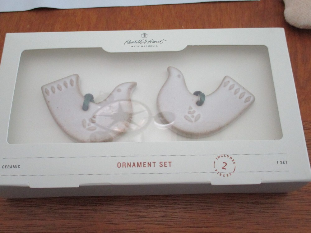 YOU ARE LOOKING AT Magnolia Hearth Hand Christmas Tree Ornament Nordic Dove Birds Set Of 2 Ceramic SMOKE AND PET FREE HOME.USA SHIPPING ONLY. PLEASE CONTACT ME THROUGH E-BAY ONLY. SEE MY OTHER ITEMS IN AUCTION. I AM HAPPY TO COMBINE SHIPPING. THANKS FOR LOOKING. PLEASE ASK QUESTIONS. I TRY TO DESCRIBE ACCURATELY AND WANT YOU TO BE HAPPY WITH PURCHASE SO IF ANY PROBLEMS, PLEASE CONTACT ME.