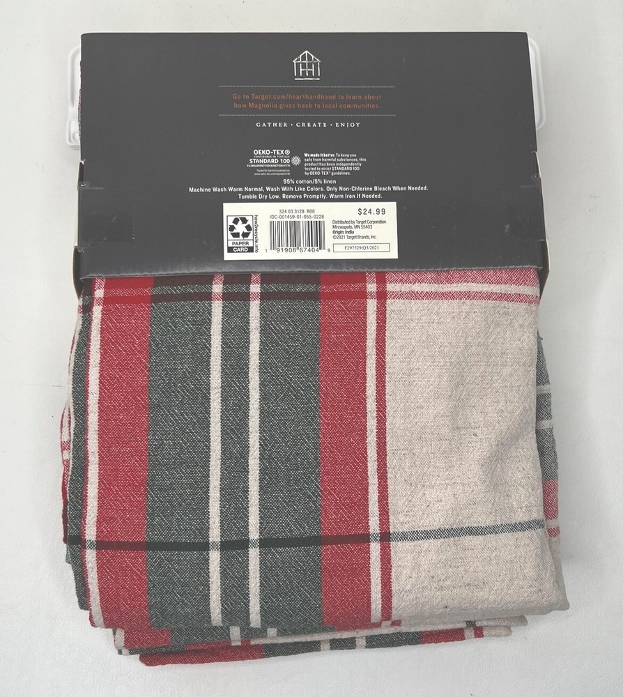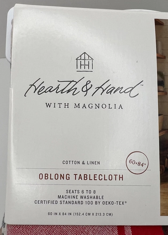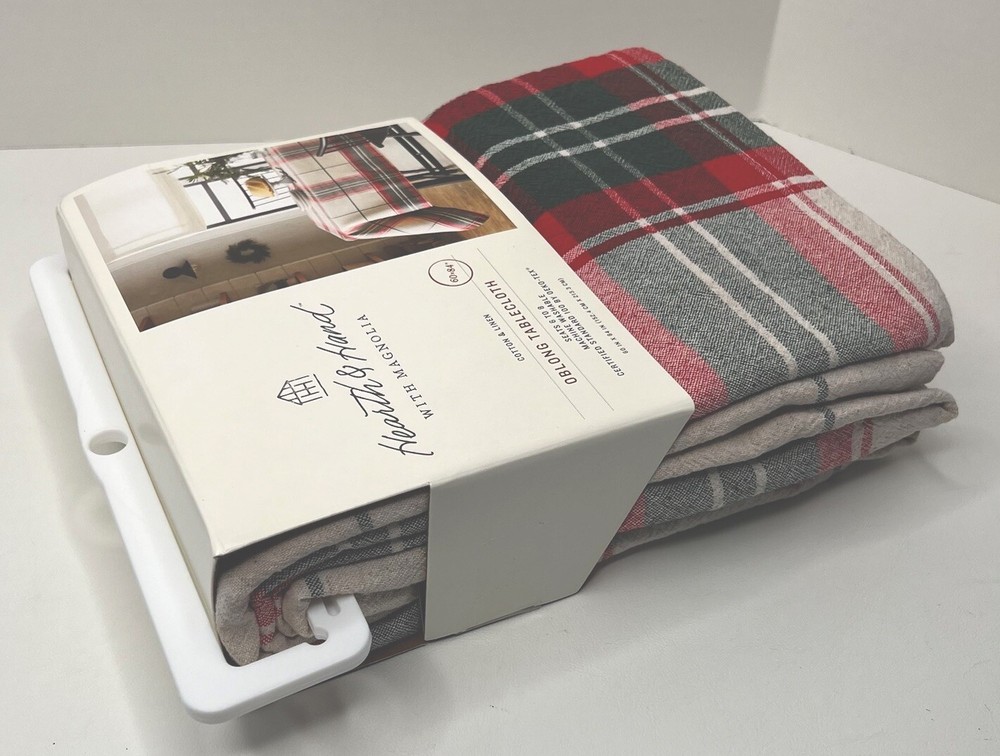 This festive plaid tablecloth is perfect for holiday gatherings! The cotton-linen blend feels sturdy yet soft, and the size easily fits 6-8 guests. The classic Joanna Gaines design adds cozy charm to any table. Arrived brand new in the packaging just as described—such a great find! Highly recommend for anyone wanting to add a warm, seasonal touch to their decor.