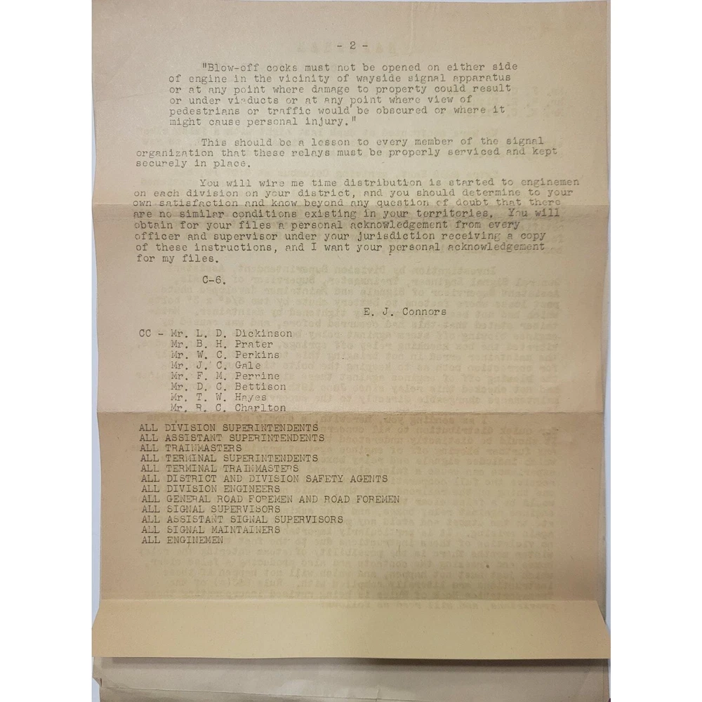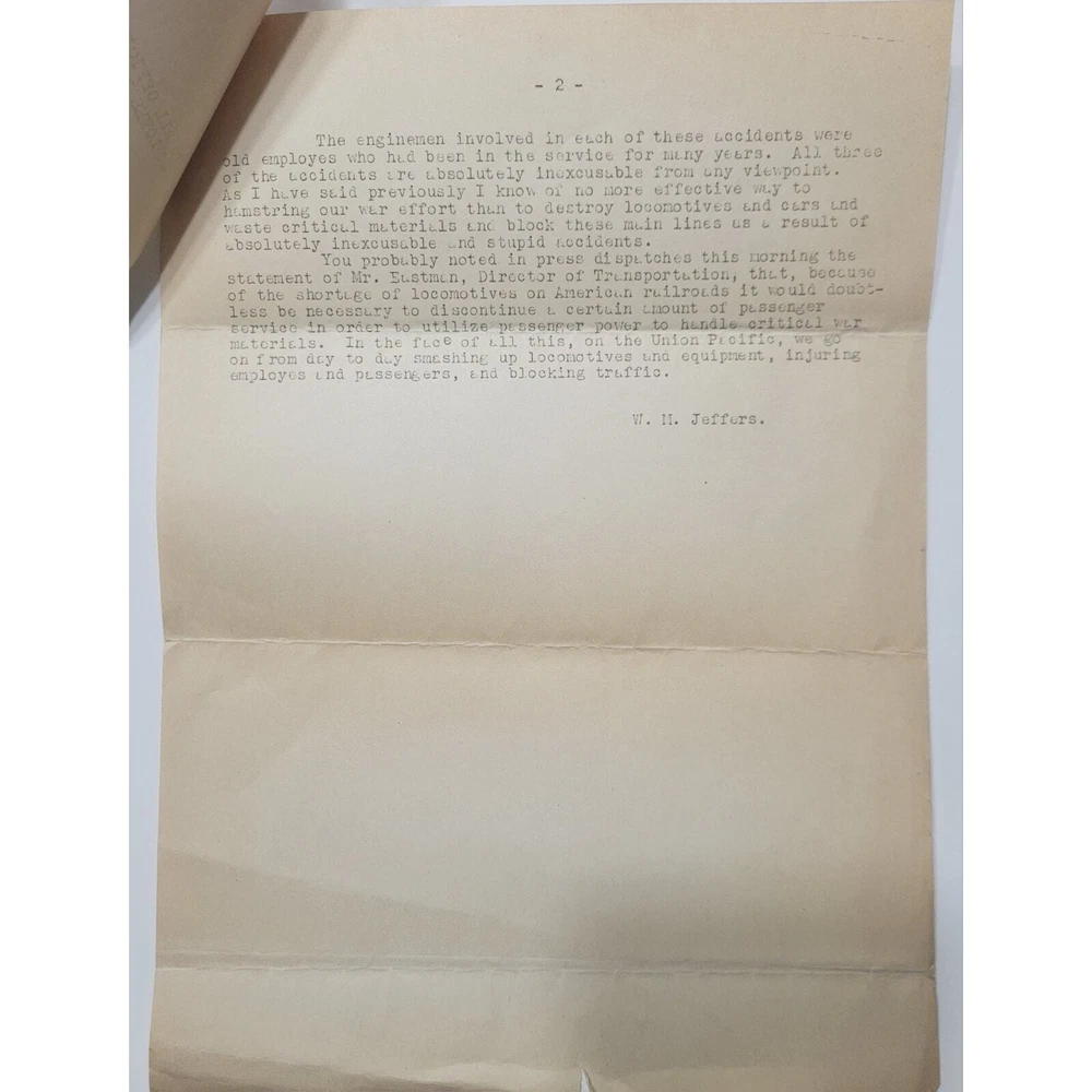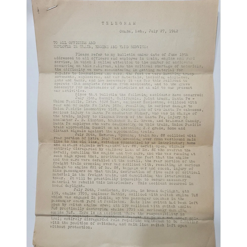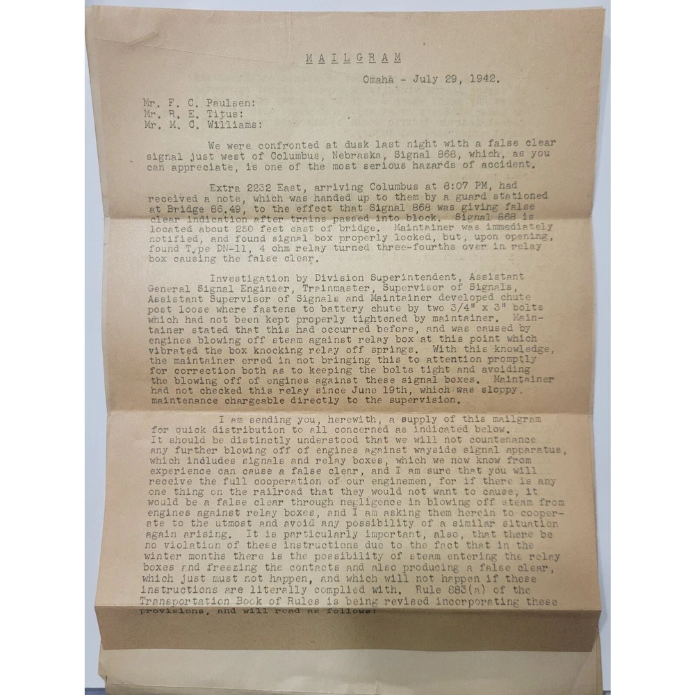 Mailgram Telegram July 1942 False Clear Signal Maintenance Railroad Trains. The Mailgram sent on July 29, 1942 describes how a false clear signal, just west of Columbus, Nebraska was reported. The Telegram sent on July 27, 1942 refers to various rail accidents and collisions. Mailgram Telegram July 1942 False Clear Signal Maintenance Railroad Trains please see the pictures for condition.