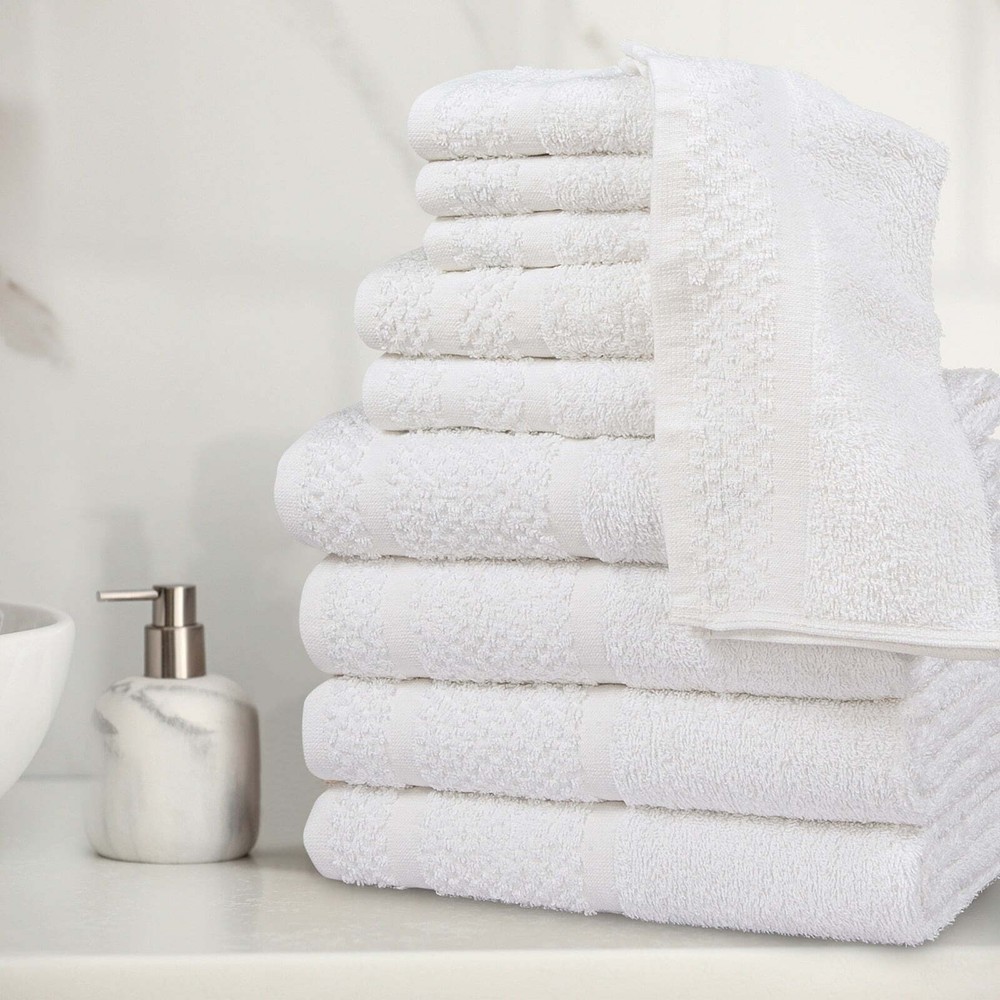 Embrace yourself in the comfort of the Mainstays Value 10-Piece Towel Set. Made from soft, absorbent 100% cotton, these towels dry quickly . The new design features a popcorn textured border for a fresh look in your bathroom, and double needle stitching for durability. This fade-resistant set includes four bath towels, two hand towels, and 4 washcloths, All age group. and all machine washable. 10-piece set includes 4 bath towels, 2 hand towels, and 4 washcloths New design with a popcorn textured border Stylish cotton bath towels feature double needle stitching for even more durability an everyday must-have for your bathroom. for adults Soft, absorbent, and fade-resistant Made of 100% cotton All age group.