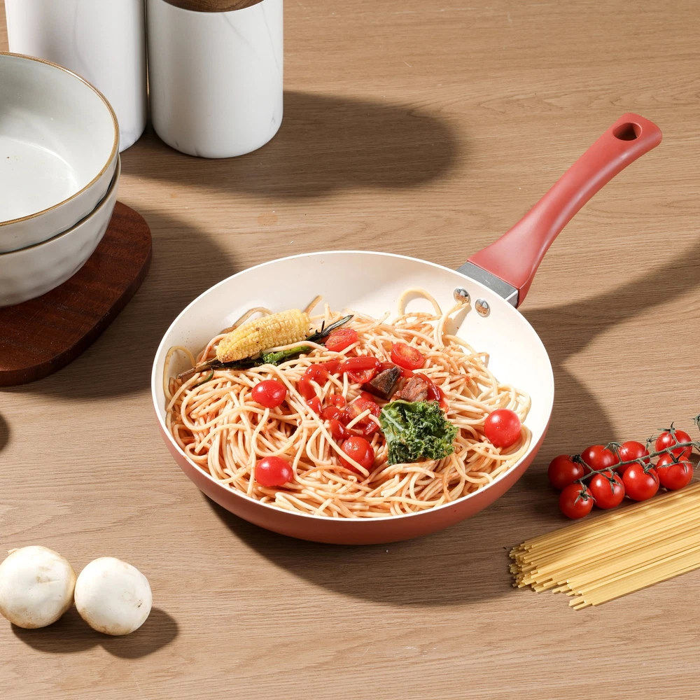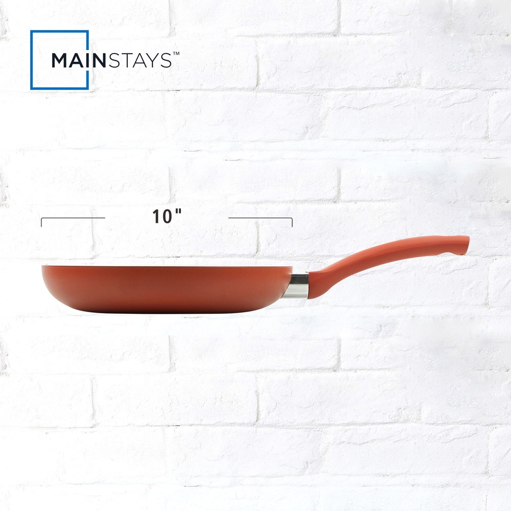 Update your kitchen essentials with the Mainstays Ceramic 10In Aluminum Nonstick Frypan Red Canyon.This 10in aluminum frypan is ideal for everyday cooking at home. Easy clean up. Aluminum body distributes heat more fast and even, it will help you save time cooking as well. The interior is coated with 2 layers of PPG Customized ceramic coating, which is healthy and makes cooking and clean-up easy. Handle is strongly connected by rivets. It is suitable for all cooktops except induction. The outside red color of this frypan will offer a bright pop of color to your kitchen Aluminum body for fast and even heating Riveted handle for strong connection Suitable for all cooktops except induction Mainstays Ceramic 10In Aluminum Nonstick Frypan Red Canyon