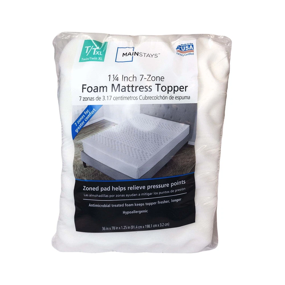 Enhance your bedding collection with the Mainstays 1.25" 7-Zone Foam Mattress Topper. Designed for twin-sized beds, this modern style mattress topper features a rectangular shape and an abstract pattern. Made with hypoallergenic material, it is suitable for all seasons and provides a breathable sleeping experience. This Mainstays mattress topper is perfect for any bedroom and is compatible with the Family Guy character family. It is made in the United States and is a great addition to your home and garden decor.