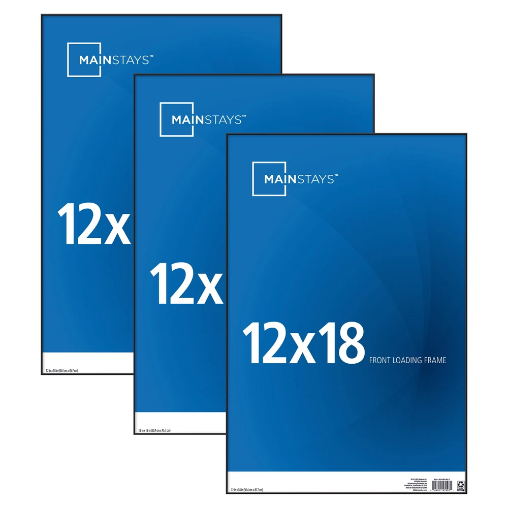 Preserve your favorite memories, artwork, letters or memorabilia with the Mainstays 12" x 18" Front Loading Picture Frame Set of 3. Each one has an easy-to-use, front-loading design. You can hang these Mainstay Front Loading picture frames on a wall vertically or horizontally. In addition, you can snap the included easel onto the back of the frames and transform them into a tabletop display. These plastic picture frames feature a black finish, which allows them to complement a variety of color schemes. Their modern, sophisticated style complements most home or office decor styles. Group the Mainstays 12" x 18" Front Loading Picture Frame Set of 3 together to create a collage, or place them in several different locations around your home. On Sep 23, 2024 at 04:43:58 PDT, seller added the following information: On Nov 21, 2024 at 23:08:00 PST, seller added the following information: