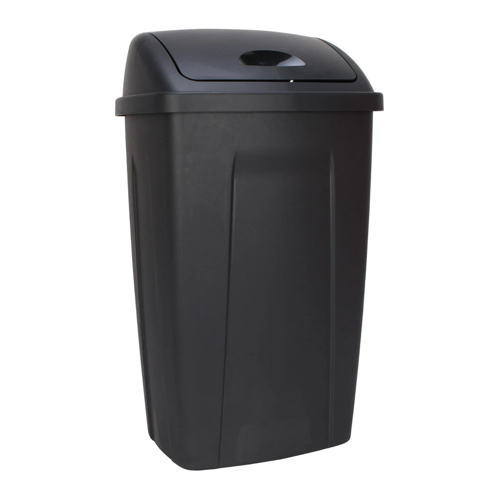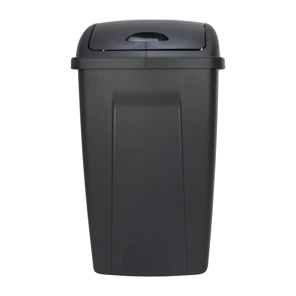 The Mainstays 13 Gallon Black Wastebasket is ideal for small spaces. With a durable polypropylene plastic, this wastebasket is perfect for the kitchen. The durable material offers an easy clean ability as well to make sure the wastebasket lasts for years of use. The overall assembled dimensions of this item are 12.5" L x 16.35" W x 28.23” H. Comes in White, Black, Red, and Gray Easy to clean surface Ideal use for the kitchen, bathroom, garage, or office Dual swing lid - swings in when pushed or opens up when lifted Accommodates 13 gallon trash bag Dimensions: 12.5" L x 16.35" W x 28.23” H