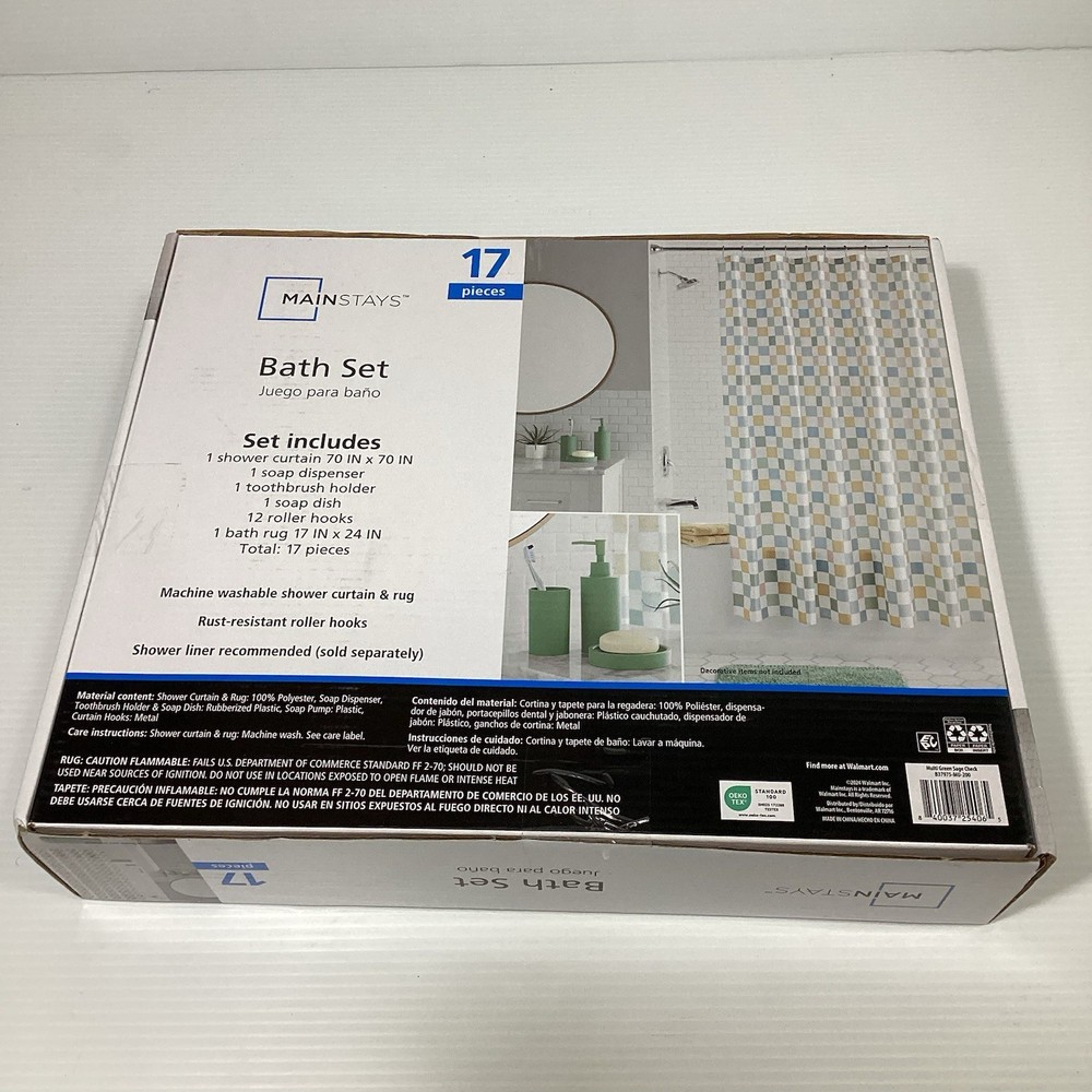 The Mainstays 17 PCS Bathroom Set in Sage is a modern accessory set designed for adults. This new sealed box includes 17 items made from various materials, all in a stylish sage color. The set does not require any assembly and is perfect for adding a touch of elegance to any bathroom. With the trusted Mainstays brand and original design, this set is sure to enhance the functionality and aesthetic of your bathroom space. Comes with 1 shower curtain 70 inch X 70 inch, 1 soap dispenser, 1 toothbrush holder, 1 soap dish, 12 roller hooks and 1 bath rug 17 inch X 24 inch