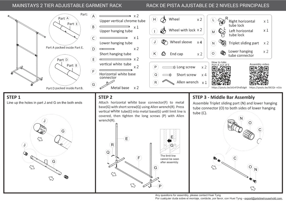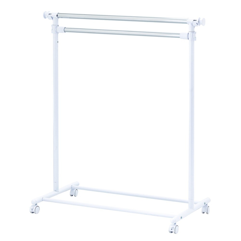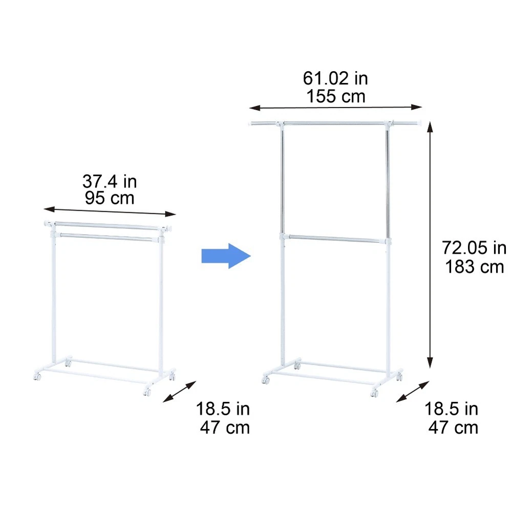 Get organized around the house with this durable and classic adjustable 2-tier garment rack. With this product, you can hang your clothes with confidence. The innovative space-saving design maximizes your unused space. Wide range of applications and it can apply for short garments, such as pants, shirts and skirts. Double layer design, large enough to hang many kinds of clothes. Smooth-rolling wheels for easy mobility, and the height can be adjustable. Strong metal base for better loading and stability. The bottom layer is great places for putting shoes, boots, storage box and many other things. Space-saving, stable, sturdy and durable, you can rest assured you are getting authentic Mainstays product. Assembled Product Size: 37.4-61.02W x 18.5D x 72.05H inch/ 95-155W x 47D x 183H cm. Assembled Product Weight: 2.84kgs/6.25lbs. Mainstays Adjustable 2-Tier Rolling Garment Rack Perfect storage solution for homes without built-in closets 2 tiers of hanging rods are ideal for business shirts, blouses, skirts, slacks, dresses, jackets and more Assembled Product Size: 37.4-61.02W x 18.5D x 72.05H inch/ 95-155W x 47D x 183H cm Assembled Product Weight: 2.84kgs/6.25lbs Built-in casters make it easy to move the garment rack from room to room Outer order and organization helps you to feel a sense of inner calm This unit is intended for use only with the products and maximum weights indicated. Maximum Safe Load: 66 LBS(30 KGS);use with other products or products heavier than the maximum weights indicated may result in instability causing possible injury User-friendly and strong metal base design makes for easy assembly
