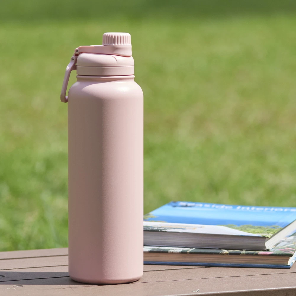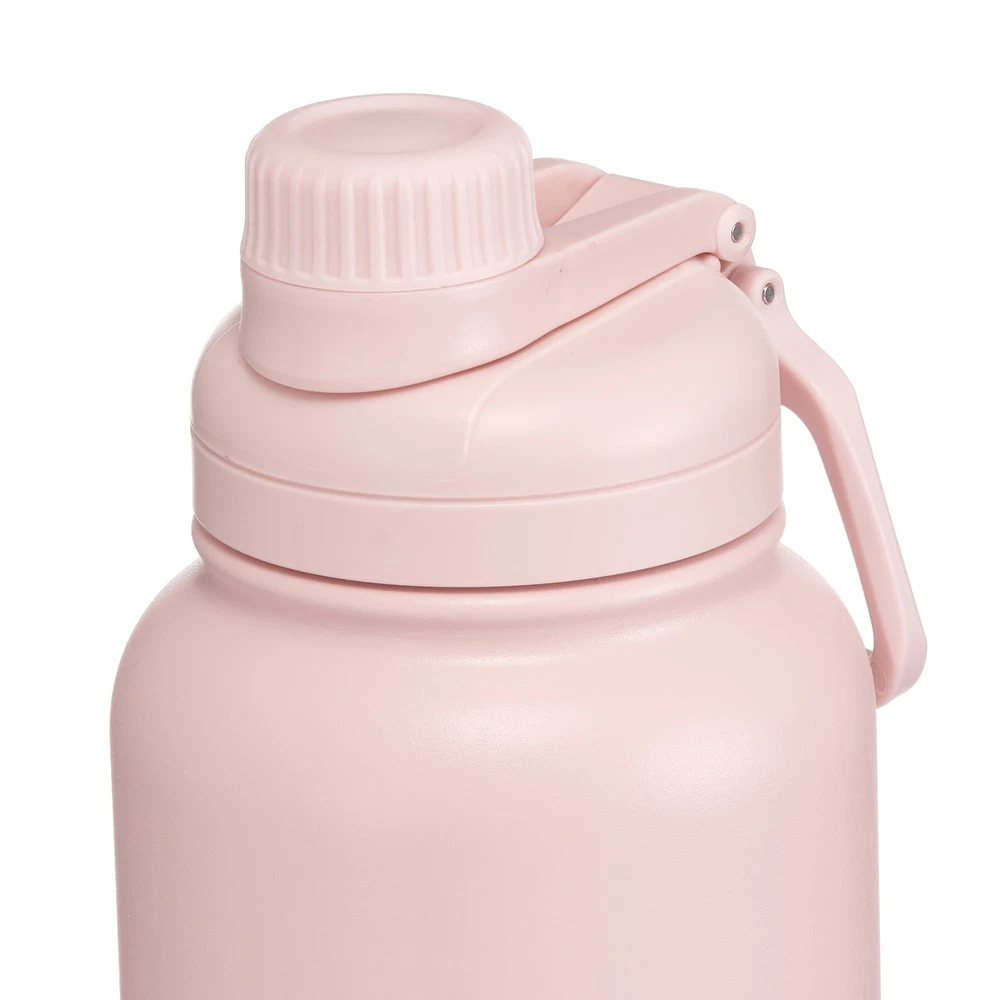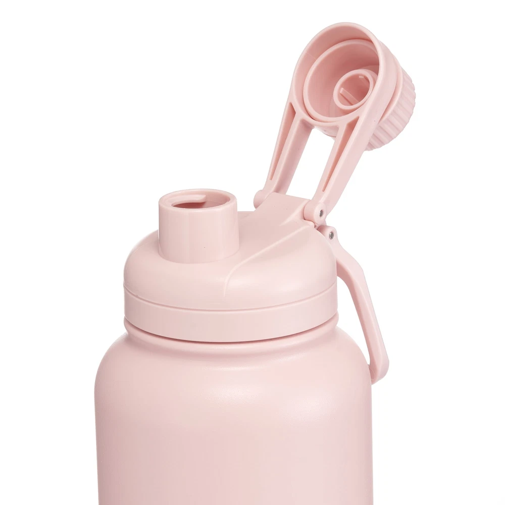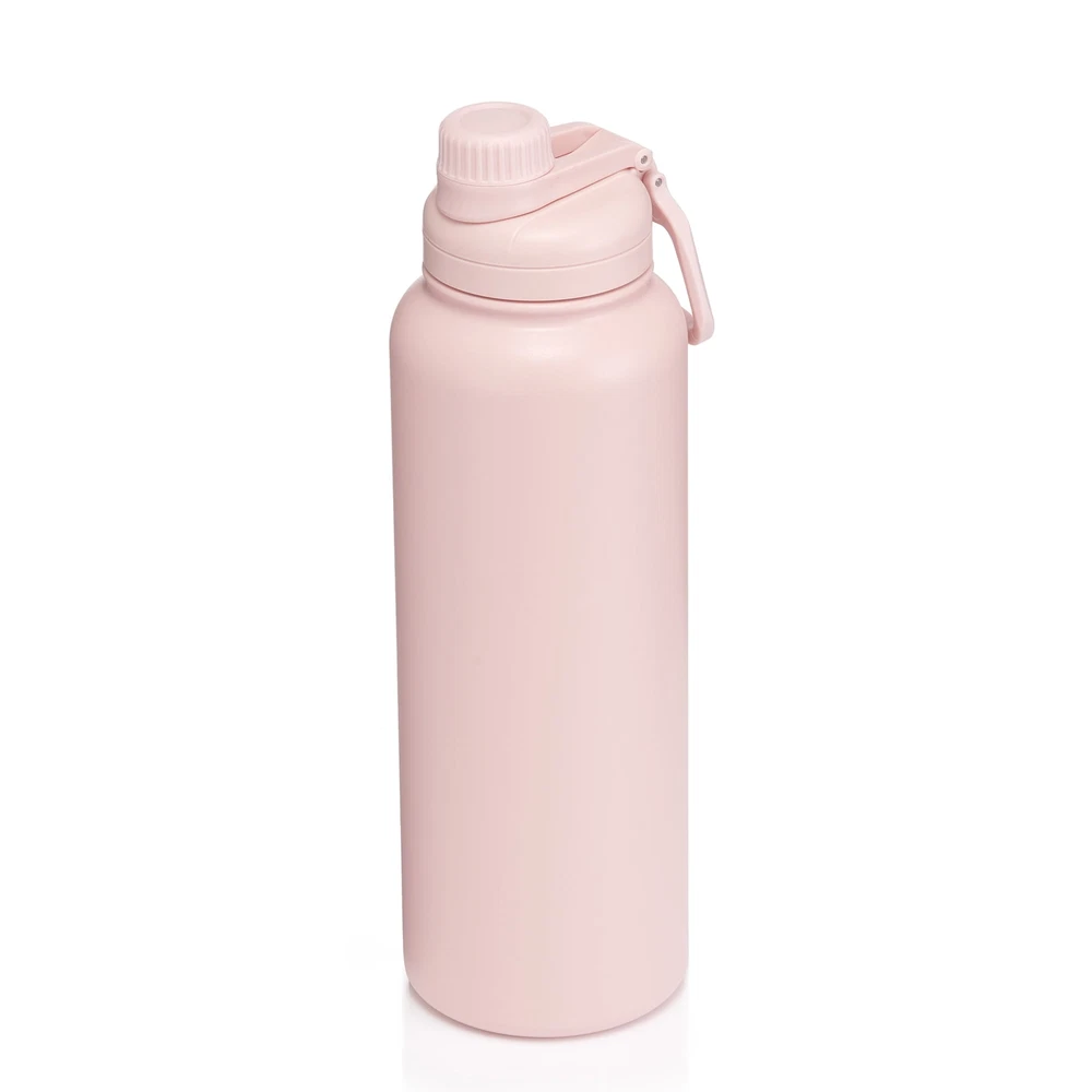 This 40 fl oz double wall SS bottle has 4 colors (rich black/pearl blush/blue essence/arctic white) available for your selection. It is made of 304 stainless steel, 0.5 mm/inner and 0.5 mm/outer. The surface is finished with a matte powder coating. The chugger lid is leakproof and interchangeable with MS's other hydration bottles. Double-wall vacuum insulation keeps drinks cold or hot. Double-wall sweat-free design prevents condensation. 40 fl oz capacity BPA-free and reusable Leak-proof chugger lid Matte powder coating surface 2 Color: Black/Pink