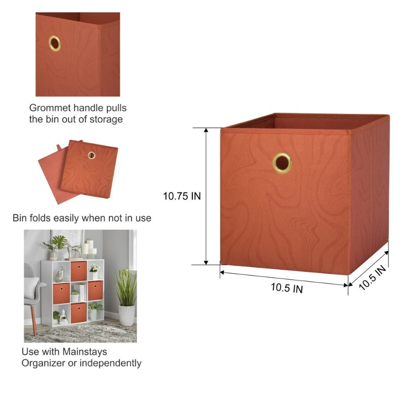 Our Mainstays Red Canyon Swirl Collapsible Fabric Storage Bins are just what you need to help you create an organized home. Perfect for storing kids to adult clothes, books, electronics and more, these bins' 10.5-inch by 10.5-inch by 11-inch size offers plenty of room to keep a wide variety of belongings neatly tucked away, and their sturdy, round metal handle allow you to pull them off shelves and slide them back in with ease. You can utilize our Mainstays Storage Cube's organizational expertise in your living room, bedroom, laundry room, and dorm room. When not in use, you can easily fold the bin down flat and keep it stored away in your closet for later. The fabric storage cubes are made to fit with our Mainstays Cube Storage Organizers (not included) and are designed with a durable polyester fabric that holds their shape. With a variety of colors to choose from, you'll be able to perfectly match your home decor when you get organized with our Mainstays Collapsible Fabric Storage Bins. Helps you to create an organized and comfortable home Includes 4 red canyon printed cube organizer bins Perfect for pairing with your favorite colors and patterns to mix and match Bin features an easy carry handle on the side that makes it easy to take the bin wherever you need to go Cubes are collapsible when not in use to maximize your space Ideal for storing books or kids and adult clothing in the bedroom, living room, laundry room or dorm rooms Made of durable polyester fabric that won't crease easily, has good abrasion resistance and holds its shape Dimensions: 10.5" L x 10.5" W x 10.75" H (26.5 cm x 26.5 cm x 27.3 cm)