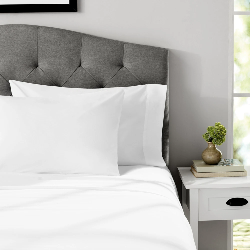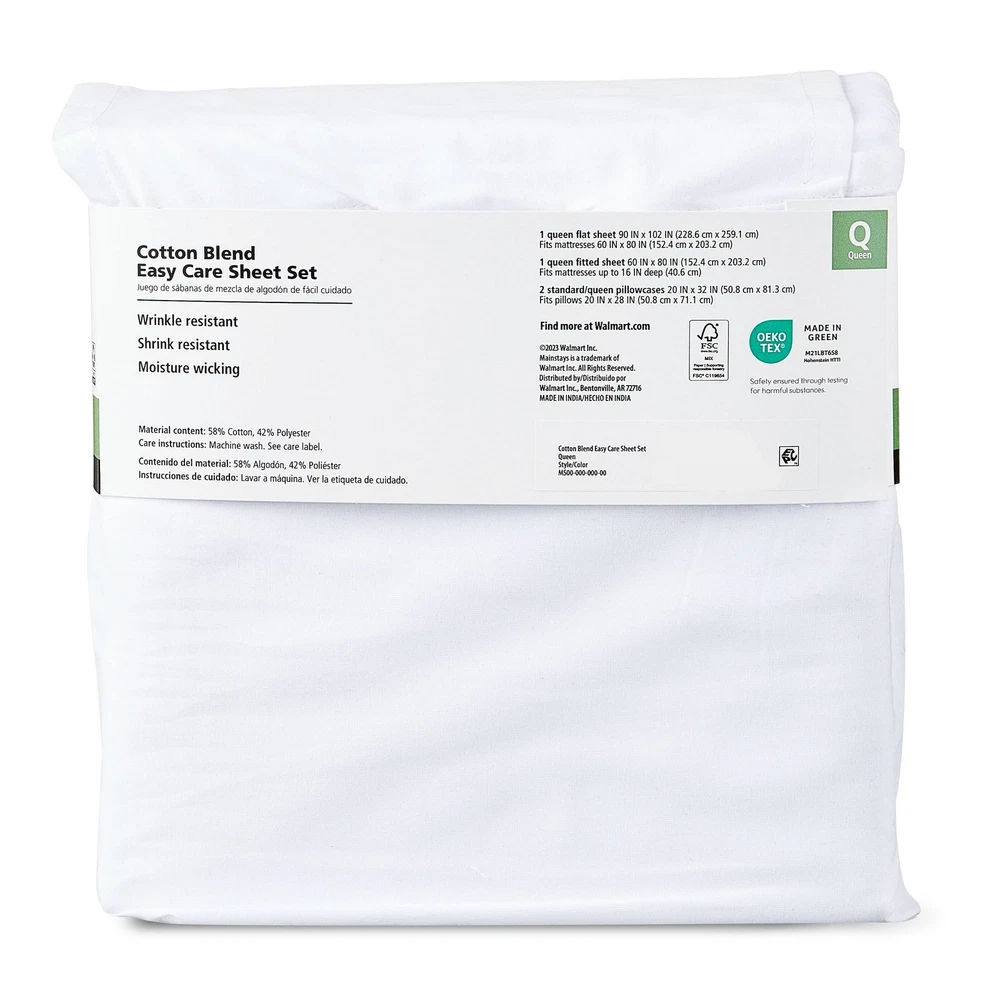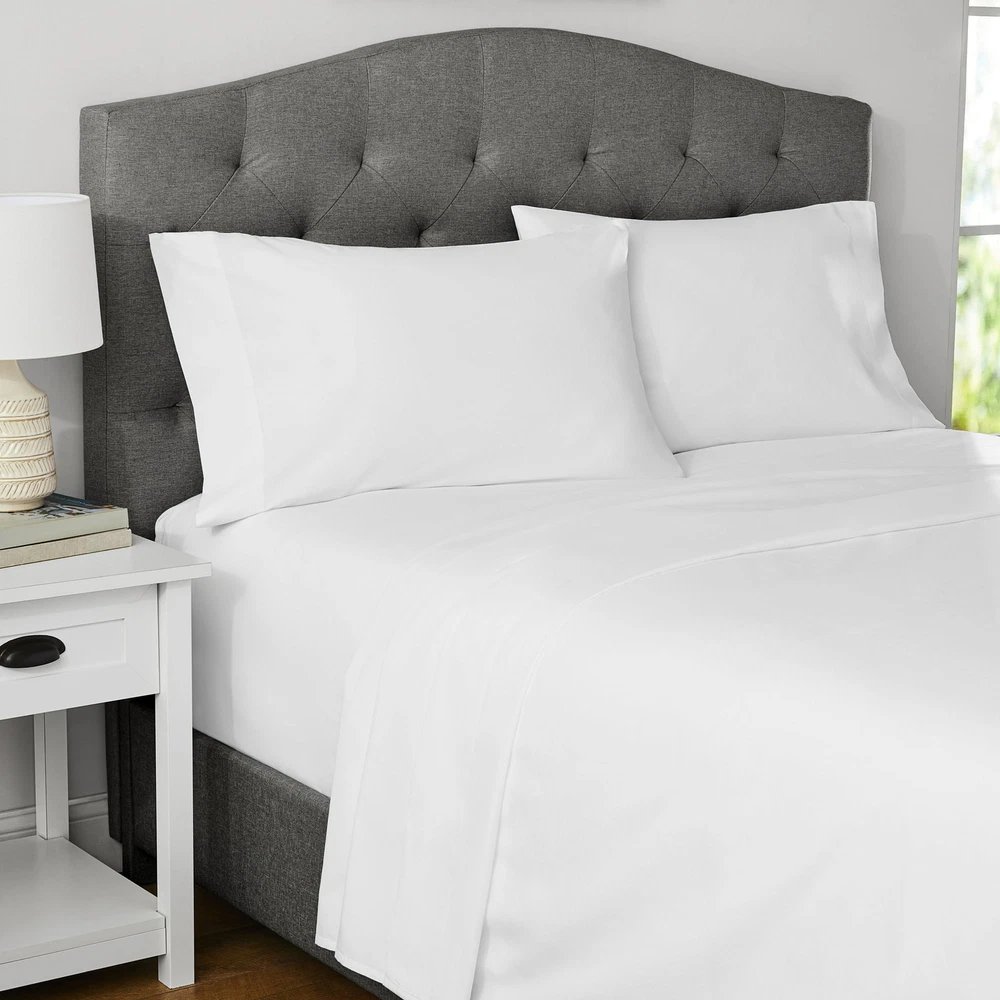 The Mainstays 4-Piece 300 Thread Count White Cotton Bed Sheet Set is a luxurious addition to any bedroom. Made from soft and durable cotton material, this Queen-sized set includes a flat sheet, fitted sheet, and two pillowcases, all in a classic white color. The 300 thread count ensures a comfortable and smooth feel against the skin, making it perfect for a restful night's sleep. Ideal for upgrading your bedding, this sheet set is a practical and stylish choice for any home.