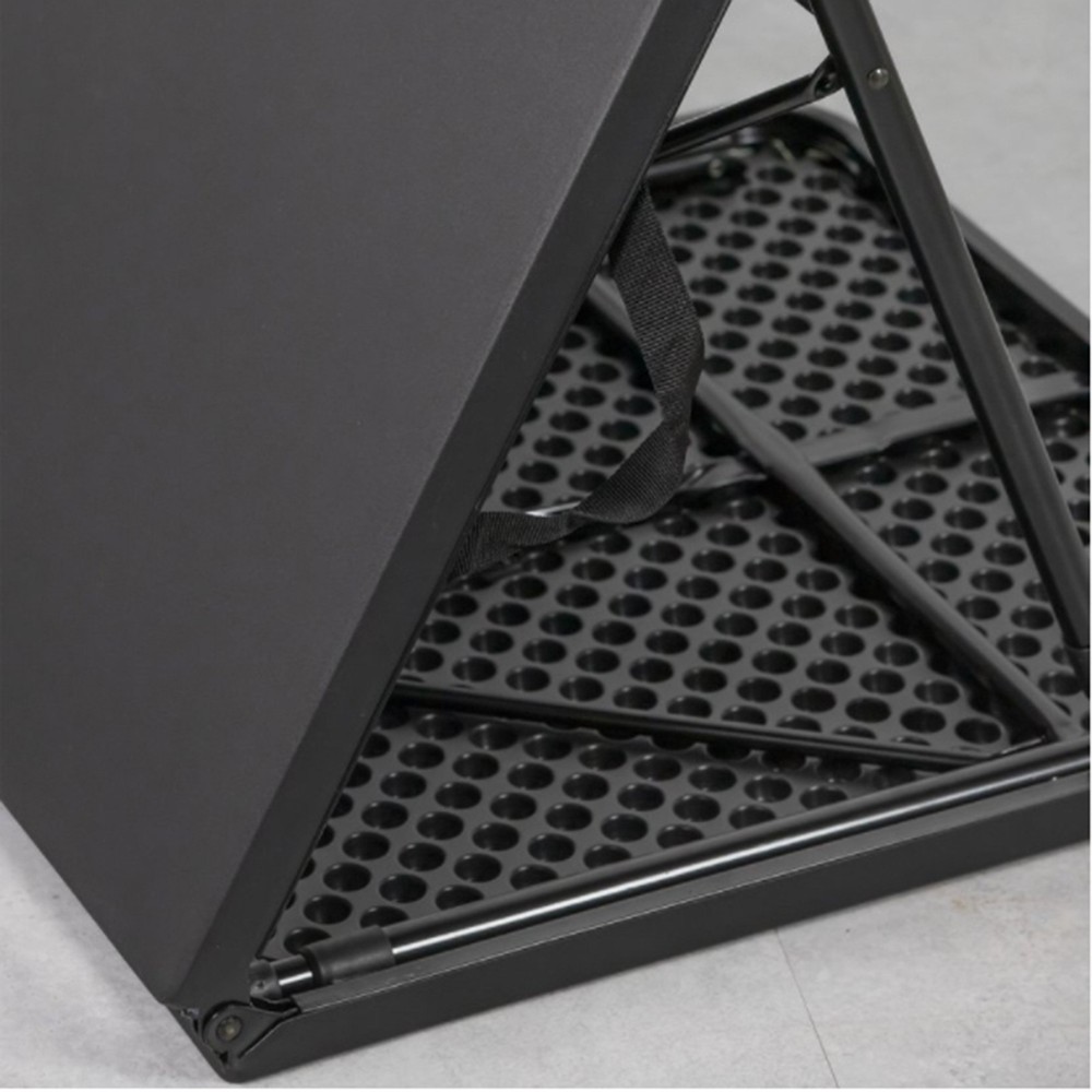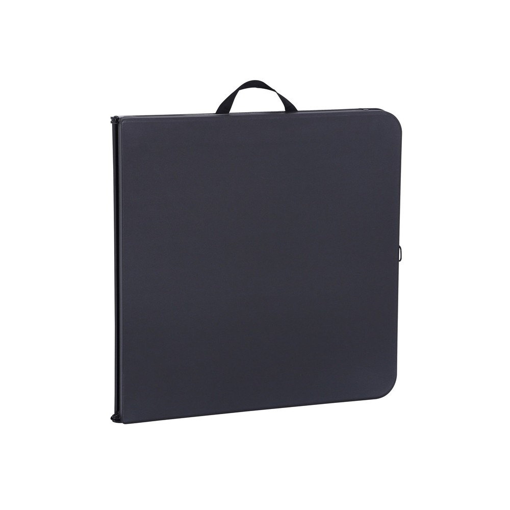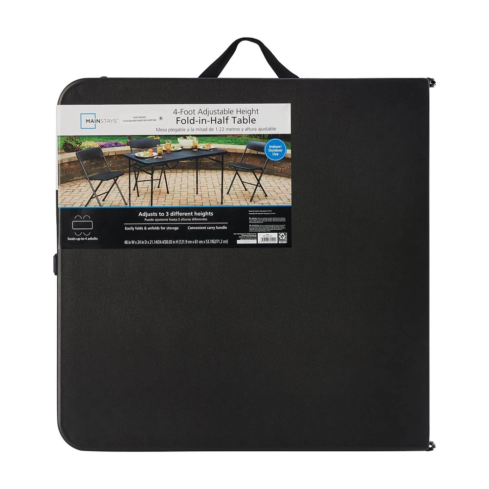 Provide all of the table spaces that you need in all kinds of settings with the Mainstays 4' Fold-in-Half Adjustable Table in Rich Black. This versatile rectangular table is sturdy and durable, made with reliable materials, and folds for easy storage and transportation. When you're finished using it, just fold in the metal legs, fold the table in half, and your new compact table is ready for transport! Its classic black color is sure to fit in at any gathering in any setting, and its spacious expanded 48" long table-top is ideal for holding a wide variety of foods, crafts, or whatever items you are working with! It's great for everyday use both indoor and outdoor, as a serving table, craft supply table, outdoor meal table, or for whatever purposes you may need. The plastic tabletop is easy to clean with no fuss just wipe it down with a damp cloth, and it will look as good as new! The carrying handle makes it perfect for taking on the go, for outdoor barbecues, game nights, school activities, parties, or tailgating events. The table comfortably seats 4 adults, so all of your friends and family can be included. Mainstays 4 Foot Fold-in-Half Adjustable Indoor Outdoor Table, Rich Black Product Dimension:48" W x 24" D x 21.14" - 24.4" - 28.03" H Comfortably seats 4 adults Easily folds in half for convenient storage Classic black color coordinates with almost any decor! Includes a built-in carry handle, for easy transportation Rubber stoppers on the legs for added grip on floor surfaces Appropriate for use indoors or outdoors Easy-to-clean resin surface Strong durable powder-coated metal construction Number Of Pieces: 1 x folding table