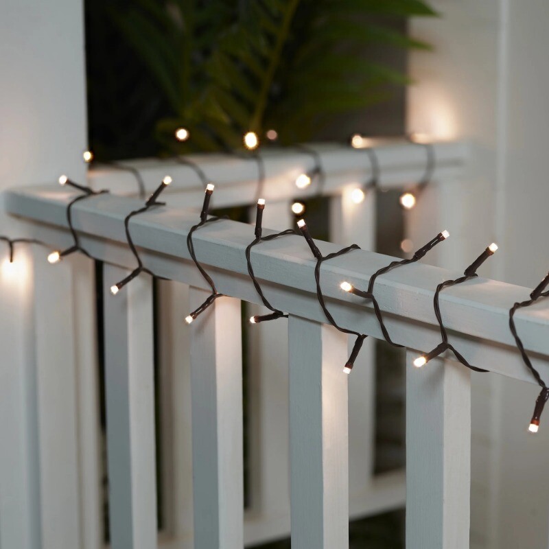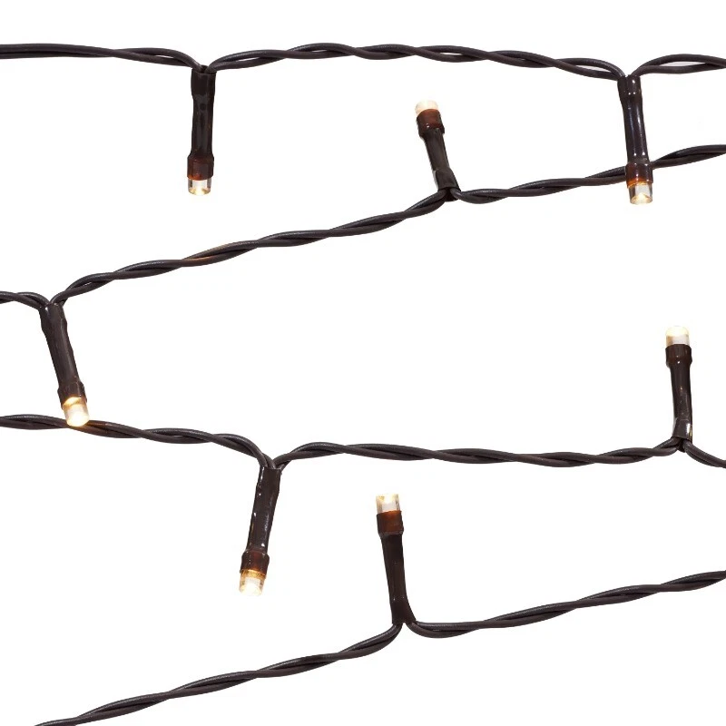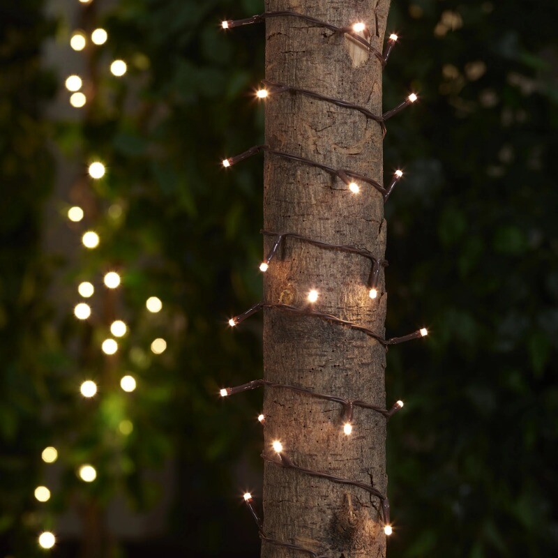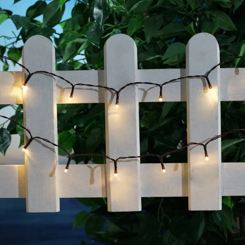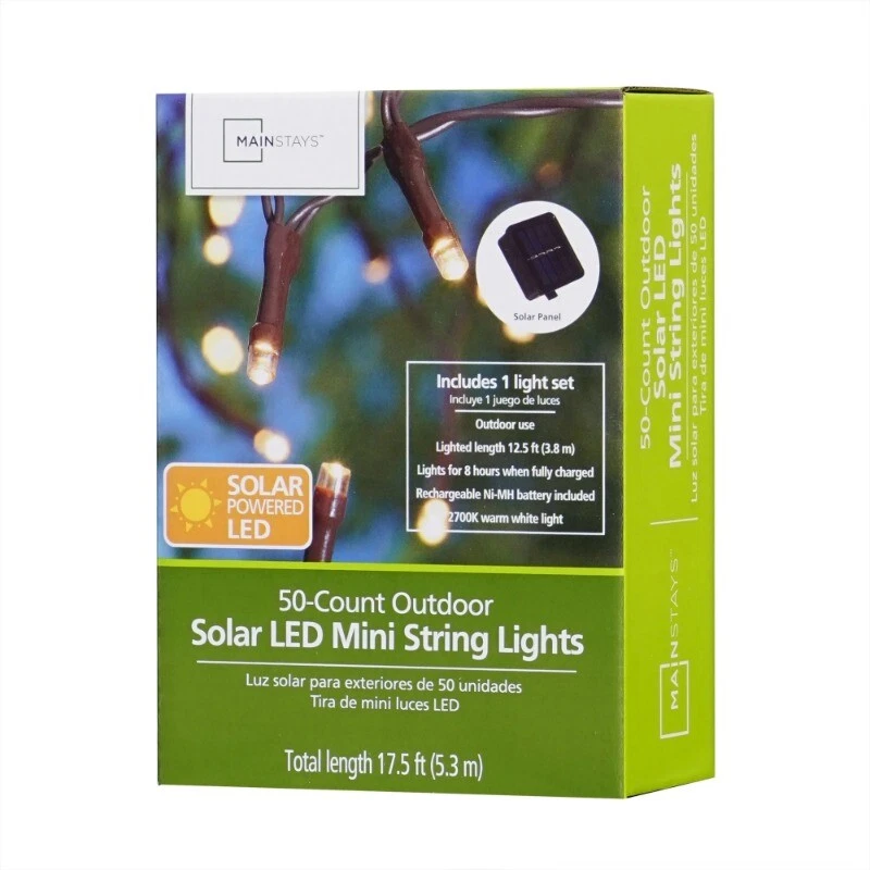 Mainstays Solar 50-count Warm White LED Mini String Lights on Brown Wire are designed to be functional and decorative. These warm white steady-burning LED lights are on brown wire to blend in with just about any dark-colored surface you attach them to. After the sun goes down, these mini solar-powered lights add the perfect amount of light long into the evening. These lights are ideal for patios and gardens to drape over shrubs and bushes. The lights will turn on automatically at dusk and glow continuously for up to 8 hours when fully charged. The set has an on/off switch and includes one 500 mA Ni-MH rechargeable battery along with a plastic stake for easy placement. With a lighted length of 12.5 ft. and a total length of 17.5 feet, this light set can light up all your outdoor parties and events. These solar-powered LED mini lights save energy and money as they light up with zero cost. Outdoor use only. 2700K warm white light. 50 warm white solar-powered LED mini lights Includes on/off switch Lighted length: 12.5' Total length: 17.5' Light bulb spacing: 4" Brown wire blends with most dark-colored surfaces Includes one 500 mA Ni-MH rechargeable battery along with plastic stake for easy placement Lights begin to glow automatically at dusk and light up to 8 hours when fully charged The LED solar-powered lights provide energy savings and a longer-lasting bulb 2700k lighting brightness Outdoor use only