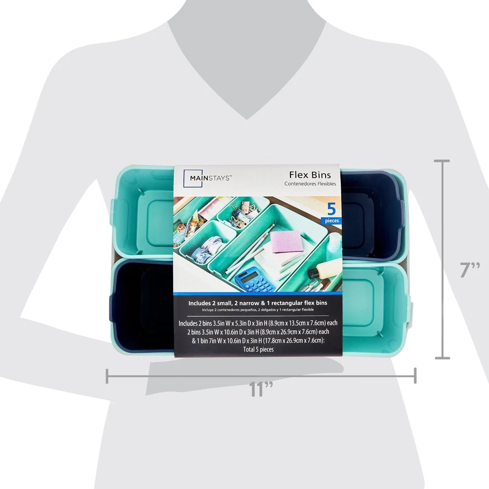 About this item Product details Perfect for storing all kinds of household items, this set of five Mainstays Flex Bins helps to keep your home more organized. With a solid wall design that keeps items securely contained, this set of five dishwasher-safe organizers are made of a flexible material to be perfectly sized for use individually or as a group that fits inside most standard sized drawers. These trays feature a lift tab for easy removal and are perfect for storing office supplies, kitchen items and small gadgets, tools and parts for repairs, scissors, spare change, and a variety other items almost anywhere. Each set includes two bins measuring 3.5 wide by 5.3 inches deep by 3 inches high, two bins measuring 3.5 inches wide by 10.6 inches deep by 3 inches high, and one bin measuring 7 inches wide by 10.6 inches deep by 3 inches high. Built for a long life of use in your home, keep everything tidy with this set of five Mainstays Flex Bins. Getting organized is often a matter of finding the right equipment to store your stuff. Mainstays organization and storage products are suitable for use throughout your home. Some of the products in this section are designed for use in a specific area, such as your closets or kitchen, and you can focus on these specific products if you know what you need. If you don't yet know what organization and storage products might solve your problems, scroll through the product listings in this section to get inspiration. Product descriptions and names are helpful guides to consider as you browse. Mainstays Flex Bins, Set of 5 Each set includes two bins measuring 3.5" W x 5.3" D X 3" H, two bins measuring 3.5" W x 10.6" D x 3" H, and one bin measuring 7" W x 10.6" D x 3" H A great system for organizing your home Crafted of a flexible material that creates the perfect fit anywhere Solid wall design keeps items securely contained Lift tabs make removing and transporting easy Dishwasher safe for easy care Perfect for storing office supplies like staples, paper clips, pens and more Makes a great kitchen accessory for toothpicks, cutlery, spare change, and small gadgets Can be used in workshops and garages for fasteners, small tools, and parts for repairs Total product weight: 0.93 lbs