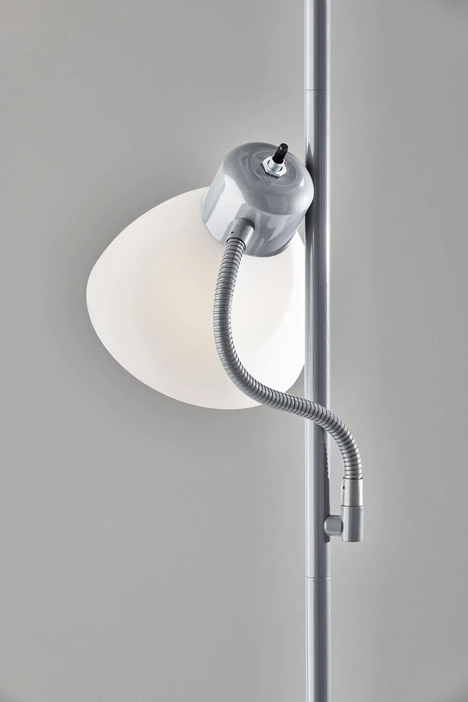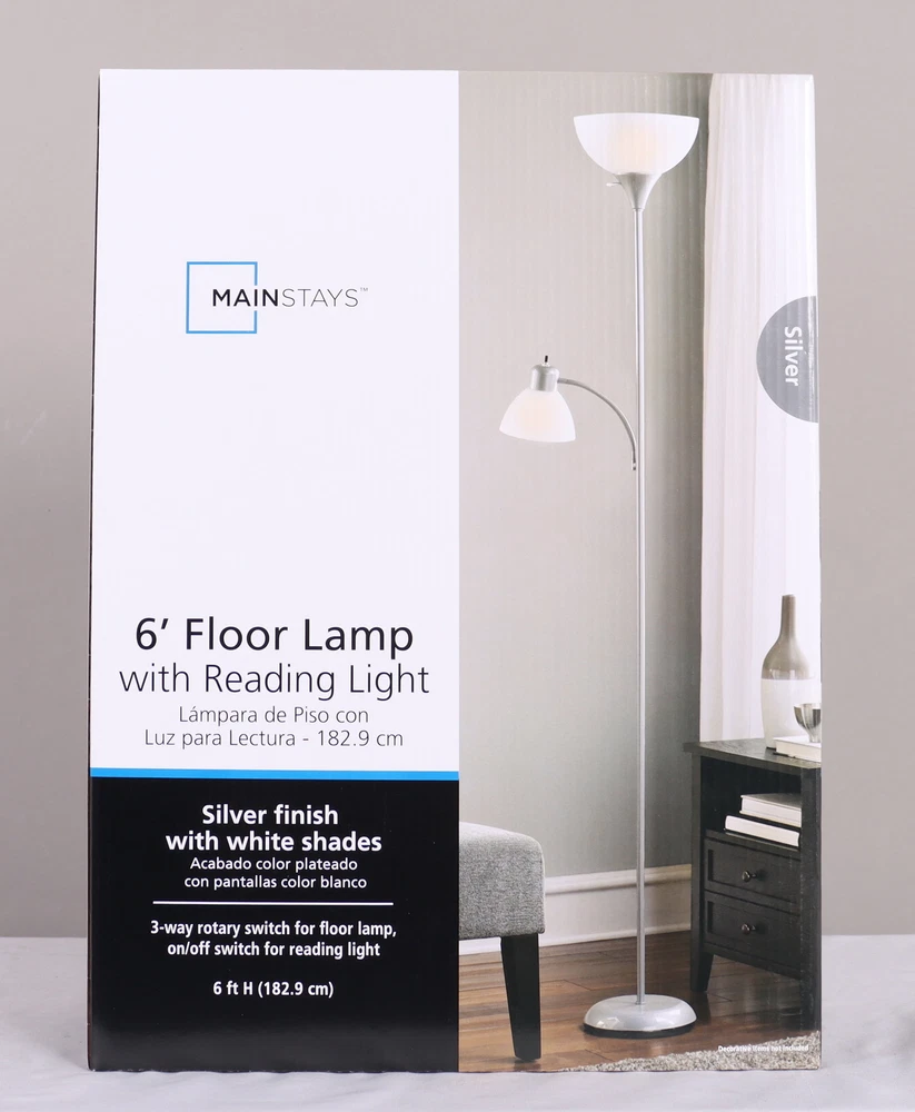 The Mainstays JK1660SLV combination floor lamp is two lamps in one, featuring a 100-watt main lamp with an additional 60-watt reading lamp (light bulbs not included). This sturdy yet slim 72" plastic lamp includes an attached reading lamp with an adjustable gooseneck, two plastic shades for a subtle ambient effect, and a 9" diameter plastic base. The main top light is controlled by a 3-way rotary switch and a simple on/off switch for the bonus reading lamp. The sleek and modern design makes this lamp a perfect addition to any adult living room, bedroom, or adult home office and a must-have for young adult college living spaces. 72" JK1660SLV floor lamp 3-way rotary light for main light source 100W and 60W bulbs required (not included) Additional reading light has a convenient on/off switch Reading light features a flexible arm Plastic shades absorb light intensity as it is needed Available colors black, silver, brown, white Modern finish complements the decor of most living areas Ideal for bedrooms, adult home offices, dens, dorm rooms