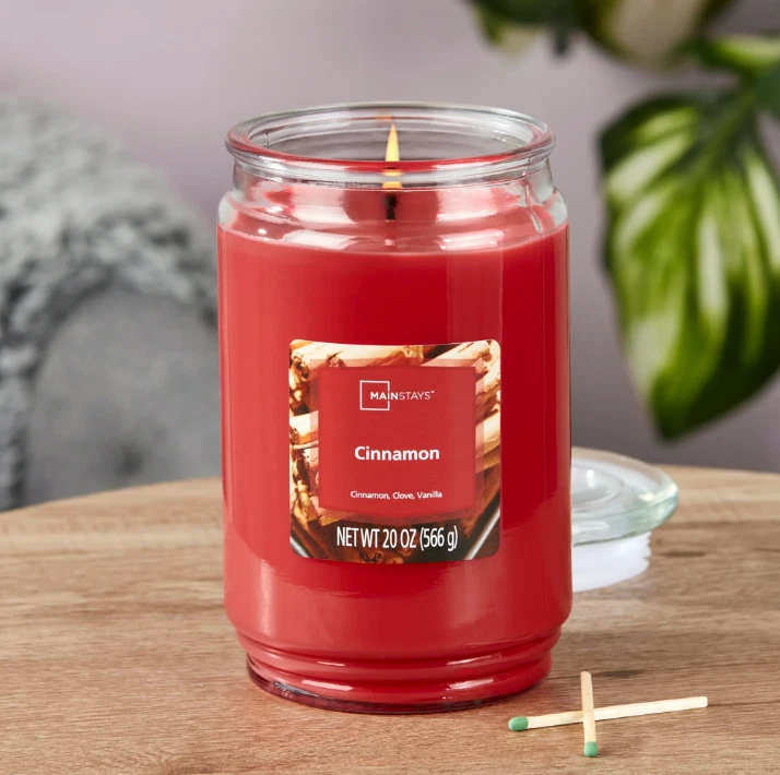 Mainstays Cinnamon Scented Single-Wick Large Glass Jar Candle 20 oz select scent About this item: Mainstays Cinnamon Scented Single-Wick Large Glass Jar Candle, 20 oz. Warm and spicy cinnamon infused with subtle nuances of clove and pure vanilla. Complements virtually any room decor 20 oz. single-wick candle burns for approximately 100-120 hours Features a decorative beveled edge glass vessel Mainstays single-wick scented candles are highly fragranced, and provide a clean and even burn that will fill your home with beautiful and enticing aromas Our candles are made from high quality, non-toxic, clean-burning wax that is specifically developed to hold optimal fragrance loads Our Mainstays 20oz candle is available in a variety of scents Product detail: Introduce a soothing aroma into your living space with the Mainstays Cinnamon Scented Single-Wick Jar Candle. Mainstays scented candles are highly fragranced and provide a clean and even burn that will fill your home with beautiful and enticing seasonal aromas. Place this candle in the kitchen, living room or dining room where you can enjoy it when entertaining guests or anytime you want to relax. Trim the wick periodically to promote even burning. Mainstays offer a wide selection of candle scents to explore and enjoy. Shop all of our Mainstays scents online and in-store. Treat yourself to the enticing scent of the Mainstays Cinnamon Scented Single-Wick Jar Candle.