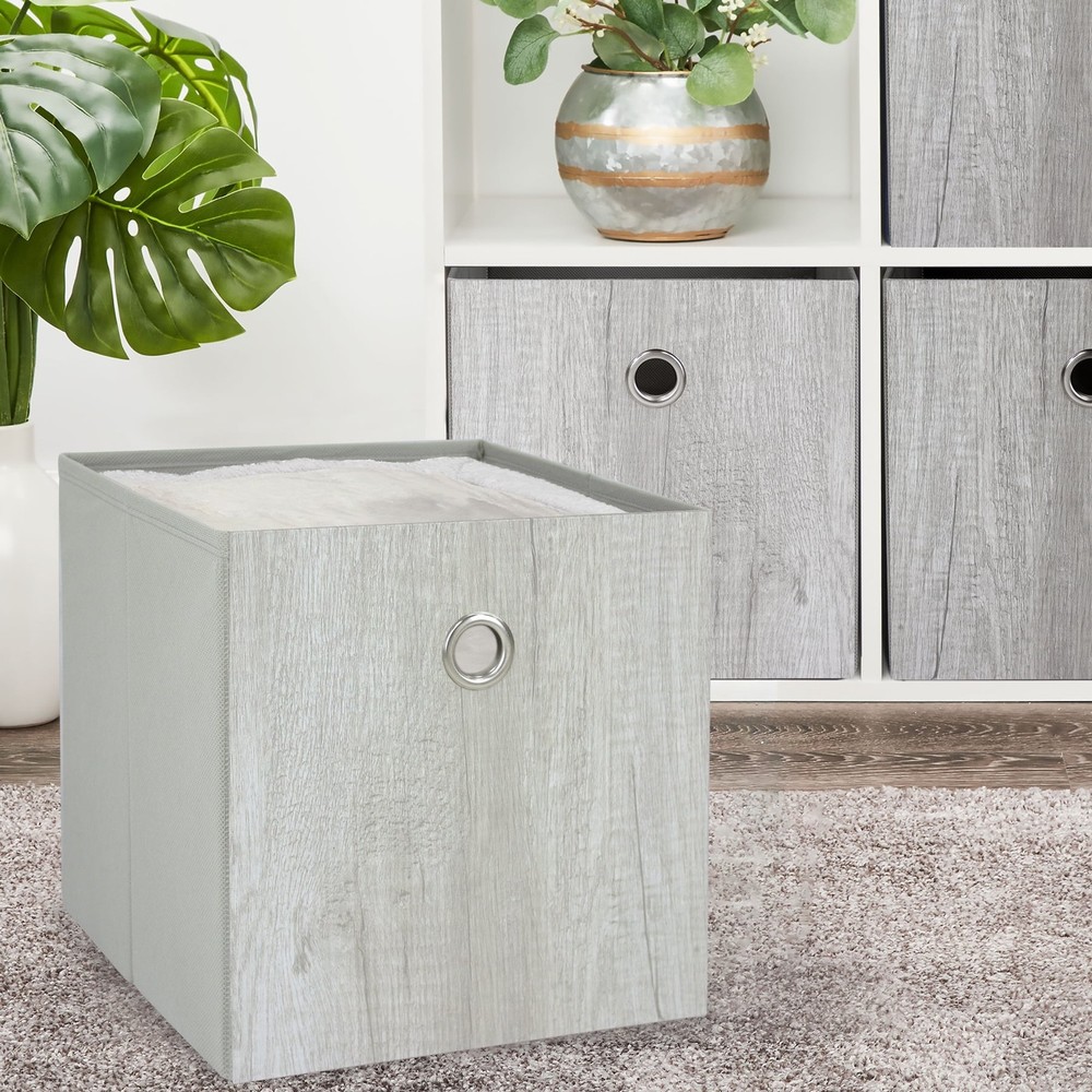 Includes 4 gray wood cube organizer bins Perfect for pairing with your favorite colors and patterns to mix and match Bin features an easy carry handle on the side that makes it easy to take the bin wherever you need to go Can be used with our Mainstays Cube Storage Organizer units or independently Cubes are collapsible when not in use to maximize your space Ideal for storing books or kids and adult clothing in the bedroom, living room, laundry room or dorm rooms Made of durable polyester fabric that won't crease easily, has good abrasion resistance and holds its shape Dimensions: 10.5" L x 10.5" W x 10.75" H (26.5 cm x 26.5 cm x 27.3 cm) Includes 4 gray wood cube organizer bins Perfect for pairing with your favorite colors and patterns to mix and match Bin features an easy carry handle on the side that makes it easy to take the bin wherever you need to go Can be used with our Mainstays Cube Storage Organizer units or independently Cubes are collapsible when not in use to maximize your space Ideal for storing books or kids and adult clothing in the bedroom, living room, laundry room or dorm rooms Made of durable polyester fabric that won't crease easily, has good abrasion resistance and holds its shape Dimensions: 10.5" L x 10.5" W x 10.75" H (26.5 cm x 26.5 cm x 27.3 cm) Our Mainstays Gray Wood Collapsible Fabric Storage Bins are just what you need to help you create an organized home. Perfect for storing kids to adult clothes, books, electronics and more, these bins' 10.5-inch by 10.5-inch by 11-inch size offers plenty of room to keep a wide variety of belongings neatly tucked away, and their sturdy, round metal handle allow you to pull them off shelves and slide them back in with ease. You can utilize our Mainstays Storage Cube's organizational expertise in your living room, bedroom, laundry room, and dorm room. When not in use, you can easily fold the bin down flat and keep it stored away in your closet for later. The fabric storage cubes are made to fit with our Mainstays Cube Storage Organizers (not included) and are designed with a durable polyester fabric that holds their shape. With a variety of colors to choose from, you'll be able to perfectly match your home decor when you get organized with our Mainstays Collapsible Gray Fabric Storage Bins. On Jun 29, 2025 at 20:57:18 PDT, seller added the following information: