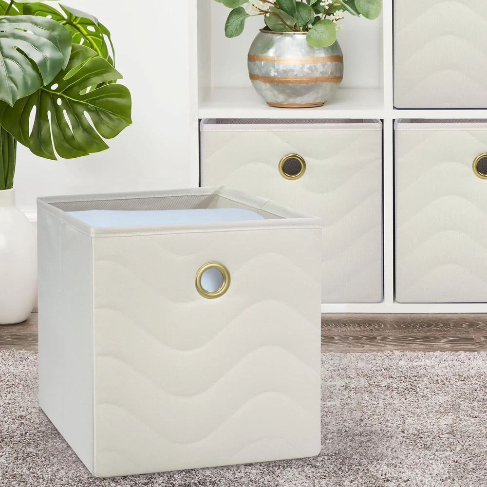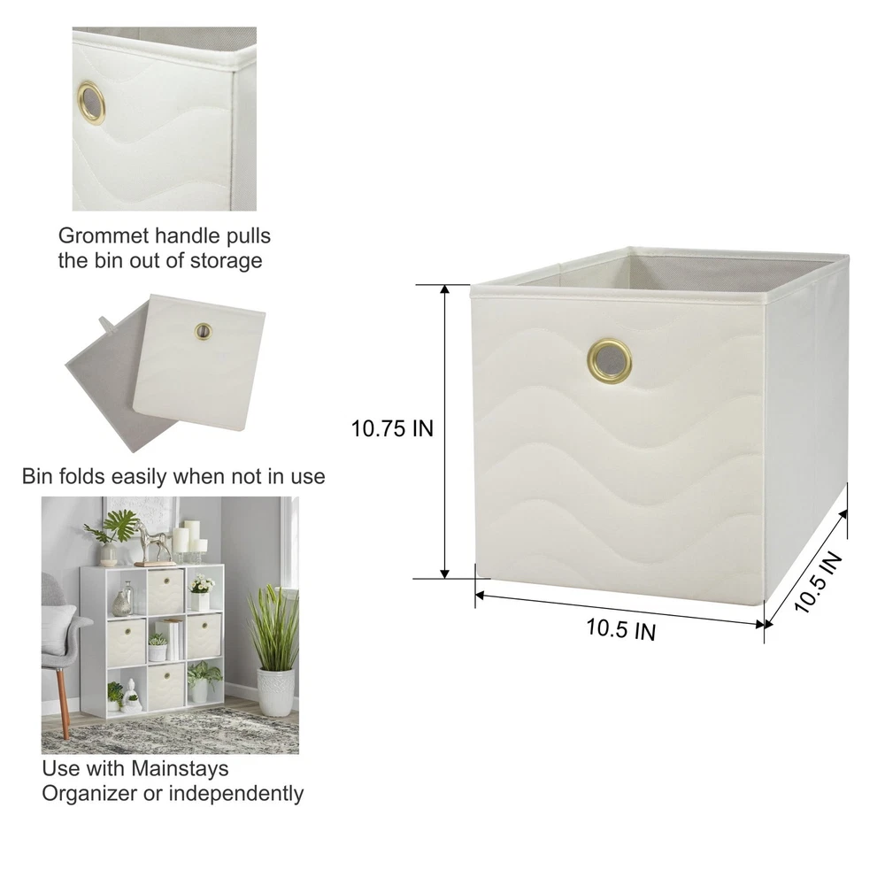 Our Mainstays Grey Flannel Collapsible Fabric Storage Bins are just what you need to help you create an organized home. Perfect for storing kids to adult clothes, books, electronics and more, these bins' 10.5-inch by 10.5-inch by 10.75-inch size offers plenty of room to keep a wide variety of belongings neatly tucked away and their sturdy, round metal handle allows you to pull them off shelves with ease. You can utilize our Mainstays Storage Cube's organizational expertise in your living room, bedroom, laundry room, or dorm room. When not in use, you can easily fold the bin down flat and keep it stored away in your closet for later. The fabric storage cubes are made to fit with our Mainstays Cube Storage Organizers and are designed with a durable polyester fabric that holds their shape. With a variety of colors to choose from, you'll be able to perfectly match your home decor when you get organized with our Mainstays Collapsible Fabric Storage Bins. Helps you to create an organized and comfortable home Includes 4 gray cube organizer bins Perfect for pairing with your favorite colors and patterns to mix and match Bin features an easy carry handle on the side that makes it easy to take the bin wherever you need to go Can be used with our Mainstays Cube Storage Organizer units or independently Cubes are collapsible when not in use to maximize your space Ideal for storing books or kids and adult clothing in the bedroom, living room, laundry room or dorm rooms Made of durable polyester fabric that won't crease easily, has good abrasion resistance and holds its shape Dimensions: 10.5" L x 10.5" W x 10.75" H (26.5 cm x 26.5 cm x 27.3 cm)