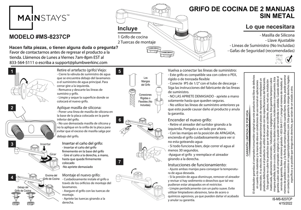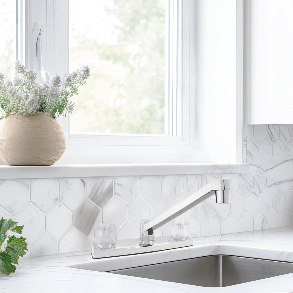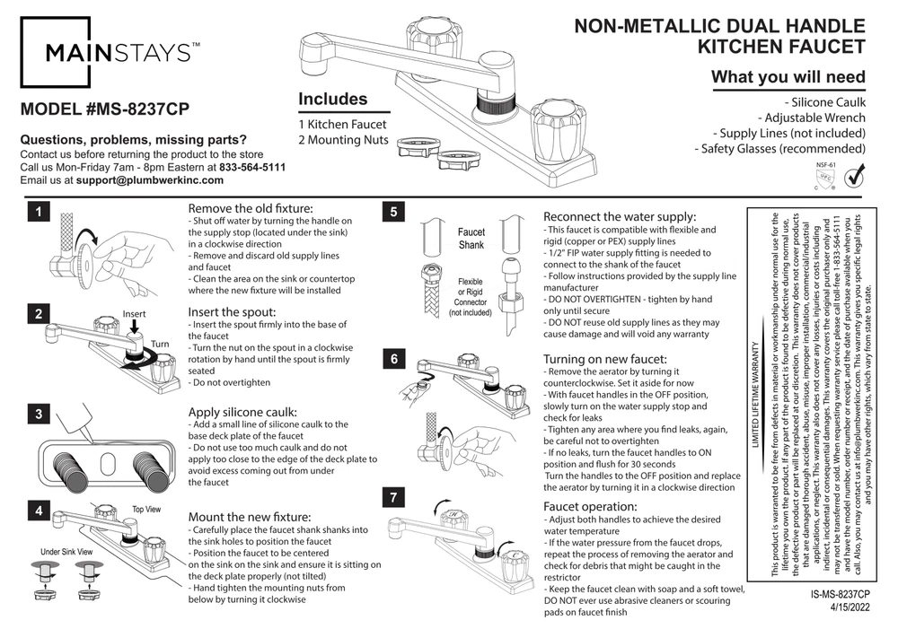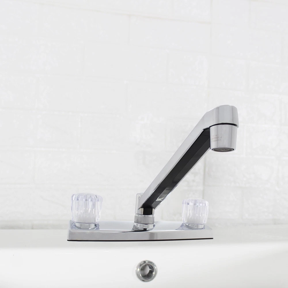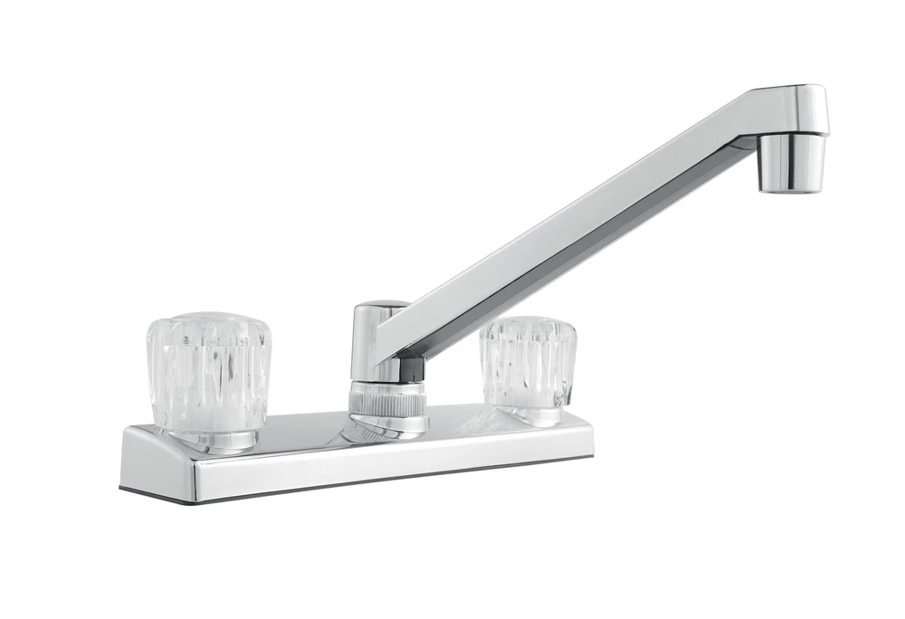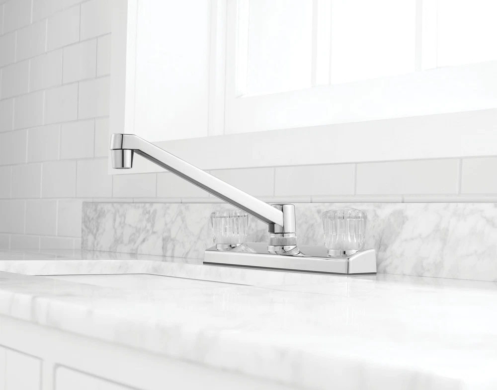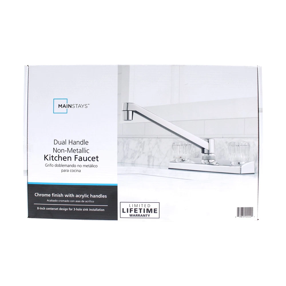 This Mainstays Non Metallic Double Acrylic Handle Kitchen Faucet with Chrome Finish is a simple way to add style to your kitchen. This faucet is made with beautiful acrylic handles, making it easy to fit any kitchen aesthetic. This faucet is designed to be installed in a 3-hole (4-inch centerset) kitchen sink. This faucet is covered by a Limited Lifetime Warranty. Clean periodically, but avoid use of abrasives cleaners, steel wool, or harsh chemicals. Mainstays Non Metallic Double Acrylic Handle Kitchen Faucet Handles: Double acrylic handles Holes for Installation:1 or 3 hole 4-inch installation Kitchen faucet High spout Flow rate (GPM): 1.80 Cartridge Type: Washerless Cartridge Complies with NSF SKU: MS-8237CP