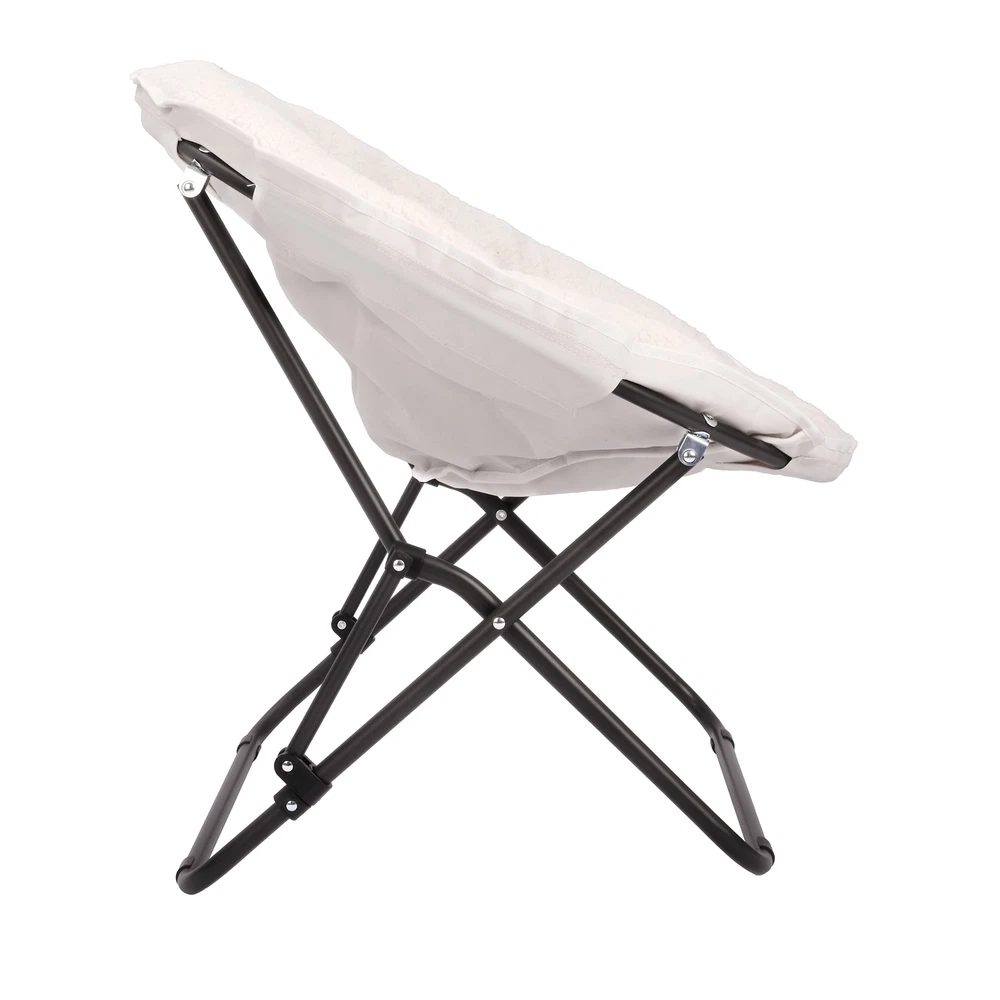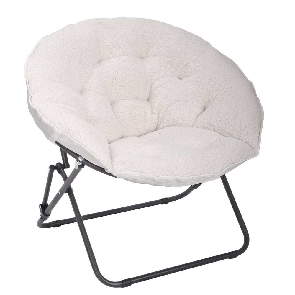 Kick back and relax with the Mainstays Saucer Chair in Sherpa for kids and teens. Decked out in extra soft velvet fabric, this foldable accent chair is the stylish solution for any time, anywhere comfortable seating. This smart folding chair features around, channel-tufted backrest and cushy, wide seat for cocoon-like comfort while sitting. The easy-to-move chair features a simple, foldable design that makes it easy to carry around, perfect for everyday use in small-space dorms or apartment living. Whether you are looking for extra seating in your bedroom, living room, or dining space, this versatile saucer chair will easily become your favorite sitting spot. And when you need extra floor space, this padded folding chair is easy to store. Add convenient comfort and style to any space with the Mainstays Folding Shell pattern Saucer Chair in Teal Velvet. Available in multiple colors: Blush and Teal. Folds for easy storage and transport Portable seat with soft Ivory Sherpa fabric cushion for teens and kids Durable powder-coated steel frame Easy to carry Collapsible for compact storage Chair Care: Spot clean only. Air dry. Do not bleach Overall dimensions: 31in W * 27.95" D * 28.74" H Weight: 11.24 lbs Weight Limit: 225lbs Color: Off-white