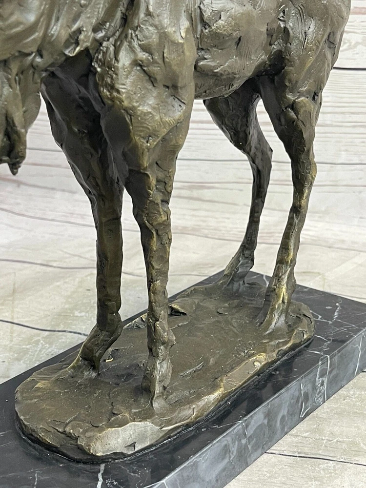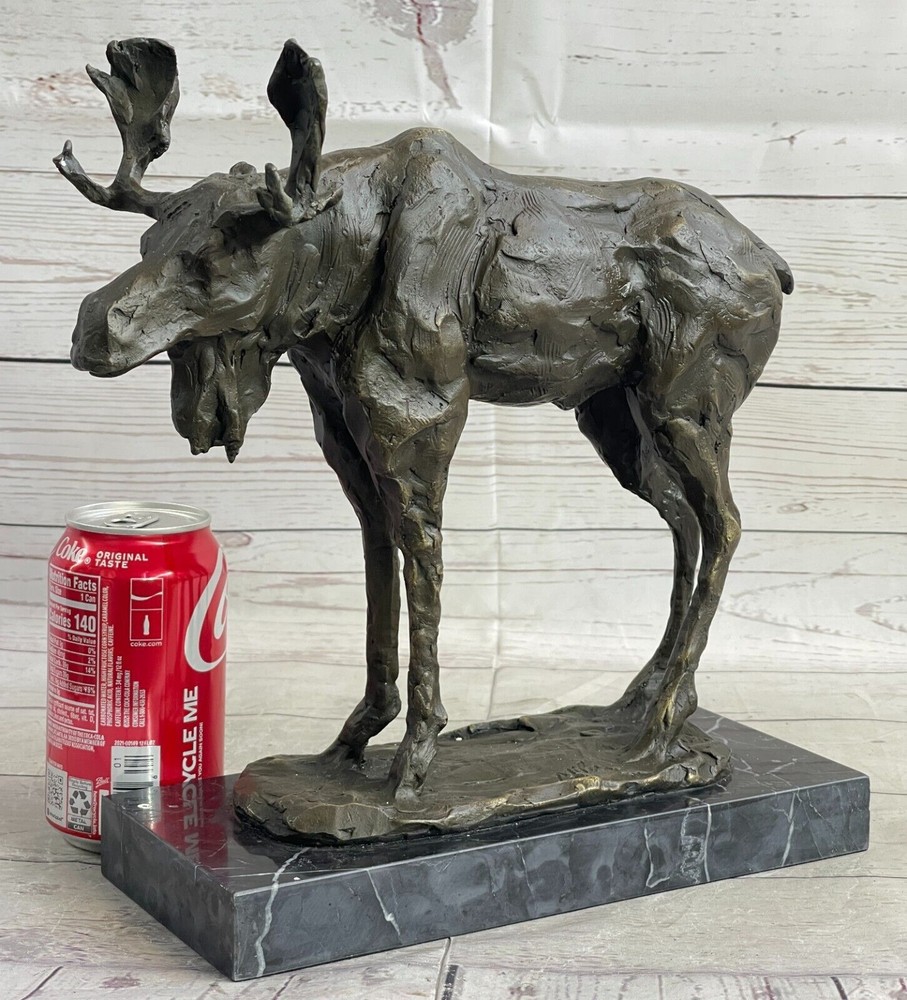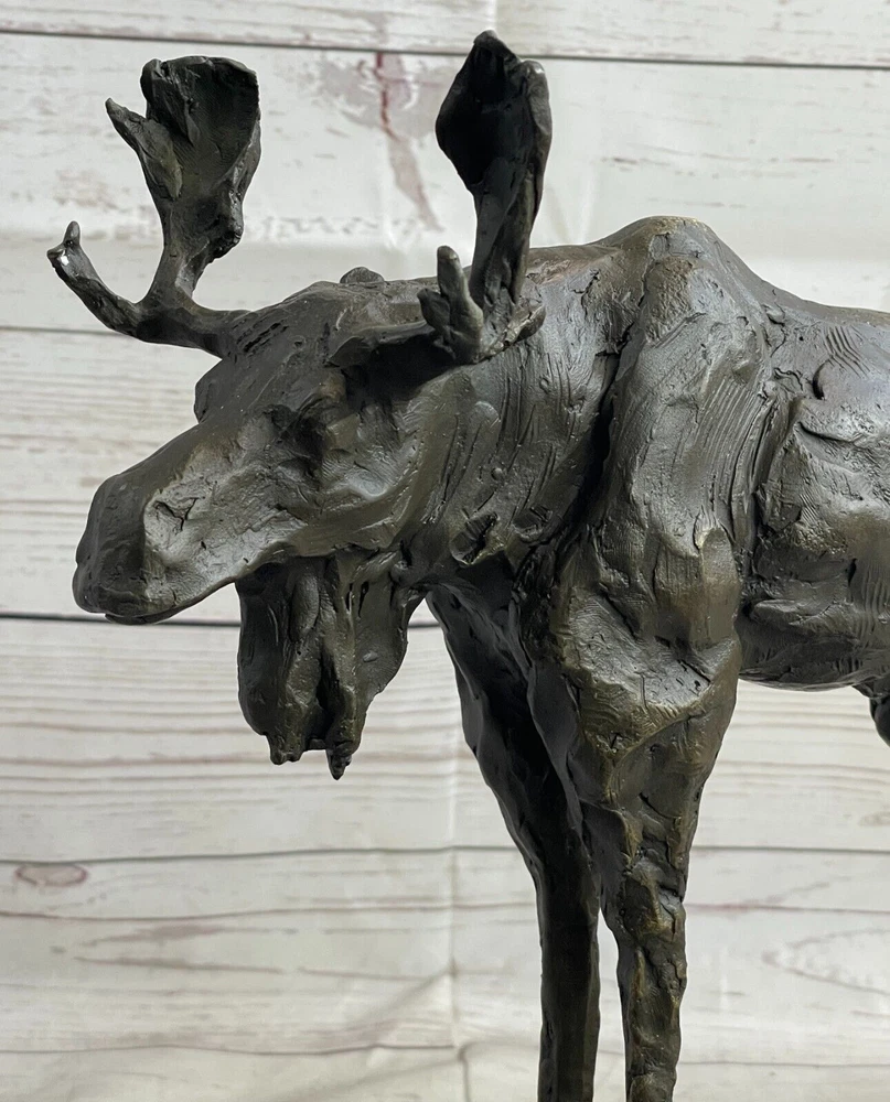Condition : Thisnbsp;sculpture is in perfect condition. Bronze Dimensions with Marble Base: Height 12" X Width 12" Marble Dimensions:10" X 5" Height without base:11" Weight:15 LBS Inventory:54K1666037 Behold the captivating portrayal of the wilderness in the form of a bronze sculpture titled "Majestic Moose." This remarkable piece captures the essence of a male moose in its natural habitat, standing still and vigilant as it surveys its surroundings for signs of predators, sustenance, and perhaps a potential mate. With intricate attention to detail, this sculpture depicts the impressive stature of the moose, which stands as the largest species within the deer family. The moose, known as the North American moose or the Eurasian elk in Europe, is characterized by the distinctive palmate antlers of its males. Solitary by nature, these majestic creatures briefly break their solitude during the mating season, which occurs in September and October. The sculpture elegantly captures the moment of stillness in the deep forest, where the bull moose stands with an aura of majesty, breaking the silence with its resonant grunts that can carry for up to 500 meters. This artwork pays homage to the cultural significance of the moose in Native American lore, symbolizing attributes such as headstrong determination, unstoppable resilience, longevity, and integrity. The abstract and unrefined texture of the sculpture's surface adds a tactile dimension to the artwork, enhancing its visual impact and evoking a sense of connection with the natural world. Crafted using the timeless lost-wax casting method, the bull moose sculpture features a rich brown patina finish that further accentuates its lifelike appearance. Resting upon a black marble base and bearing the signature of the esteemed artist Milo, this sculpture is a tribute to the wilderness and the enduring spirit of the majestic moose. Handmade Bronze Sculpture Statue Moose Musuem Quality Masterpiece Figurine www.bronzhaus.com Video will open in a new window Using the eBay App? Paste link into a browser window: [isdntekvideo]