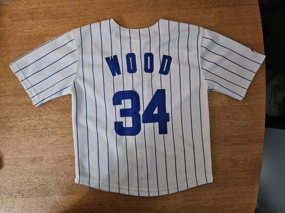 Show your support for the Chicago Cubs with this officially licensed Majestic jersey featuring Kerry Wood's #34. Made for boys in size small, this white jersey is perfect for fans of the Major League Baseball team. The jersey is embroidered with the team's pinstripe design and is perfect for wearing to games or for everyday wear. Don't miss out on the chance to own this piece of fan apparel!