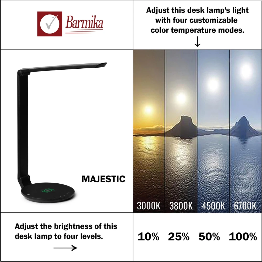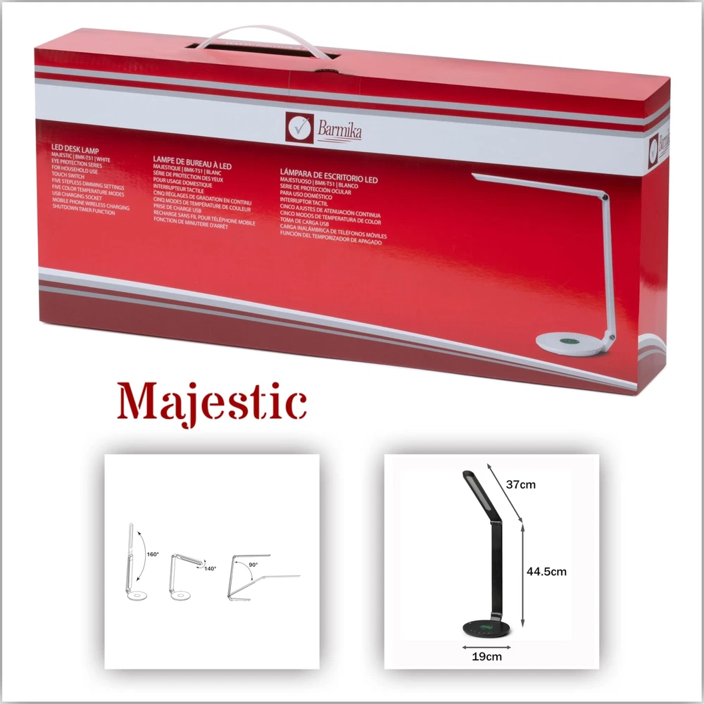 ★ Elegant Design: The Majestic LED Desk Lamp combines refined elegance with advanced functionality, making it a perfect choice for workspaces, home offices, or college dorms. Its sleek, modern design complements any decor, delivering both style and superior performance. Ideal for those seeking a cute and cool table light for work or study. ★ Customizable Illumination: Featuring energy-efficient LED technology, 4 adjustable brightness levels, and 5 color temperature modes, this dimmable LED lamp ensures precise lighting for any activity. The flexible arm allows for optimal positioning, making it ideal for reading, writing, or computer tasks. ★ Eye-Caring Technology: Protect your eyes with advanced flicker-free and glare-free lighting. The Majestic LED Desk Lamp reduces blue light exposure, helping to prevent eye strain and fatigue during long hours of work or study. Perfect for students, ★ USB Charging & Wireless Convenience: Stay connected with the built-in USB charging port and wireless charging pad, ensuring your devices remain powered while you focus on your tasks. ★ Global Compatibility: The included adapter supports 100–240 volts, ensuring reliable performance anywhere in the world. This modern desk lamp is a practical solution for international use. ★ ETL Certified & Guaranteed: The Majestic LED Desk Lamp is ETL certified for safety and reliability. Backed by a 1-year limited warranty, it’s a smart investment for anyone seeking a sleek and versatile lighting solution for home, office, or dorm use.