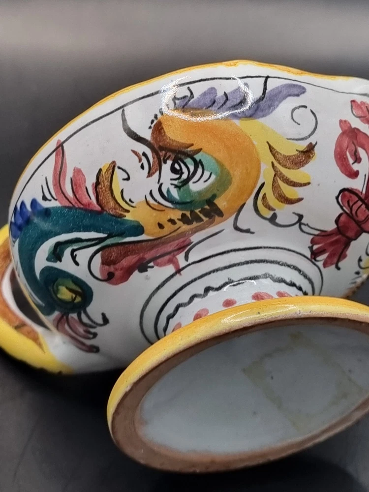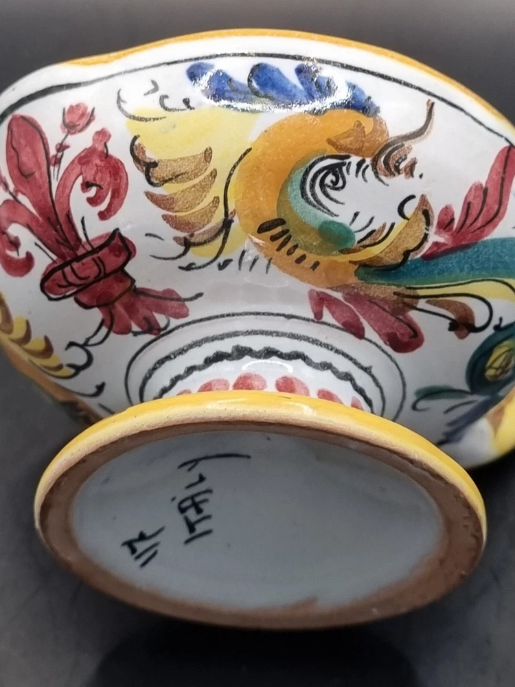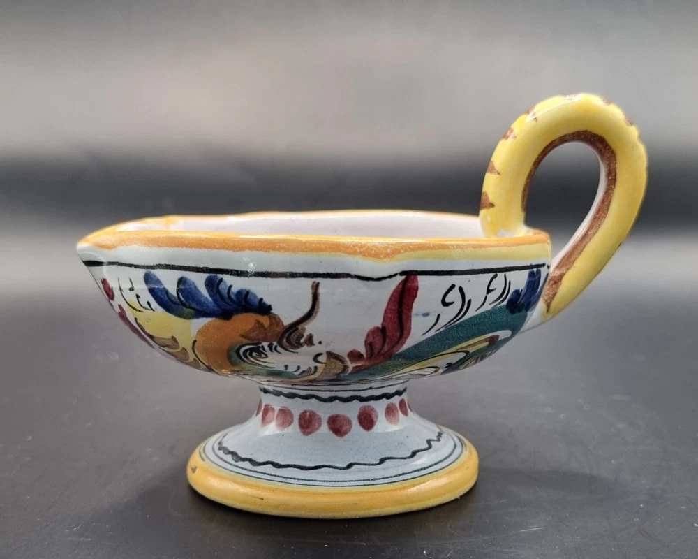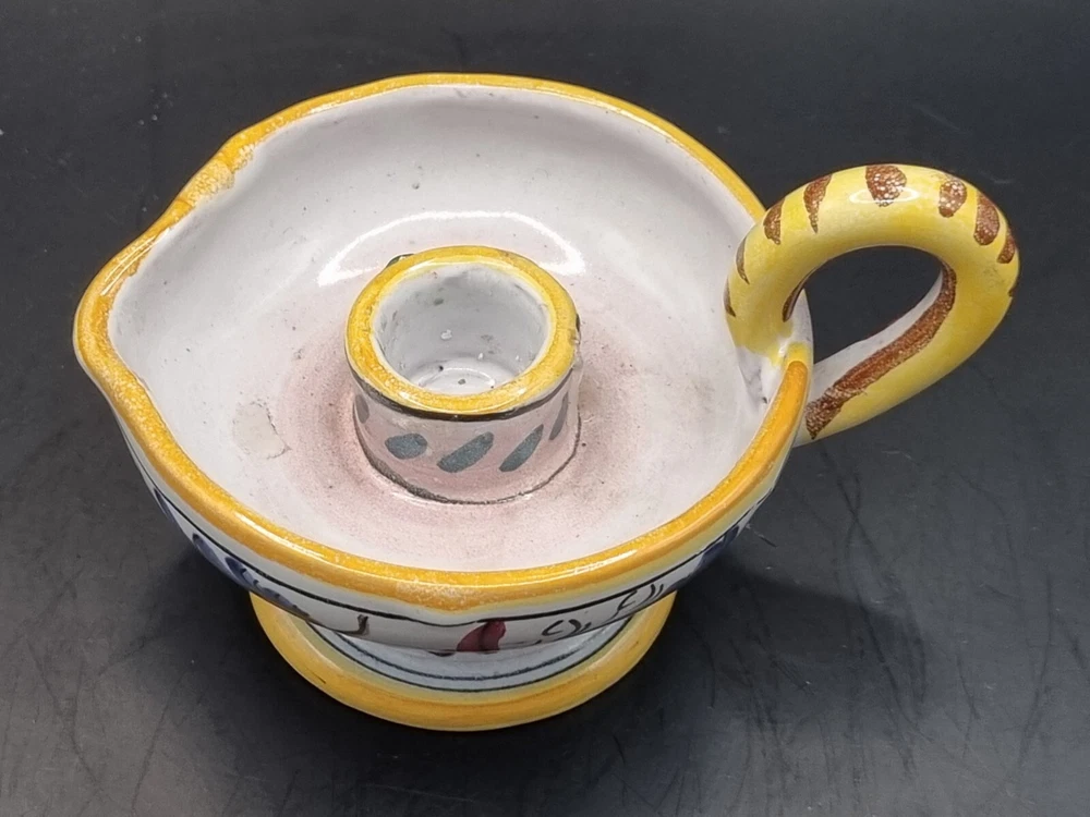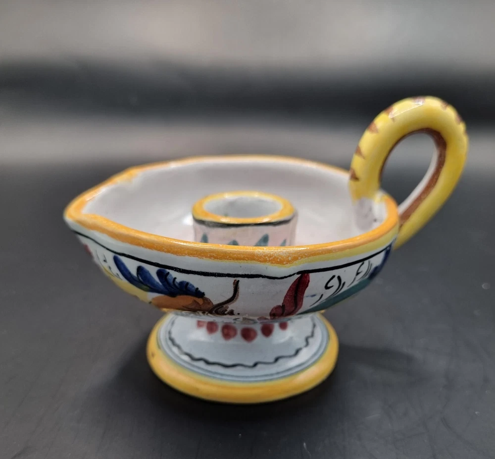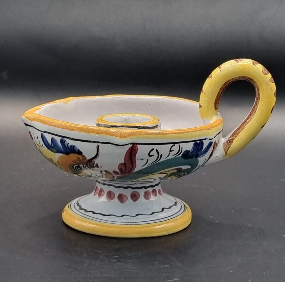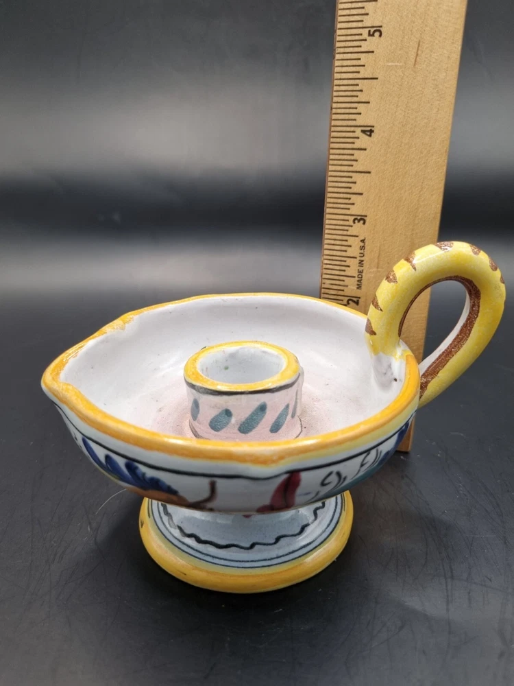 A lovely Majolica candle holder in excellent condition without chips or cracks. Not sure if the design is a rooster or a dragon, but the colors are bright and clear. It is signed just "Italy" but it is very much the style of Deruta pottery. Measurements are in the photos. All measurements are approximate. I do not accept returns, so please message me with questions or for more pictures. Shipping is continental U.S. only. Before leaving negative or neutral feedback, please contact me. I strive to be painfully accurate with my descriptions and photos, and I am happy to answer questions or provide more photos before you purchase something. Thank you for looking ❤️ and be sure to check out my other listings. While I have just started selling on eBay, I have been buying on eBay for years 😊 and am an experienced Etsy seller. My Etsy store (12HoursofDarkness) has 5 stars and over 300 sales.