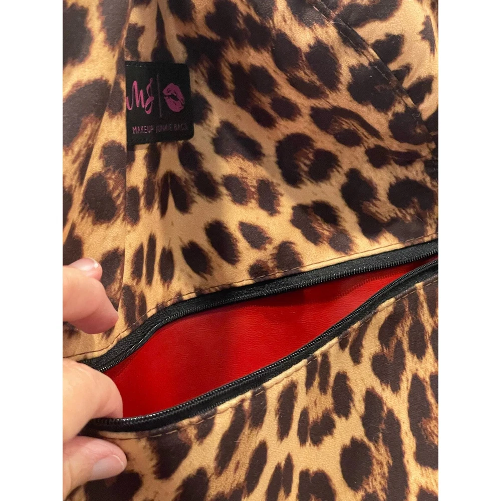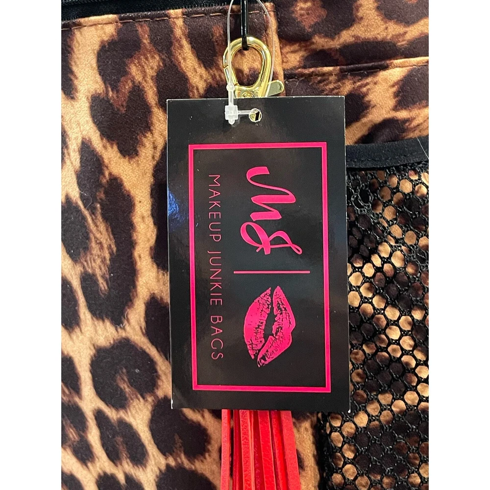 The Hard to Find , New with Tags, Exotica Backpack by Makeup Junkie has a soft cheetah exterior with a red wipeable interior. This handcrafted Backpack comes with a coordinating removeable tassel (red) and a designer, moisture resistant, interior liner. If you aren't familiar with this women owned brand please check them out. the bags are designed and handmade in Conroe Texas. this one is the Medium Everyday Carry with Dimensions of: 15" long, 10".5 Wide x 5" Roomy exterior zippered pocket on the front, Interior has one large roomy pocket with a slip pocket perfect for your electronics. Side mesh pockets hold your cup or drink bottle and soft comfortable straps help ensure this beautiful bag is comfortable to wear.