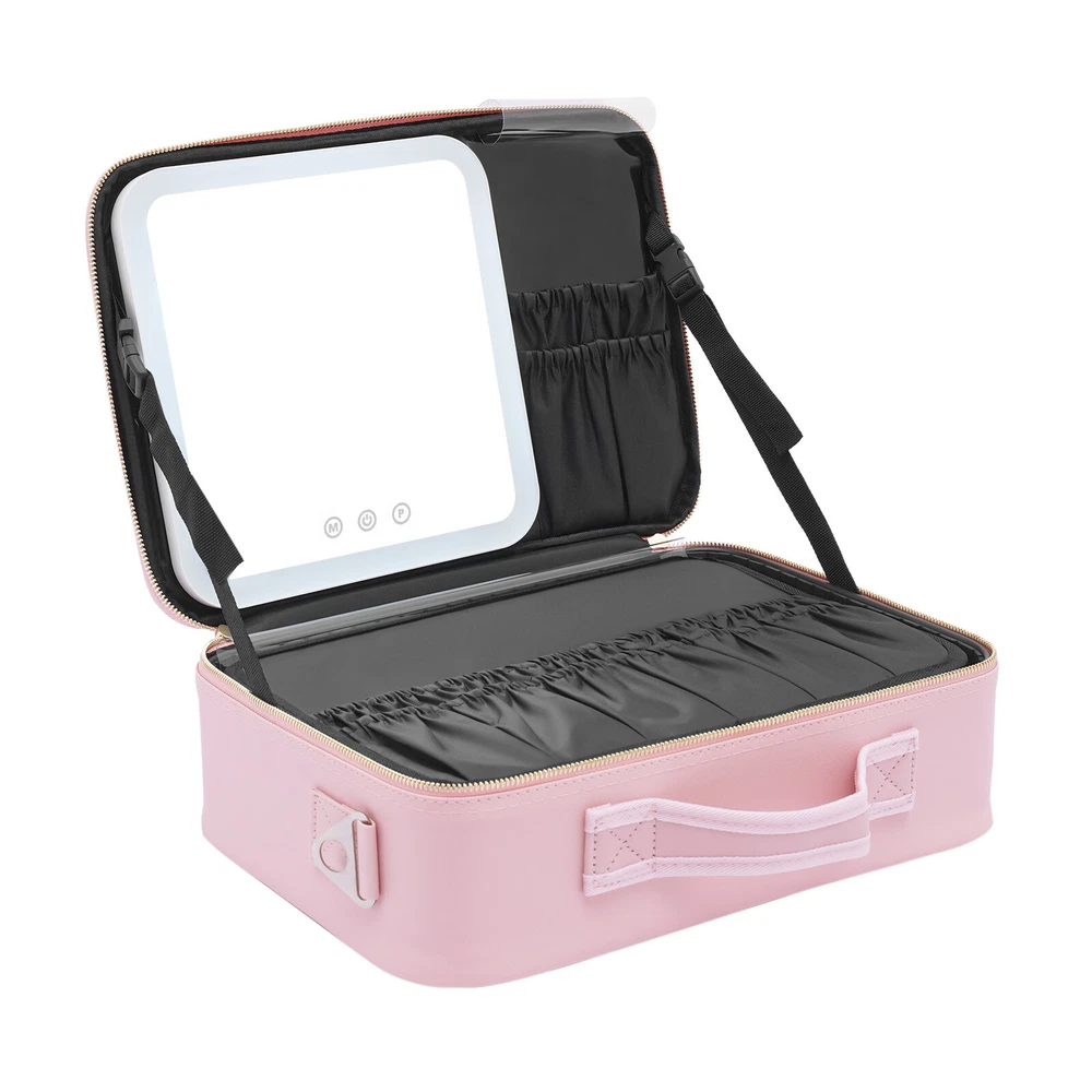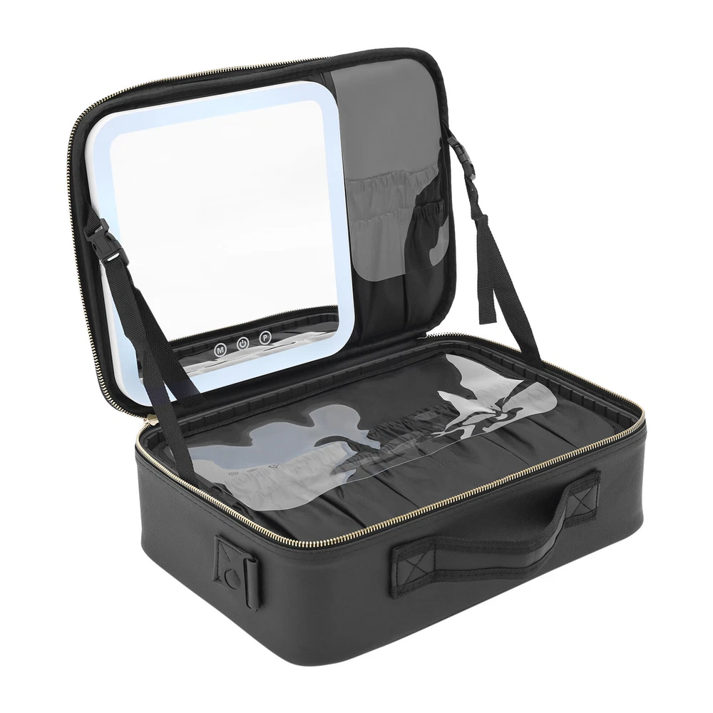 Makeup Bag with Mirror w/ Lights Settings Cosmetic Bag,Travel Makeup Train Case Makeup Bag w/ Mirror & Lights 3 Color Settings Travel Makeup Train Case Cosmetic Bag Organizer Portable Artist Storage Bag with Adjustable Dividers Description Makeup Bag with Mirror and Lights This makeup bag with mirror and lights can be used for both cosmetics storage and makeup. The high-definition illuminated makeup mirror can help you complete all kinds of makeup effects, meet all kinds of needs of your daily commuter makeup or delicate evening makeup, and let you complete a magnificent transformation! Key Features Must-have When Travel: The large capacity of 2000 mAh and the type-c interface leave you away from the problem of batteries running down. And built-in high-definition cosmetic mirror can let you quickly complete your makeup needs during the journey. Three Color Lighting: The professional large makeup bag with a mirror provides three color lighting modes. You can touch the middle button control switch or press and hold the button P to adjust the light brightness or touch the button M to change the light colors to create a more suitable makeup environment. 4K Large Mirror: The makeup mirror included in this makeup bag is a 4k large mirror with the size of 9.3*9.4in, which can restore details with 1:1 high fidelity, simulate the daily commute lighting environment, and restore your makeup effect under natural light. Freely Adjust: You can freely adjust the position of the partition according to the volume and shape of your cosmetics to keep the internal cosmetics in order at all times. Thoughtful Design: The makeup brush storage areas can store the makeup brush, clearly showing the type of brush, and protecting the mirror. It is covered with film so the makeup residue can be cleaned with a gentle wipe. Stylish and Exquisite: This makeup bag has classic and versatile black color and its exquisite appearance is so stylish that you can't help but fall in love with it Quality Assurance: This makeup bag uses high-quality PU, which is of high quality and durable. In addition, its partition is made of EVA and wood, which is not easy to break. What's more, the zipper made of alloy is waterproof, anti-corrosion, and also does not easy to lose color. Easy to Carry: This makeup bag unlocks more ways of carrying. The shoulder strap design and the pull rod pocket design allow you to carry it on shoulder or on the luggage rod, just to give you a better and more comfortable travel experience. Ready to Use: It has a one-piece design without the need for installation. You can use it directly when you receive it, which is very convenient. Details Supporting Strings: There are two strings to keep the makeup bag open and facilitate your daily use. Double Zipper Design: The double zipper design of this cosmetic bag makes it easy for you to open and get cosmetics. Application This makeup bag can be used as a desktop organizer and makeup organizer, and can also store all kinds of cosmetics, nail polish, nail scissors, paper towels, and other daily appliances . Specification Material: PU, Glass, EVA, Wood, Fabric Color: Pink/Black Shape: Rectangular Light Colors: Cold Light, Natural Light, Warm Light Cold Light Color Temperature: 5300K Natural Light Color Temperature: 4300K Warm Light Color Temperature: 3600K Rated Input Voltage: 5V Battery Capacity: 2000mAH Mirror Size: 24.5*26cm/9.6*10.2in Cosmetic Brush Storage Board Size: 34*23.5cm/13.4*9.3in Product Size: 38*27*12cm/15*10.6*4.7in Package Size: 40*29*14cm/41.3*14.2*9.8in Net Weight: 1.5kg/3.3lbs Gross Weight: 2kg/4.4 lbs Package Included 1* Makeup Bag with Mirror and Lights 1* Charging Cable 1* S houlder Strap Payment Delivery details Terms of sales About us Contact us Payment We accept ebay payment 。 Fees such as import duties, taxes are not included in the item price or shipping costs. These charges are the buyer's responsibility. Delivery details Shipping: 2-9 working days to: USA Terms of sales We maintain high standards of excellence and strive for hundred percent customer satisfaction. Feedback is very important to us. We hope that you contact us immediately before you give neutral or negative feedback, so that we can address your concerns. It is impossible to address issues if we do not know about them! About us Your satis faction is our ultimate goal. We work hard to earn your trust and future business. Our certified technicians have tested each item before shipping. The unit comes with 1 year limited warranty on all manufacturing defects. a) If you receive a defective item, you may return it or ask for a discount. Please contact us within 14 days after you receive the package. b) What you returned must be intact and in its original packaging as re? u. Customer is responsible for shipping costs of the returned item. c) We will cover the cost of shipping back t with the shipping rate indicated in the registration page. We will send you a new unit or refund the full payment you paid. Thank you. Contact us Business Hour Business Hour: Monday To Friday: 8:30 AM to 5:00 PM (Beijing China time) Due to time zones, our reply to your questions may not be immediately. But within above working time, we will reply your email within 24 hours. If it's non-workdays, please kindly be patient and wait till Monday. Please contact us with ebay message. Please feel free to contact us if you have any questions. Monday To Friday: 8:30 AM to 5:00 PM (Beijing China time) Due to time zones, our reply to your questions may not be immediately. But within above working time, we will reply your email within 24 hours. If it's non-workdays, please kindly be patient and wait till Monday. Please contact us with ebay message. Please feel free to contact us if you have any questions.