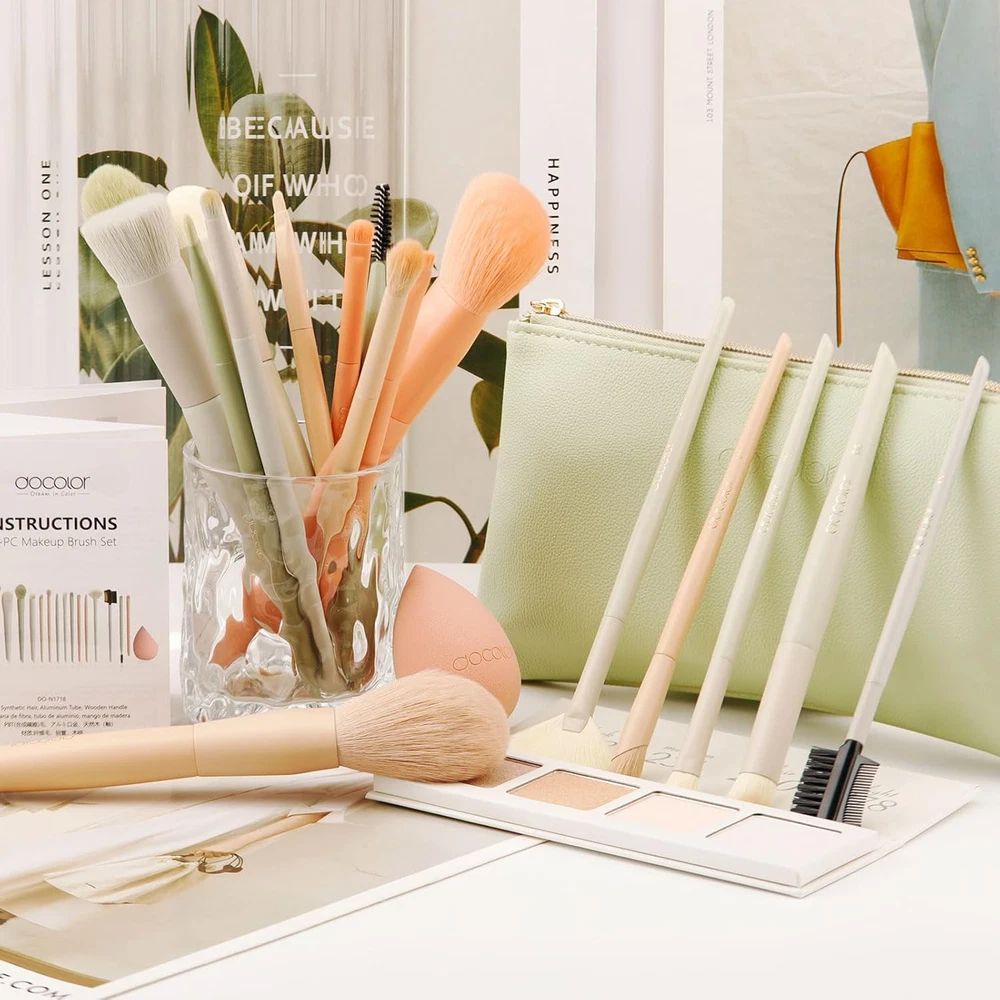 ❤️Docolor Premium Gift Set: Having all of the right makeup brushes and tools when doing your makeup is vital, so Docolor introduced this professional makeup brush set will help you transform your makeup routine. This makeup brushes set includes 17Pcs different function makeup brushes and 3 FREE bonus items: makeup sponge, travel bags and brush protector. ❤️PREMIUM MATERIALS: Designed and handcrafted by our industry experts, this brush set features fiber synthetic bristles, 100 % vegan, that are cruelty-free, fluffy, soft, and hypoallergenic, making them perfect for sensitive skin. High-density fiber bristles reduce shedding and ensure maximum brush life. The handle is made of lightweight birch wood, which is durable, ergonomically designed, and has a non-slip grip to ensure you apply makeup accurately every time. ❤️Premium and luxurious cosmetic bag: Our makeup brush set comes with a luxurious bag that is easy to carry and store. The cosmetic bag can conveniently protect, store and sort all brushes without worrying about damage, deformation or loss. Very suitable for carrying out and traveling. ❤️Upgraded Docolor 17-piece makeup brush set: Every blending brush for makeup in this Docolor face and eye brush set is numbered and comes with a full brush guide explaining exactly how to use every tool in this complete makeup brush set, Suitable for makeup professionals and beginners. ❤️Gift for makeup lovers: This makeup brush kit is charming and lovely. Designed with special color showing romance and sweet elements, Beautiful gift packaging and colorful products are absolutely a perfect gift to your loved ones, family and friends on any occasion like valentine's day, birthday, christmas or any other festival. Product Description Docolor 17PCS Professional Makeup Brush Set Morandi This 17PCS Docolor brush set will help you to create both natural and colorful makeup looks. The shapes of the brushes are designed to perfectly fit every face! With these brushes, you can do amazing smokey eyes, foxy eyes, cut crease, Kim K contouring, and more! The video showcases the product in use. The video guides you through product setup. The video compares multiple products. The video shows the product being unpacked. hero-video Merchant Video Morandi Green Makeup Bag - A Case for You to Carry, and Great for Travel Other products Material Wood + Synthetic Hair Material Wood + Synthetic Hair Material Silicone Package Exquisite gift box Package Exquisite gift box Package Exquisite gift box