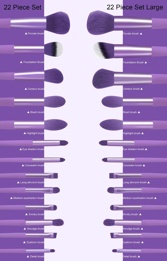 We have made combination Kit to meet various makeup needs.Make your makeup more convenient,Every beauty lovers should have a makeup kit such like this!!! Note: This set have sizes(22 Piece Set and 22 Piece Set Large). their differences see picture 4. The Regular brushes are suitable for beginners, The Large brushes are more suitable for professionals Please confirm your size before placing an order. Tips: If the logistics squeeze or packaging causes the bristles of the brush crooked, you can wash it and then use a hair dryer to straighten the bristles, so that the bristles will return to straight and even become more fluffy and good looking! Makeup Brushes Set : We've designed a comprehensive makeup combination kit that caters to diverse beauty requirements, enhancing the convenience of your makeup routine. Every beauty aficionado deserves to own a kit like this! Comprehensive Makeup Brush Set : This set includes 13 makeup brushes and a storage bag. In addition, we also prepare a silicone face-pack brush, a sponge egg set, and silicone lip brush, a brush cleaning egg, and a silicone cleansing brush. This set is a good choice for beauty lovers. Soft and comfortable bristles : The bristles of our makeup brush set are made of high-quality fiber hair. The bristles are rich, soft and fluffy, and will not fall off easily. They can better grasp the and spread evenly on the face, which not only makes your makeup more natural, but also gentle and non-irritating to the skin. Rugged handle : The makeup brush set is made of sturdy materials, which will not break easily when used in daily life. The handle is designed to fit the palm of the hand and is ergonomically designed, and it will not fall easily when using it. Multifunctional use : Each product in our makeup brush set is very practical. It can not only meet your makeup needs for eyes, cheeks, and lips, but also apply to a variety of cosmetics, including foundation, BB cream, , concealer, isolation liquid, and can be used for a long time.
