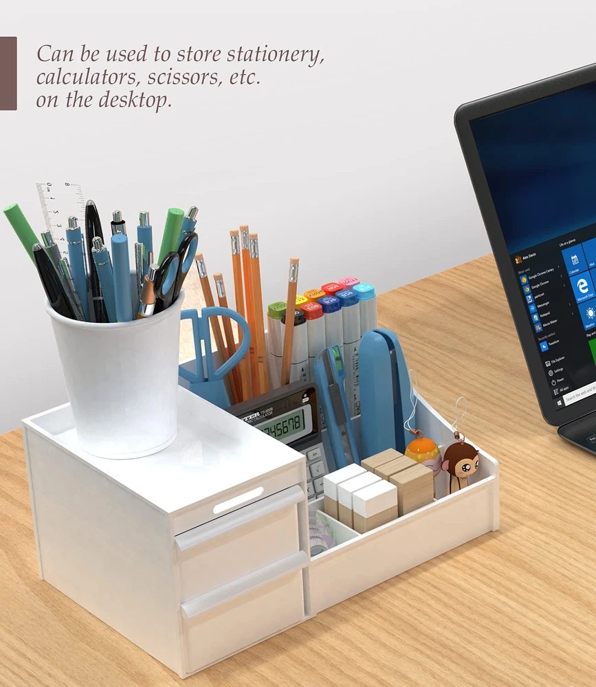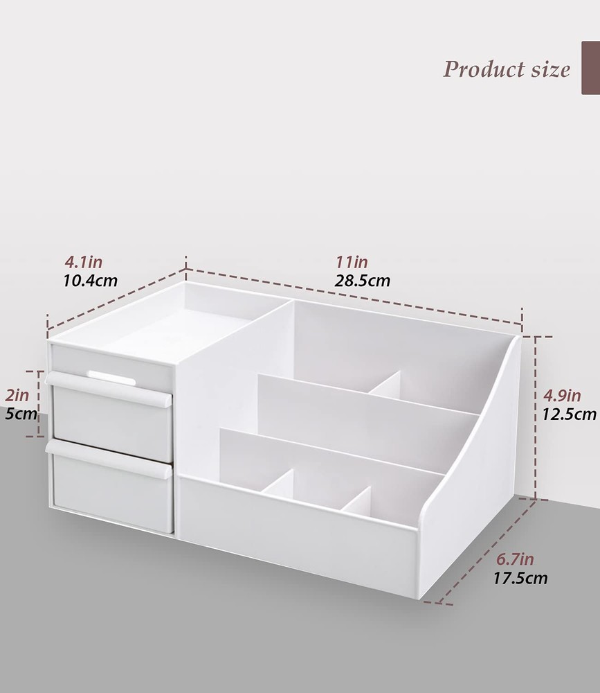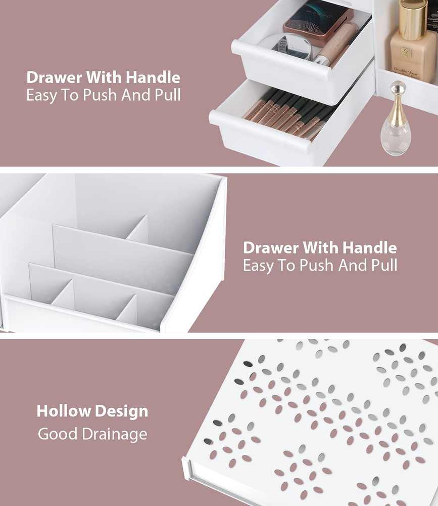 STYLISH APPEARANCE DESIGN - Clean, elegant lines and curves make this a beautiful addition to your dresser top. It will look great wherever it is placed. DEEP DRAWERS - Our makeup organizer is built with deep drawers that slide out easily to keep your items tidy. PERFECT STRUCTURE - Multiple shelves, compartments and drawers make this the perfect sized makeup drawer for all your lotions, cosmetics and jewelry. Also makes a great organizer for cosmetics, office supplies, school supplies and other sundries. EASY TO CLEAN - Completely waterproof and washable, with small holes underneath and superior drainage. A SPECIAL GIFT - Give something you like to someone you like.