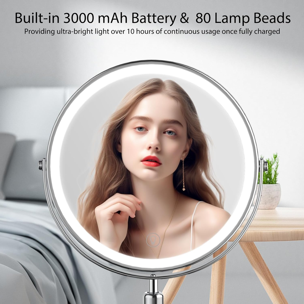 14''-17'' Height Adjustable and 360° Rotatable For Most people:Our makeup mirror is perfect for use in your home. It features adjustable height ranging from 14'' to 17'', allowing you to customize it to fit your dresser or vanity height. The 360° rotatable design ensures you can find the perfect angle with ease. Ideal for both men and women. 80 Lamp Beads and Built-in 3000 mAh Battery:The LED makeup mirror is equipped with 80 lamp beads that deliver ultra-bright light. This mirror not only enhances natural light during the day, but also provides ample illumination in darker settings at night. Additionally, the mirror features a built-in 3000 mAh rechargeable battery that provides over 10 hours of continuous usage once fully charged. 1X/10X Magnifying Double Side:With 1X/10X magnification, the classic dual-sided design of lighted makeup mirror with magnification makes achieving a flawless makeup look a breeze. Both sides are perfect for makeup application as well as detailed tasks such as wearing contact lenses, shaping eyebrows, shaving, styling hair, facial treatments, and applying mascara. 3 Color Lights and Stepless Brightness:This makeup mirror with lights offers natural light, warm light, cold light, and adjustable brightness to ensure soft, uniform illumination that reaches every corner of your face. Simply tap the sensor switch to switch between light colors and hold it down to adjust the brightness level, catering to your specific needs in various settings. Great Gifts and Quality Assurance:Whether you're looking for the perfect present for Mother's Day, Valentine's Day, birthdays, or Christmas, our vanity mirror with lights is a fantastic gift option for the important women in your life, such as girlfriends and family members.And we offer 1-year quality assurance, if you have any questions in use, please contact us. Product Description 360° Rotatable Mirror Designed with 360° rotation, makeup mirror with lights can be freely adjusted to any angle, making it clearer and easier to check your makeup or skincare. Meet different lighting Needs This makeup mirror with lights offers natural light, warm light, cold light, and adjustable brightness to ensure soft, uniform illumination that reaches every corner of your face. Supper Bright Light and Last Long This makeup mirror built-in 3000 mAh battery with 80 lamp beads that deliver ultra-bright light. It provides over 10 hours of continuous usage once fully charged.