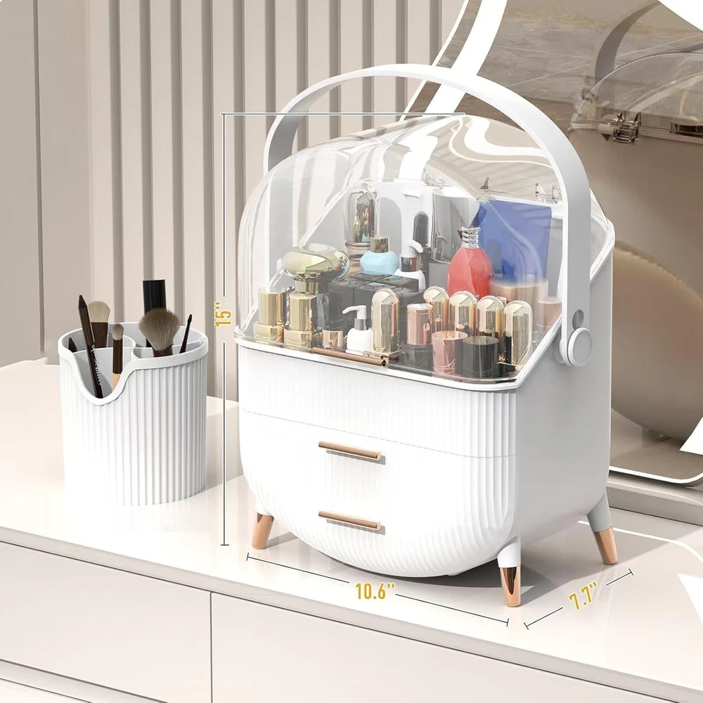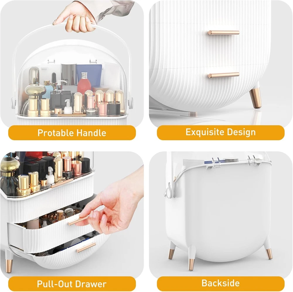 Makeup Organizer Countertop and Storage for Bathroom Vanity, Portable White Description Features: LARGE CAPACITY: Sansixzero Large Makeup Organizer (11"×7"×14") features 2 storage drawers and 1 large top compartment, you can put all the tall bottles like lotions, essences, sprays, foundation into the top layer. The second layer well for placing your beauty cosmetics, like eyeshadow, blush, setting powder, bronzer, highlight, etc. NEAT AND SPACE-SAVING: Sansixzero makeup box provides ample space for both skincare and cosmetics, helping you organize your essentials while protecting them from dust. Keep your countertop clutter-free and save valuable space in your vanity or bathroom cabinet. Ideal for vanity, bedroom and bathroom countertop. DURABLE AND PORTABLE: Crafted from high-quality, eco-friendly ABS and PP plastic, makes the cosmetic organizer more sturdy and long-lasting than other one. The portable handle allows you to move your makeup essentials to any desired location, convenient for travel. CUTE DESIGN: The attractive color and stylish design make it a lovely addition to any vanity. The skincare organizer features brush slots, makeup compartments, and extra stackable space. DUSTPROOF & WATERPROOF: This makeup storage box comes with a clear lid, which can protect your skin care, cosmetics from water and dust, and very easy to clean. Product Details: Specific Uses For Product: Jewelry, Cosmetics Material: Plastic, Acrylic Special Feature: Portable, Lightweight, Dustproof, Rust Resistant Color: White Brand: Sansixzero Finish Type: Lacquered Product Dimensions: 7.7"D x 10.6"W x 15"H Number of Items: 1 Manufacturer: Sansixzero Item Weight: 3 pounds Item model number: Makeup Organizer Finish: Lacquered Pattern: Solid Special Features: Portable, Lightweight, Dustproof, Rust Resistant Included Components: Makeup Organizer Batteries Required?: No Specific Uses For Product: Jewelry, Cosmetics Material: Plastic, Acrylic Special Feature: Portable, Lightweight, Dustproof, Rust Resistant Color: White Brand: Sansixzero Finish Type: Lacquered Product Dimensions: 7.7"D x 10.6"W x 15"H Number of Items: 1 Manufacturer: Sansixzero Mounting TypeItem Weight: Tabletop Mount3 Pounds Handling We will ship all orders within 3 business day of payment. Delivery We take pride in offering fast and reliable delivery for your orders! We are committed to getting your products to you as quickly as possible. Generally, we would like to inform you that all orders will be delivered to you within 1-3 business days after processing.However, in some cases, delivery times may vary depending on the buyer's location. Especially in remote or rural areas, the expected delivery time may be extended. In such situations, we do our best to ensure that your order reaches you as quickly as possible.If there are any delays, we will be happy to contact you to explain the situation. Our goal is to enhance your satisfaction with our fast delivery times. We work diligently to ensure that your order arrives safely.Trust us and enjoy our speedy delivery! Return Policy All items qualify for returns within 30 days of receipt. Buyer is responsible for return shipping on any item that is not damaged. Feedback We take our reputation seriously, we buy and sell online, so we understand the value of trust. If you are unsatisfied with your order, please contact us and we will work with you to resolve it to your satisfaction.