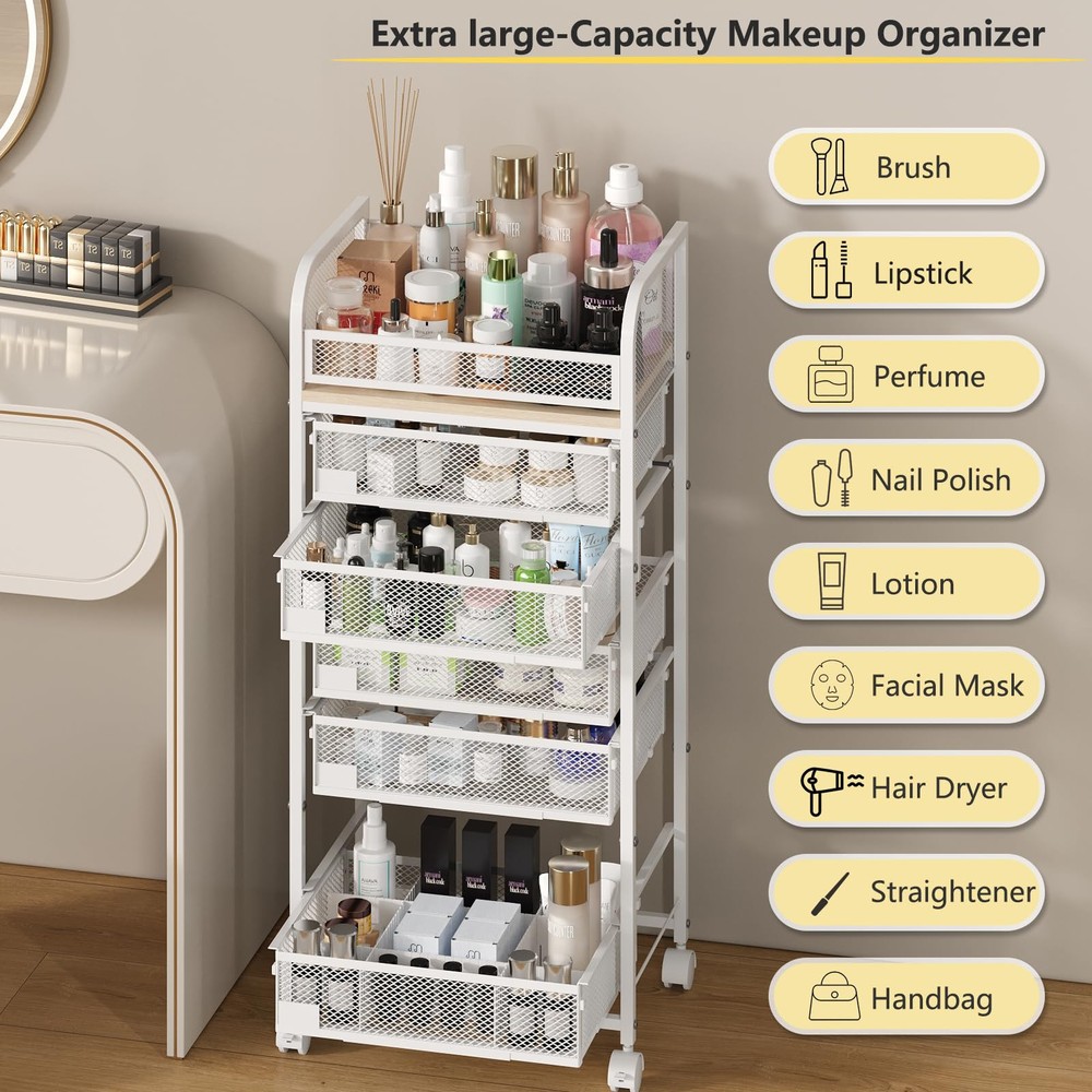 Features 5 drawers and an open top,perfect for brushes,lotions,etc.Dividers in drawers help organize lipsticks,perfumes,and nail polish.Adjust and combine spaces as needed to keep everything neatly arranged. Spacious & Customizable Storage - Features 5 drawers and an open top,perfect for brushes,lotions,etc.Dividers in drawers help organize lipsticks,perfumes,and nail polish.Adjust and combine spaces as needed to keep everything neatly arranged. 360° Swivel Casters with Brakes - Easily move this makeup cart around with four smooth-rolling casters.front wheels have brakes,allowing you to lock it securely by your vanity or sink,ensuring stability when in use. Versatile & Elegant Design - Ideal for cosmetics,skincare,and hair tools,this organizer also fits kitchens,living rooms,or laundry rooms.Its sleek, modern look enhances any space,keeping your home tidy and stylishly organized. Durable Materials & Easy Assembly - Built from strong MDF and reinforced steel,this cart holds up to 70 lbs.Each drawer supports 13 lbs.Includes clear instructions,and assembly is straightforward, taking only about 30 minutes to set up. Reliable Customer Support - Compact yet spacious at 16.3"L x 11.4"W x 35.9"H, this cart is backed by excellent service. If you need assistance, reach out anytime, and we'll respond with a solution within 24 hours,ensuring your satisfaction.