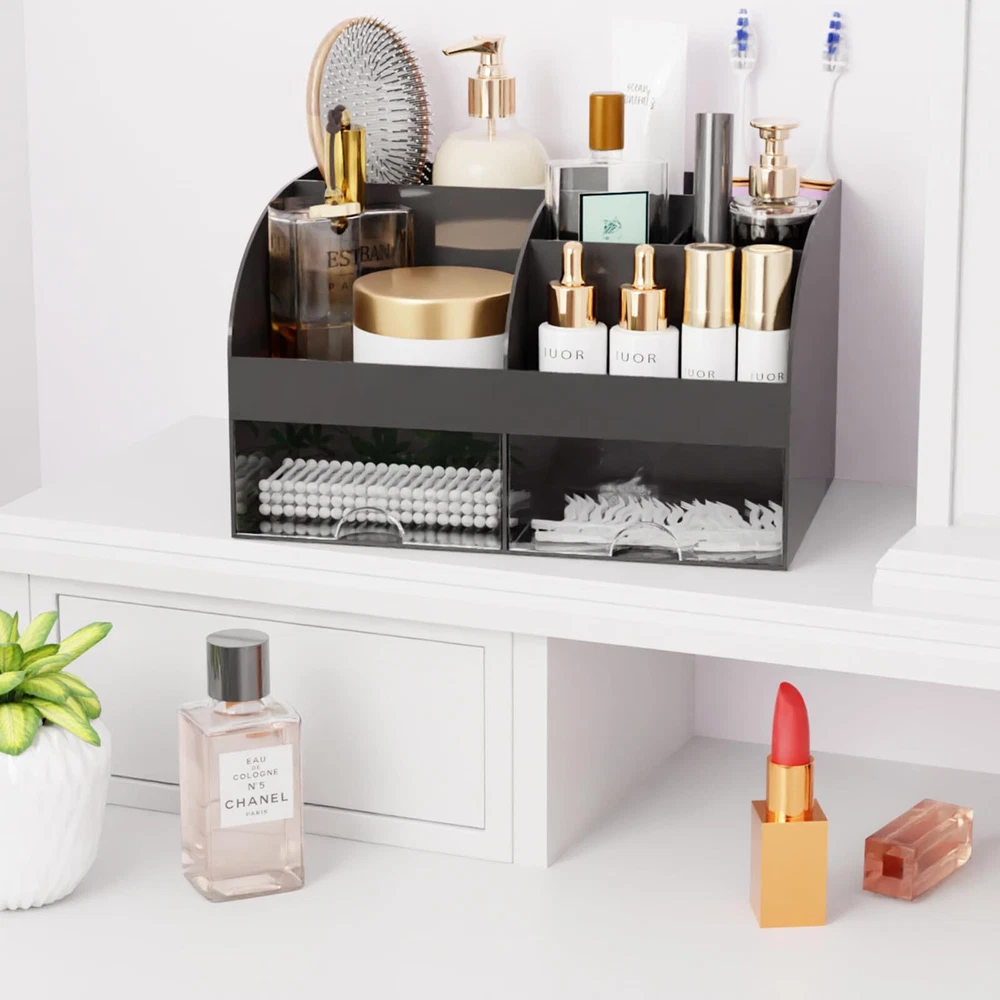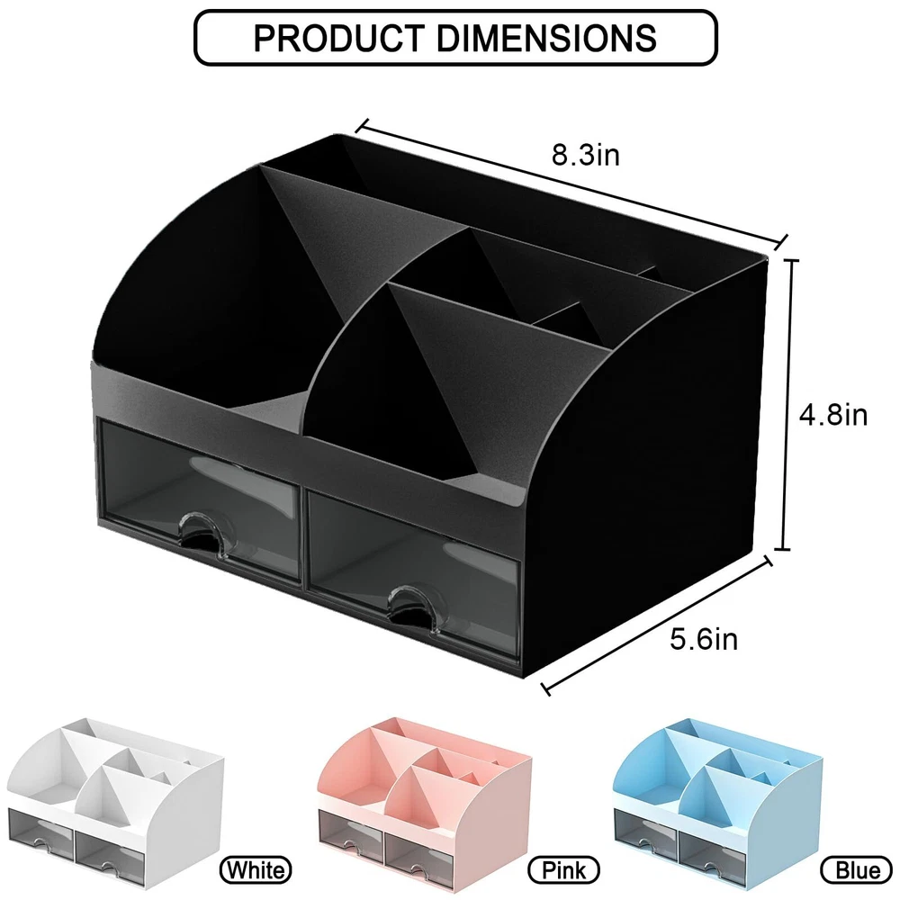 Makeup Organizer with Drawers, Cosmetic Storage for Dresser Vanity and Bathroom Countertop, Beauty Holder for Lipstick Brush, Skincare Organizer for Vanity, Cosmetic Display Case (Black) Multiple Storage Spaces: Small body with large capacity, great cosmetic storage countertop assistant contains 6 Sections and 2 drawers, different compartments allow you to place items according to your needs, transparent drawers allow you to quickly find what you need, easy to place and take, the perfect match can let you all the makeup accessories are neatly stored Premium Material: This plastic makeup organizer is made of high quality environmentally friendly ABS material, non-toxic and tasteless, the material is tough and especially durable, smooth edges, safe to use for long term Applicable Occasions: It can organize your dresser lotion, makeup brushes, lipstick, nail polish, mascara, eyeliners, small perfumes. Also great for organizing your bathroom supplies, such as toothbrushes, toothpaste, mouthwash, cotton swabs. also suitable for storing office stationery, such as calculators, notebooks, paper clips, pencils, scissors, etc Perfect Size for Desk: Perfectly sized, it serves as a bathroom or bedroom desktop organization for daily items, placing it doesn't take up much of the desktop surface, this organizer provides enough space to store your items for easy use and can keep your desk or dresser clean and organized Assured Shopping Experience: This desktop decorations organiser makes your office/ home/ school/ college dormitory desktop look more classy, it's the best choice for your own use or gift. If you have any questions, please contact us, we will be happy to serve you Shipping We offer FREE shipping on all orders! We ship within Three business days of payment, usually sooner. We use a selection of shipping services such as UPS, FedEx, USPS etc. We only ship to the lower 48 states, no APO/FPO addresses or PO Boxes allowed. Local pickups and combined shipping options are not provided at this time. Return You can return a product for up to 30 days from the date you purchased it. Any product you return must be in the same condition you received it and in the original packaging. Please keep the receipt. Feedback Customer satisfaction is very important to us. If you have any problem with your order, please contact us and we will do our best to make you satisfied. Contact Us If you have any queries, please contact us via ebay. We usually respond within 24 hours on weekdays. Please visit our eBay store to check out other items for sale! Thank you for shopping at our store.