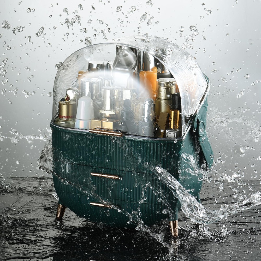 Appearance and size:11.4"L×8.1"W×14.4"H,Large capacity makeup organizer with 2 drawers,top apartment,even a 7.5”H bottle of skincare can fit in Clear display:With a top lid you don't have to worry about dust and water stains,while the transparent feature allows you to easily find what you need. The top lid lifts upwards in a standable design,allowing you to easily access the cosmetics you need Save much space and organize well:can store 16 bottles of lotion,6 bottles of serum,4 lipsticks,3 boxes of eye shadow,3 bottles of perfume,6 boxes of loose powder and some masks.Saves space and keeps vanity organized Portable and nonslip:With Handle,carry your skincare products from the vanity to the bathroom countertop with ease by simply lifting the handle.With nonslip feet,It also remains stable on wet bathroom countertop Easier life:Making homes tidier,more organize and easier to live in order for a better home life is our vision,and we hope convey this through high quality storage products. It makes a ideal gift for your daughter, girlfriend, family and yourself