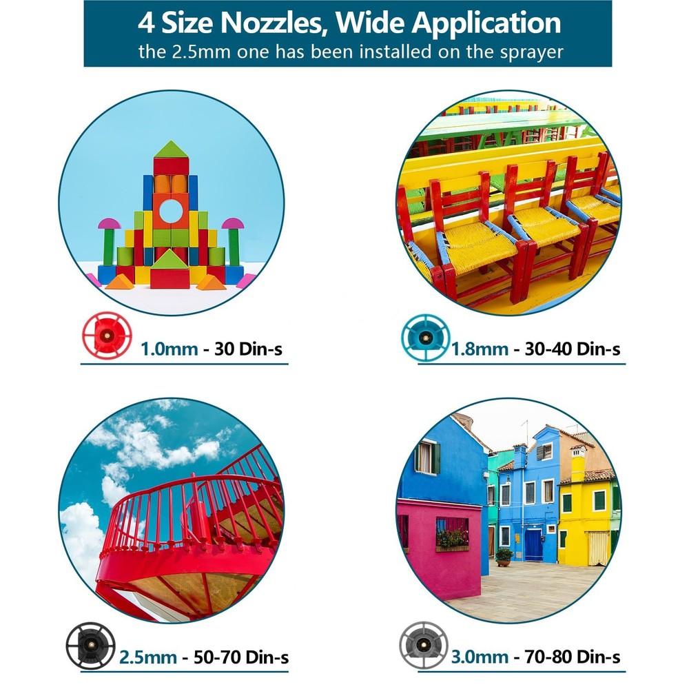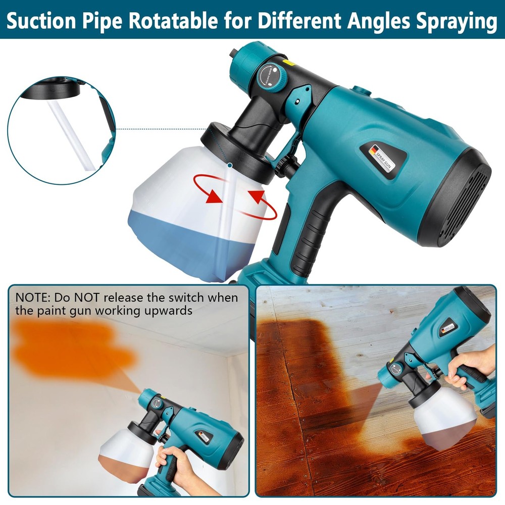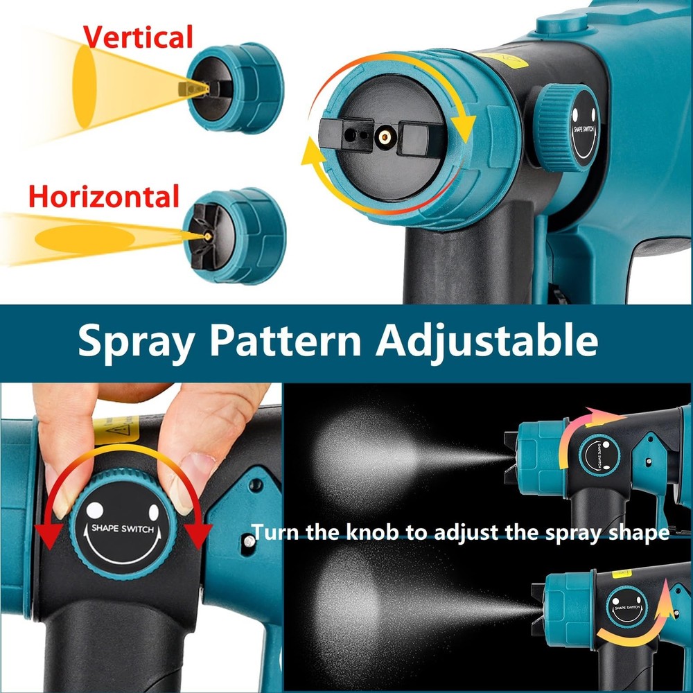 Product Features: Power: 200W Rated Voltage: 20V(Max) Motor Rated Speed: 42000rpm/min Spray Patterns: horizontal, vertical, orbicular Paint Tank Capacity: 1000 ml Applications: Suitable for wall painting, fence painting, door painting, window painting, metal painting, ceiling painting, car repairing, high-altitude operations, plant watering,etc. Care Instruction: Do not place the spray gun with the nozzle pointing upwards when it is out of use, or work upwards without releasing the switch to prevent the motor from being damaged by the backflow of paint. The spray gun should be cleaned in time after use to prevent the paint from solidifying and clogging the spray holes. Battery operated paint sprayer compatible with Makita 18v Batteries. Transform your spraying projects with ease and convenience with our wireless paint spray gun, no more worrying about cables not reaching your working area, enjoy a seamless painting experience. - Paint sprayer cordless for house painting comes with 4 copper nozzles to meet different needs, suit for painting tasks like cabinets, doors, furniture, fence, walls and other DIY projects. The copper nozzles outperform plastic in durability, clogging resistance and ease of cleaning. Nozzle sizes: 1.0mm, 1.8mm, 2.5mm(pre-installed), 3.0mm. - The paint sprayer gun equipped with 42000rpm brushless motor provides highly Efficient painting performance, faster and more convenient than brushes and rollers. - This paint sprayer gun features adjustable spray modes, horizontal,vertical and toggle the knob to adjust spray pattern from elliptic to round shape. Its adjustable flow control conveniently suit your needs. - This beginner friendly cordless paint sprayer is easy to assemble and clean, simple to operate. The suction tube can be switched for upward and downward operation. - This battery powered paint sprayer compatible with Makita 18V lithium ion batteries.(Battery Not Included). The HVLP paint sprayer built-in low voltage protection to protect your Makita battery.