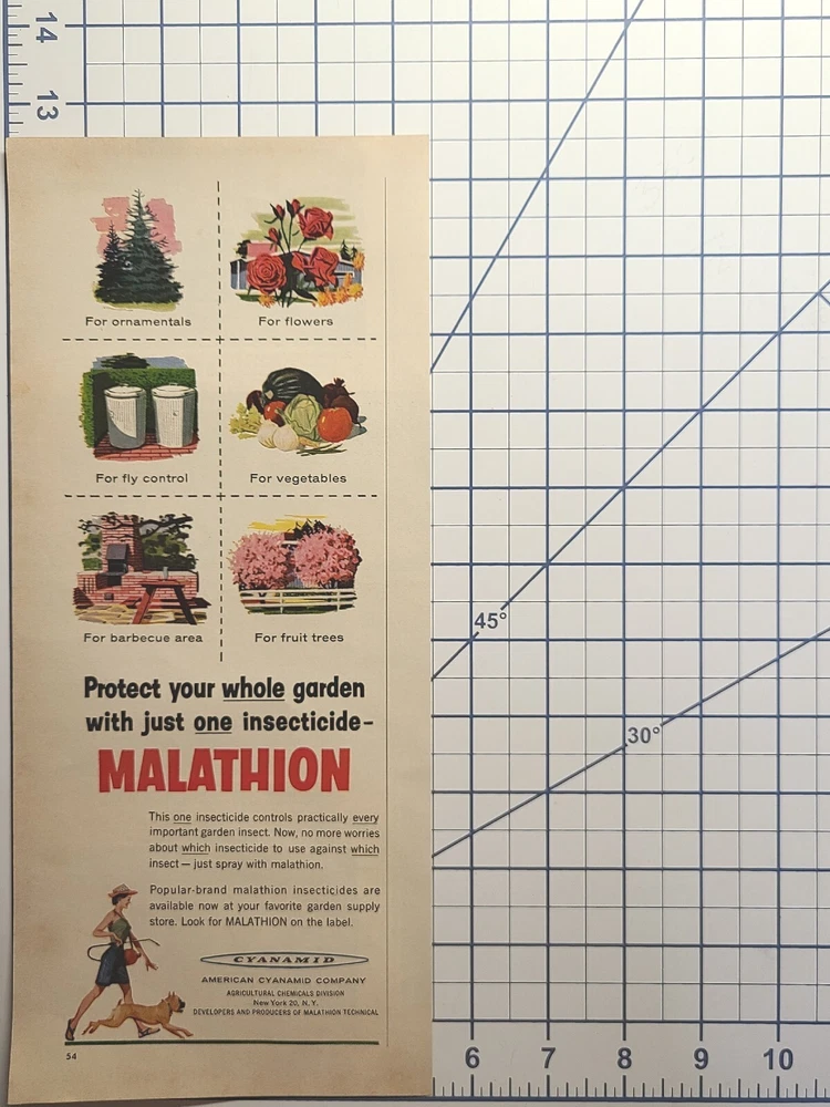 Malathion Insecticide Insect Spray American Cyanamid Co. Vintage Print Ad 1956 Half Page - great for framing! ------- Thanks for checking out this item. Please carefully view all of the photos for this listing - they are an important part of the description. I don't use stock photos or pictures sourced from third parties. The pictures you see are taken by me and show the product you're buying. Depending on the light, the pictures may not reflect the true color. If color is an issue, please message me and I can check for you. Any questions you might have about items in my store are always welcome. I'm happy to combine shipping when you purchase multiple items. Just buy the items, and then wait until you are invoiced to pay (within one business day). Unless noted above, all of my ephemera products are free of rips or tears. Vintage print ads invariably have some degree of wear, especially near the binding. Also, some fading is possible, as is the smudge or run of inks during production. If it's obvious that color has bled due to exposure to humidity or water exposure, you will see a ***CONDITION NOTE*** above. The small holes resulting from saddle-stitch (staple binding) may or may not be present on the piece. They will NOT be noted unless they're abnormal in some way. If their presence might affect your decision to purchase, or your satisfaction upon receipt, please feel free to ask first. I'm happy to provide additional details. As always, and as stated above, my pictures are your best source of information about this piece. As expected with vintage paper, there may be some natural darkening, and foxing may be present. I do not sell ephemera with evidence of mold, mildew, odor, or pest damage. Generally speaking, I will not offer for sale an item with any substantial condition issues unless it's of great quality, scarcity, or it has some other exceptional characteristic, and the issues would be described in detail. Thanks for stopping by Blue Feather Ephemera. I'm a part-time reseller of vintage, retro, and quaint items of good quality. Check out more of the items in this store for awesome examples of beautiful, interesting advertising from bygone days. Don't forget to add my store to your "favorites" if you like what you see. Then you'll be notified of new items, discounts, and special offers.
