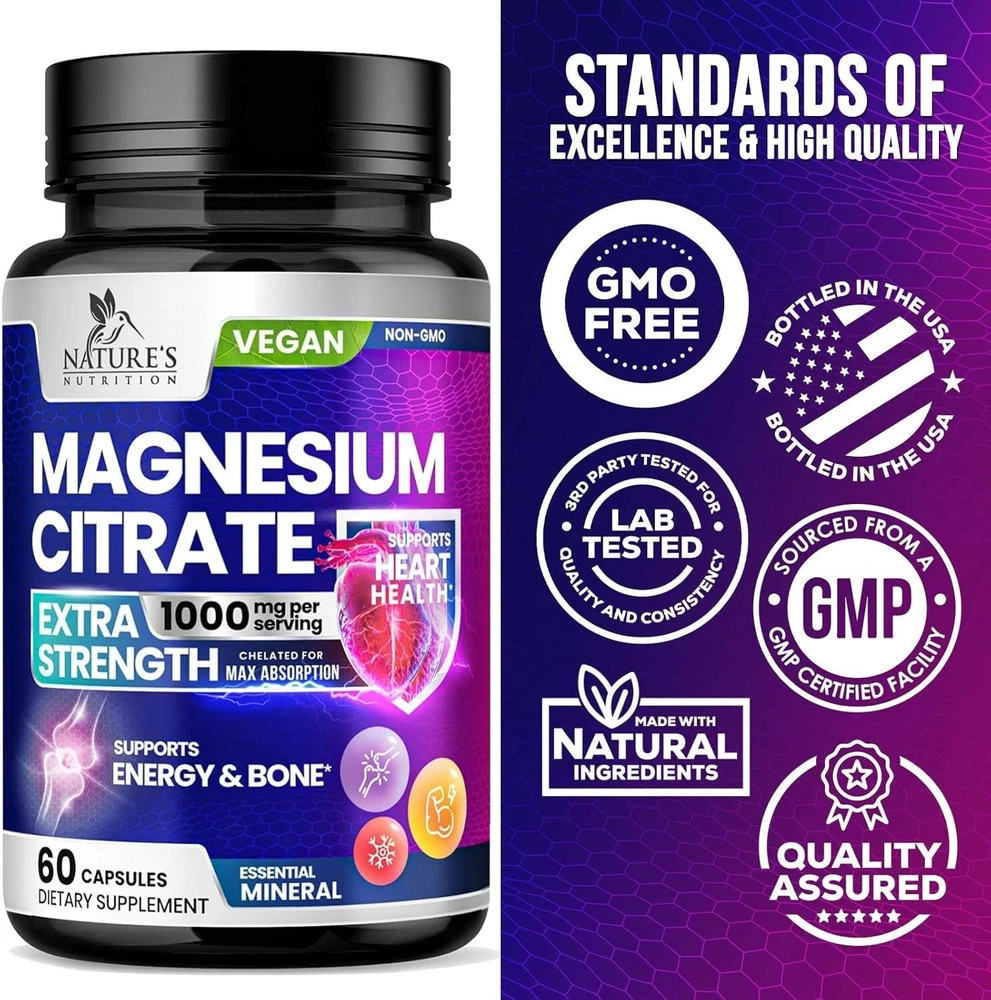 EXTRA STRENGTH FORMULA: Each capsule of Nature's Nutrition Magnesium Citrate delivers 1000 mg of chelated magnesium for maximum absorption; Experience the best magnesium citrate for full benefits with our magnesium supplement SUPPORTS MUSCLE HEALTH: Our magnesium pills help support muscle health, cramps, and support relaxation after workouts; This magnesium supplement for women and men provides essential muscle support NERVE AND BONE SUPPORT: Magnesium supports nerve health and bone strength; Our magnesium vitamin pills ensure you get vital support for nerve and bone health PURE AND NATURAL: Our non-GMO capsules, known as citrate de magnesio or magnesio, are free from artificial additives, offering a natural magnesium source; Trust Nature's Nutrition for purity in every magnesium supplement MAGNESIUM CITRATE SUPPLEMENT: best bone vitamin pills capsule capsules citrato complex d d3 extra glycinate gummies health heart nerve support mag magnes magnesio magnesiu malate men mg calm muscle natural nature natures nutrition nutrition glycinate oxide powder softgels strength supplements tablets threonate vegan 1000 1000mg 110 200 250 400 400mg 500 500mg vitamins women