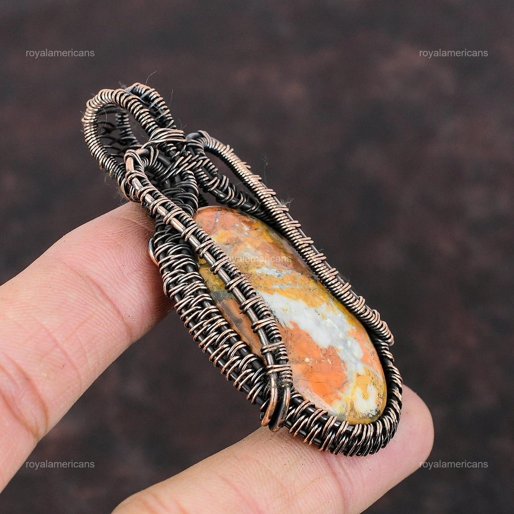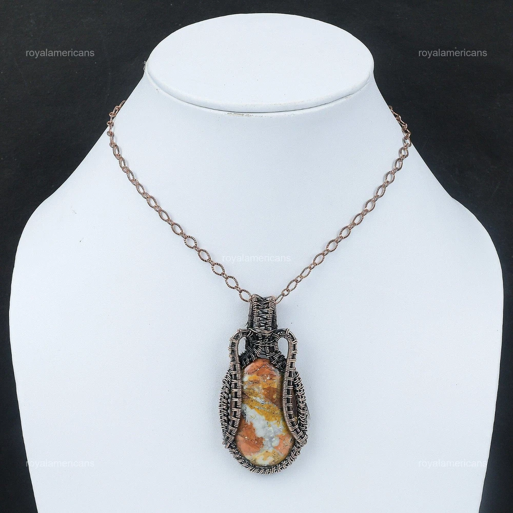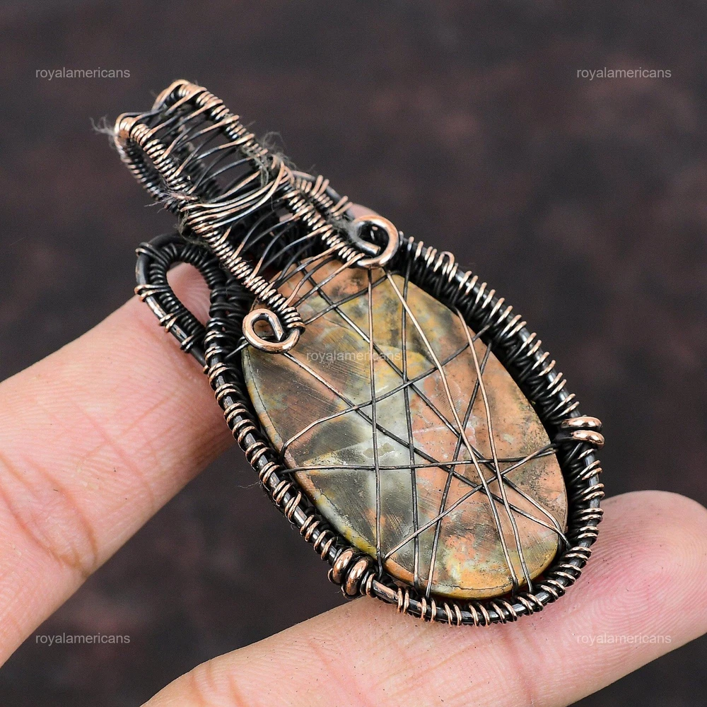 Note : Due to the natural formation of this gemstone. Slight variation in design and color are to be expected. Welcome to Royalamericans Mothers day Sale Maligano Jasper Stone Sister Handmade Pendant Jewelry Copper Handmade Pendant, Wire Wrapped Pendant, Wire Wrapped Jewelry, Copper Pendant, Copper Wire Pendant, Wrapped Jewelry, Wire Wrap Pendant, Wire Wrap Jewelry SKU : UWP-417 Gemstone : Maligano Jasper Stone Shape : Oval Metal Purity : Unknown Copper Length : Millimeters Width : Millimeters Copper has been used for jewelry making for thousands of years, dating back to ancient civilizations such as the Egyptians, Romans, and Aztecs. Copper was valued for its beauty, versatility, and durability, and was often used to make everything from jewelry and coins to cookware and tools. In addition to its historical significance, copper jewelry also offers several benefits. Copper is a natural conductor of heat and electricity, which makes it ideal for energy healing and therapeutic purposes. Wearing copper jewelry is believed to have various health benefits, such as improving circulation, reducing inflammation, and boosting the immune system. Some people also believe that copper jewelry has the ability to balance energy and improve mood. For Mother's Day Gift For Father's Day Gift For Promise For Valentine's Day For Halloween Party For Christmas Day Gift For New Year Party For Mom For Her If you can't find the information you need or need some advice for your design? Feel free to contact us. We are fast to reply :) All our work is made by hand with Love and Care in our workshop Thank you so much for visiting and hope you enjoy shopping with us Royalamericans is committed to delivering the best quality sterling silver jewelry to customers. As a handmade jewelry manufacturer, we offer an extensive selection of copper gemstone jewelry that showcases the brilliance of our craftsmanship. We are an experienced handmade jewelry supplier with expertise in embellishing gemstones to suit every style. We offer you the liberty to create your jewelry ensemble with sparkling, earthy, and pure gemstones. Our Talented artisans masterfully handcraft each piece of jewelry you see here. Our pieces are made with genuine gemstones.