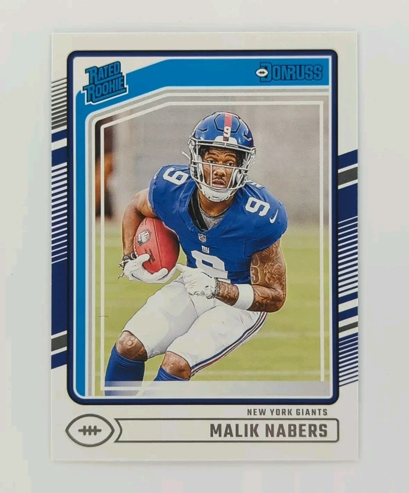 The product is a lot of two 2024 football trading cards featuring rookies Malik Nabers and Tyler Nubin. Both cards are from the Panini brand, specifically from the 2024 Panini Prizm Football and 2024 Donruss Football sets. These cards are part of the Base Set and Rookie categories, showcasing these players during their debut season with the New York Giants in 2024. As these are rookie cards, they hold significant value for collectors and fans looking to add these promising athletes to their card collections.