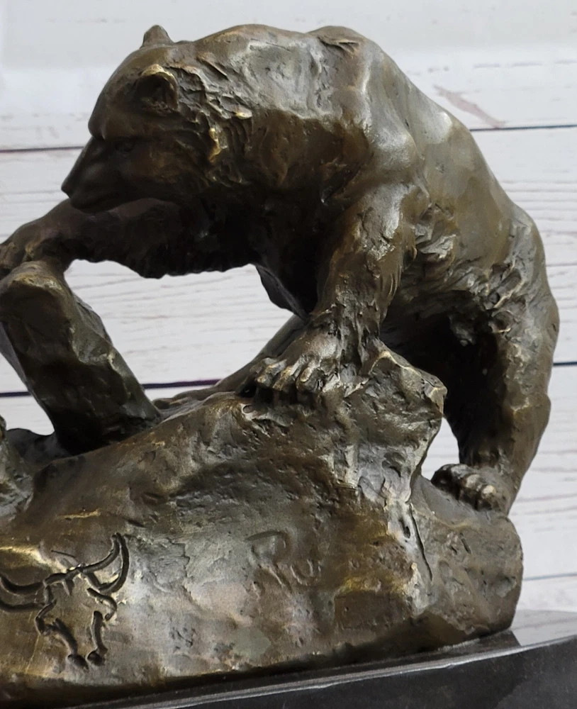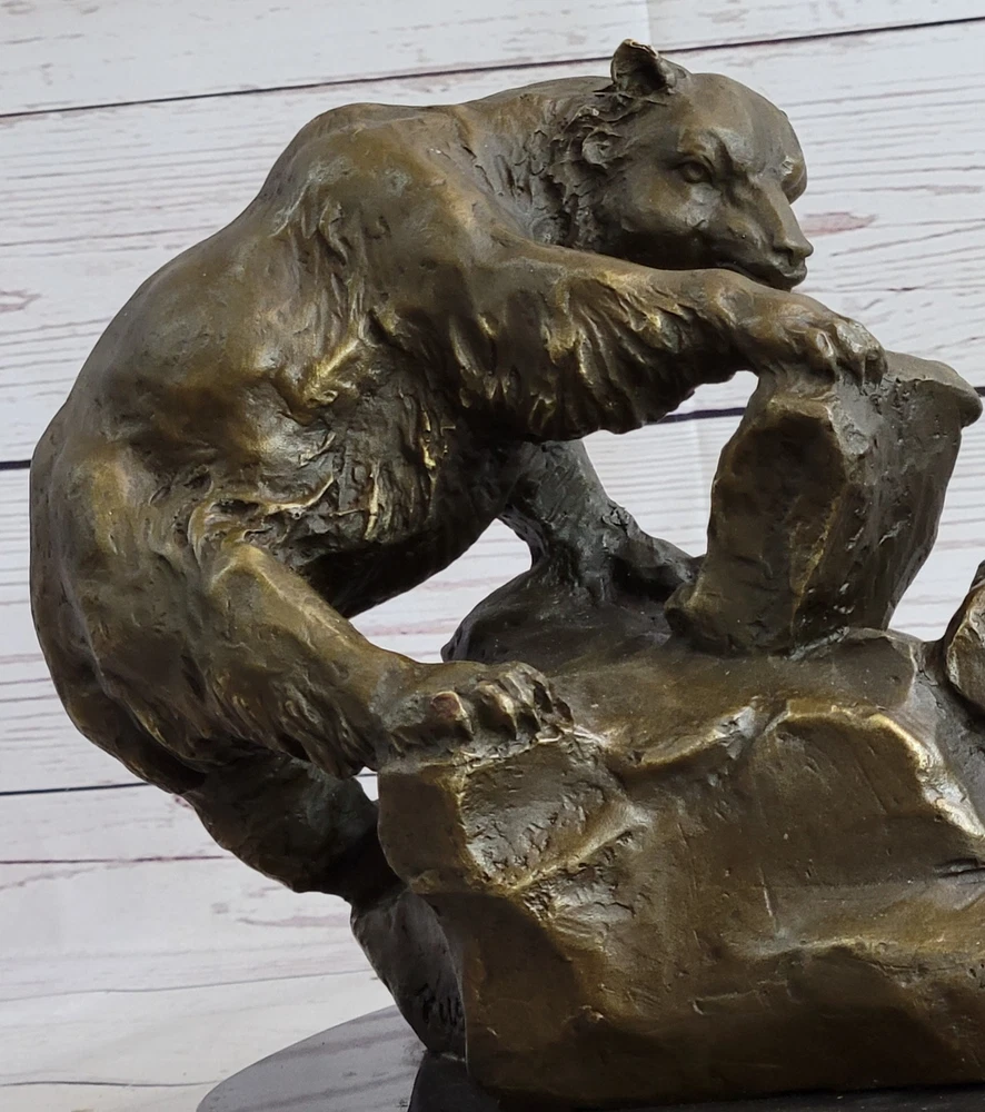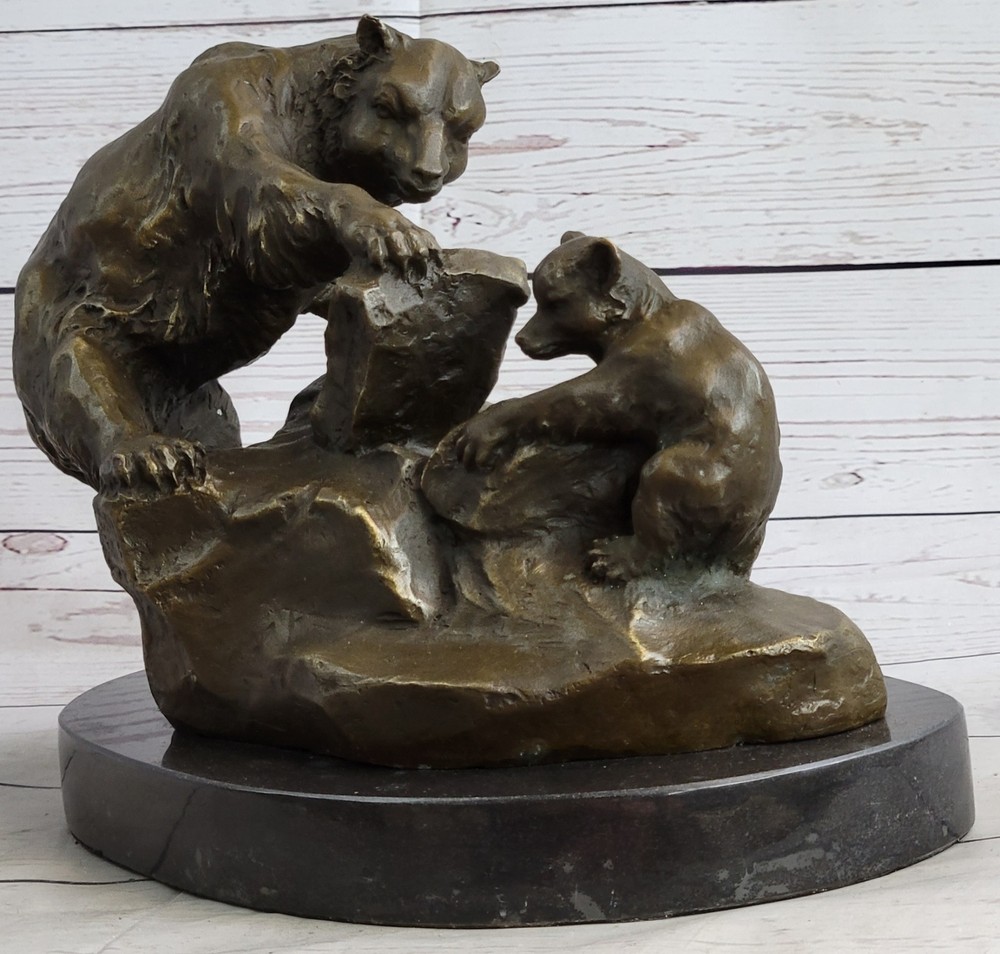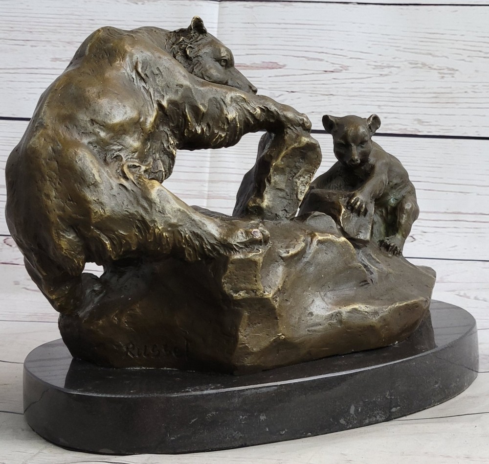 Mama Grizzly Bear Cub Hot Cast Bronze Figurine Sculpture Statue Wildlife Decor Mama Grizzly Bear Cub Hot Cast Bronze Figurine Sculpture Statue Wildlife Decor Condition : This sculpture is in perfect condition Bronze Dimensions with Marble Base: Height 10" X Width 12" Marble Dimensions: Diameter 10 1/2" Height without base:9" Weight:16 LBS Inventory:53Y2646035 Immerse yourself in the wonders of nature with the captivating bronze sculpture titled "Mother Bear and Cub." This exquisite artwork portrays a tender and educational moment between a mother bear and her young cub in the rugged terrain of a mountainside. With her immense strength, the mother bear skillfully pries back a heavy stone, revealing a treasure trove of moths and grubs for her curious offspring. The young cub attentively watches, absorbing the valuable lesson on foraging while safely clinging to a sturdy rock. Crafted with meticulous attention to detail, this bronze sculpture is a testament to the ancient technique of lost-wax casting, a method that ensures the faithful reproduction of intricate textures and lifelike forms. The sculpture bears a rich brown patina finish, adding depth and warmth to the artwork, while also serving as a protective layer for long-lasting preservation. Resting upon a sleek black marble base, the sculpture stands as a testament to the artist's skill and creativity. It proudly bears the signature of the esteemed artist, Russelle, further affirming its quality and artistic value. Invite the captivating beauty of the natural world into your space with "Mother Bear and Cub." This remarkable bronze sculpture captures the essence of maternal love, resilience, and the teachings of the wild. Whether displayed as a centerpiece in a nature-inspired collection or as an accent piece in a rustic-themed decor, this artwork is a timeless celebration of the bond between mother and child, reminding us of the profound lessons that nature imparts. SIGNED BRONZE STATUE MOTHER BEAR PLAYING WITH HER CUB SCULPTURE FIGURINE GIFT Video will open in a new window Using the eBay App? Paste link into a browser window: [isdntekvideo] Shipping Terms : Most of our items are shipped via USPS (United States Postal Service) mail or UPS. Most orders are shipped within 24-48 hours of purchase. Please be aware that not all items are available for USPS shipping due to size and weight. We do ship to Hawaii, Alaska, Canada, Puerto Rico, APO/AE, and U.S. Virgin Islands, however, an additional charge may be required. Please contact us before making any purchases in these areas. For Non-USA customers, you may be responsible for all duty, tax, brokerage fees that may be due upon delivery (shipping costs cover freight charges only). We also ship internationally. Please refer to the "Shipping and Handling" chart for the rates for each area. Payment : We accept just about any form of payment. PayPal, Master Card, Visa or American Express credit cards. Money orders, cashiers checks, and even personal or business checks. For governmental institutions, we will also accept a purchase order. Please understand that for personal or business checks we have to wait for the check to clear (usually 7 days) before shipping. Condition : New Sealed Box,This is Stock Photo, Slight Color Variation!! Listing and template services provided by inkFrog