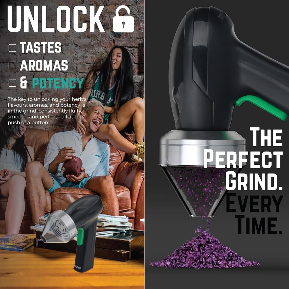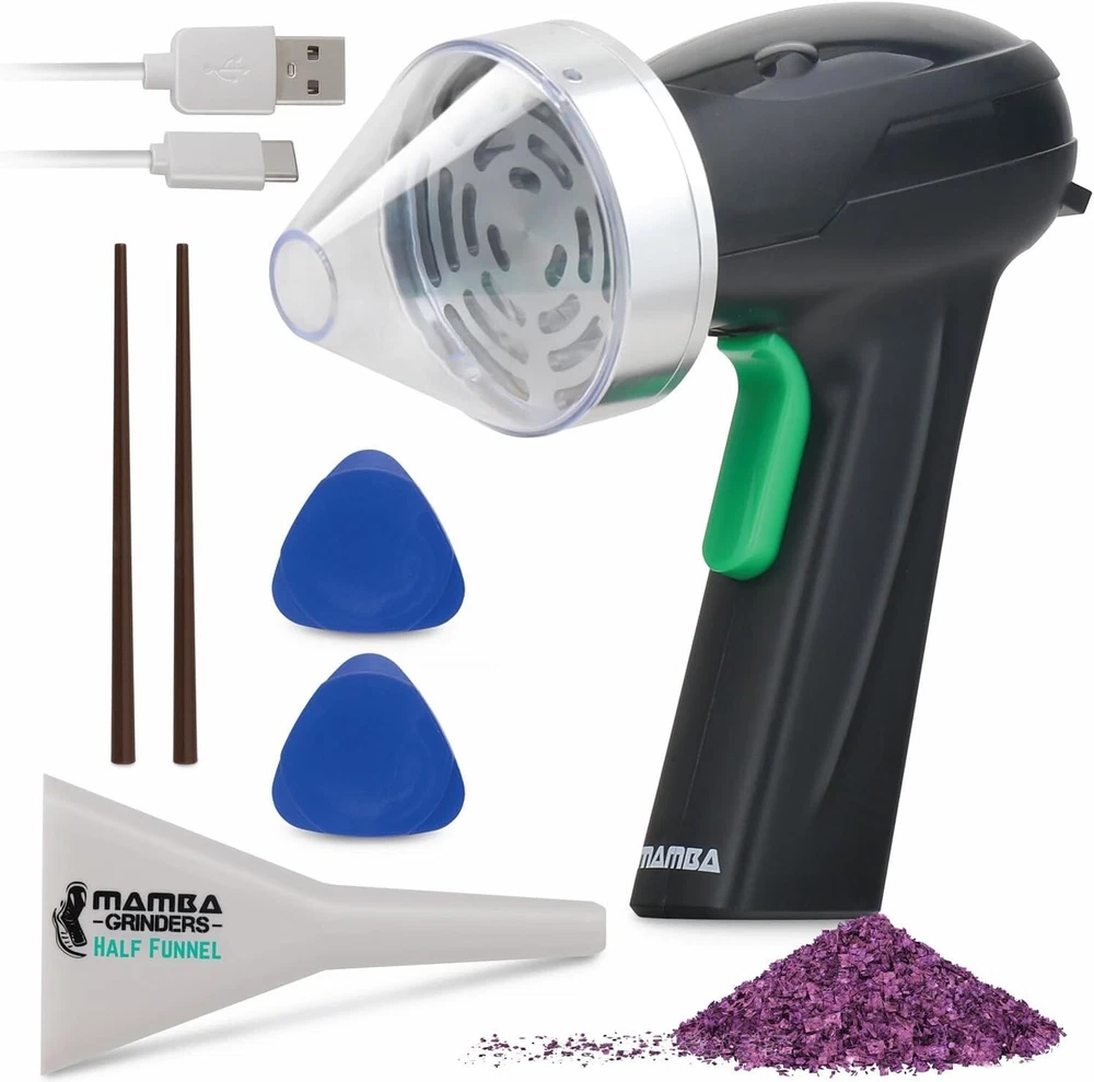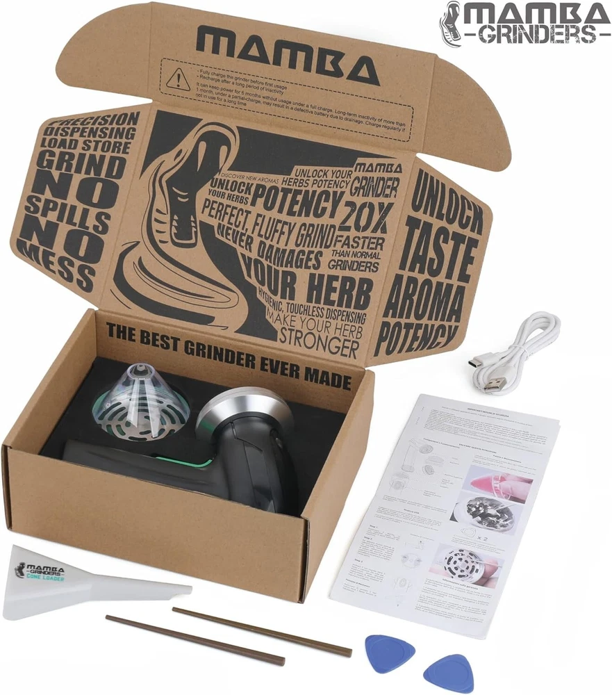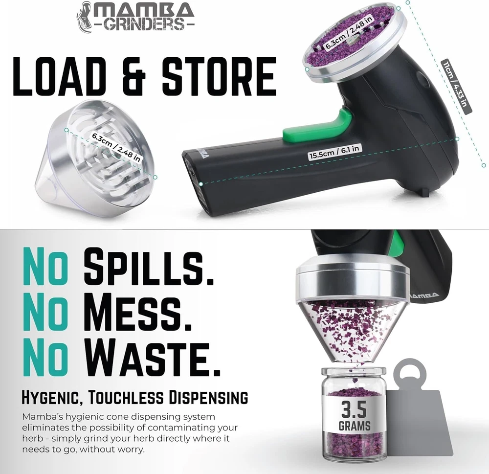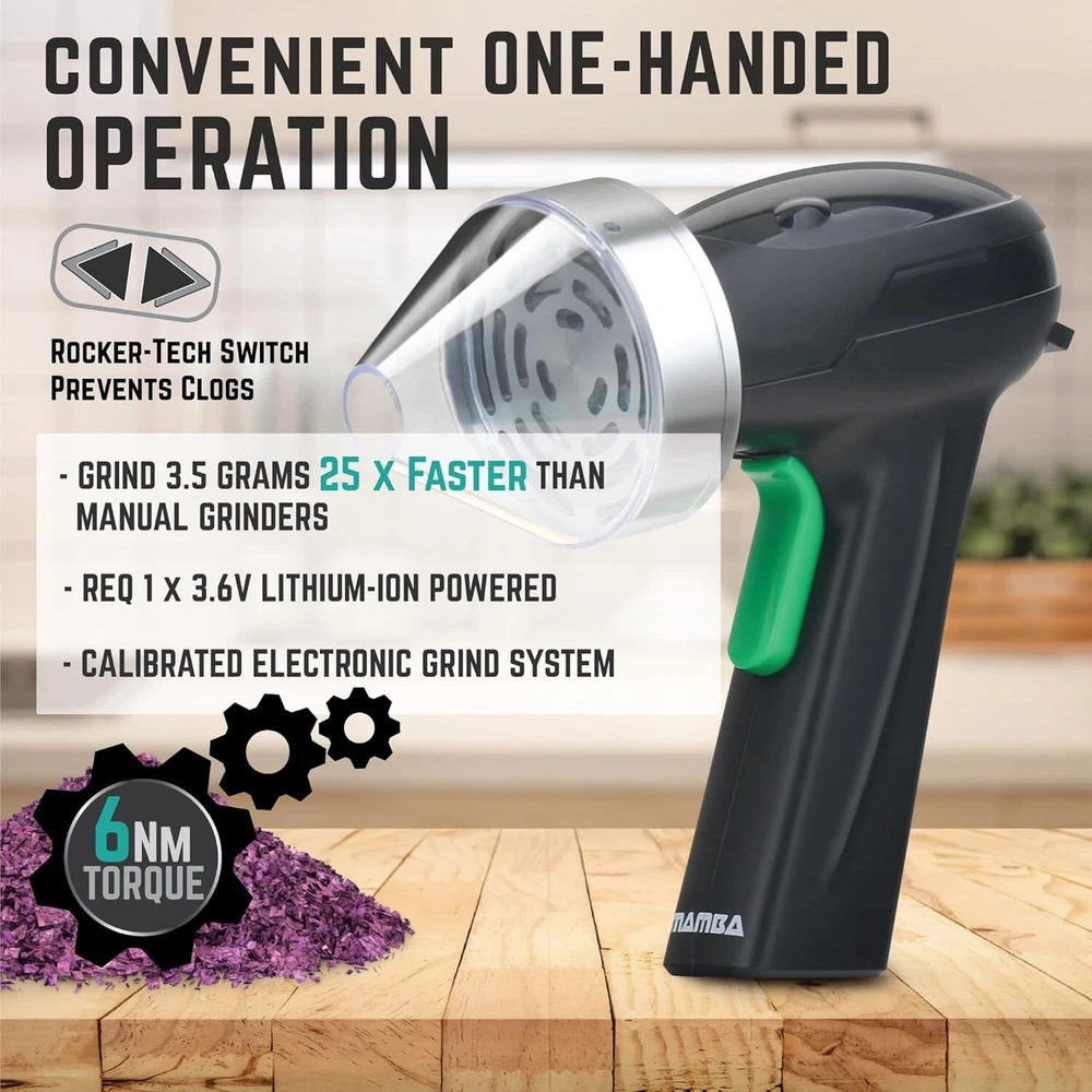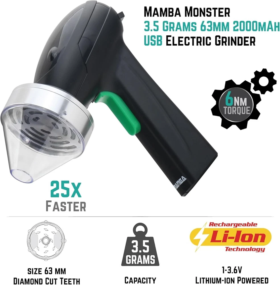 Mamba Monster 3.5g 63mm Head Portable Electric USB Herb Grinder - Silver Bring effortless electric herb grinding to your home kitchen. Its 63mm aluminum head grinds up to 3.5g of herbs and spices, making dispensing easy with its clear-cone spout and simple one-handed operation. Easy-grip trigger switch For smooth one-handed operation The Mamba Electric Herb Grinder is designed for effortless grinding, even for those with limited hand strength. The clear-cone spout ensures precise, mess-free dispensing of herbs and spices, saving you time in the kitchen. 2000mAh Li-ion battery for long-lasting power Aluminum CNC-milled teeth for precise herb cutting USB-C charging for universal convenience With its herb and spice pouring accessories, upgrade your cooking with smooth, efficient grinding that fits right into your routine! Filling and Cleaning Accessories No Muss, No Fuss Preparation The grinding head's clear-spout allows for direct hygienic dispensing of herbs. Use the half-funnel and packing stick for accurate and easy herb filling into containers or holders Complete with triangle pick and mini-scoop cleaning accessories Rapid Electric Grinding - In the Palm of Your Hand Holds Up To 3.5g of Herbs Grinding heads are precision milled from anodized aluminum alloy with curved razor sharp teeth Cuts and pushes through material without clumping up 6Nm of High Turning Torque Grind product/material 25X times faster than by normal hand grinding Efficient planetary motor gears powered by a rechargeable 2000mAh Li-ion battery It Gets The Hard Work Done Pushing the large lightweight switch in left and right directions prevents jams Gain benefits for infirm hands with limited mobility and strength 2000mAh USB Rechargeable Includes a USB Type-C lead to connect to any USB power output eg. a phone charger or notebook port Please fully charge the grinder before first usage Mamba Herb Grinders are the perfect kitchen tools for any herb and spice lover. Fast and easy to use, start grinding and milling with trouble-free ease The Mamba Grinder Family Mamba Lite Add to Cart Mamba Original Add to Cart Mamba XL Loader Add to Cart Mamba Monster Add to Cart Mamba Monster Loader Add to Cart Customer Reviews 3.9 out of 5 stars 1,527 4.4 out of 5 stars 5,947 4.2 out of 5 stars 2,020 4.3 out of 5 stars 15 4.3 out of 5 stars 15 Price $21.99 $ 21 . 99 $33.99 $ 33 . 99 $46.99 $ 46 . 99 $54.99 $ 54 . 99 $56.99 $ 56 . 99 Features All Plastic Herb Grinder Alloy Head Grinder XL Alloy Head & Loader System XXL Monster Alloy Head Grinder XXL Monster & Loader System Torque 2Nm 3Nm 4Nm 6Nm 6Nm Capacity 0.75g 1g 3g 3.5g 3.5g Grinder Size (Dia) 50mm 50mm 55mm 63mm 63mm Battery Capacity (MAH) 600 1200 1500 2000 2000 Battery Ni-MH Battery Li-ion Battery Li-ion Battery Li-ion Battery Li-ion Battery Top About this item Similar Questions Product information Reviews From the brand Mamba Herb Grinder Pick up a Mamba Herb Grinder today and release those favorite aromas and flavors! Previous page The Mamba Electric Grinders Range Traditional hand grinding and dispensing methods are just too slow and hard. You have to use two hands, it's easy to clog, and you can't grind very much at a time What makes our products unique? Get rapid battery-powered razor sharp teeth and a one-handed Rocker Switch for jam-free powered motions - all in a modern design with stylish colors Your Portable Herb Grinder Mamba Herb Grinders are the perfect kitchen tools for any herb lover. Fast and easy to use, and complete with a whole set of accessories for trouble-free herb grinding Mamba Original V2 Herb Grinder Visit the Store Mamba Loader XL Herb Grinder Visit the Store
