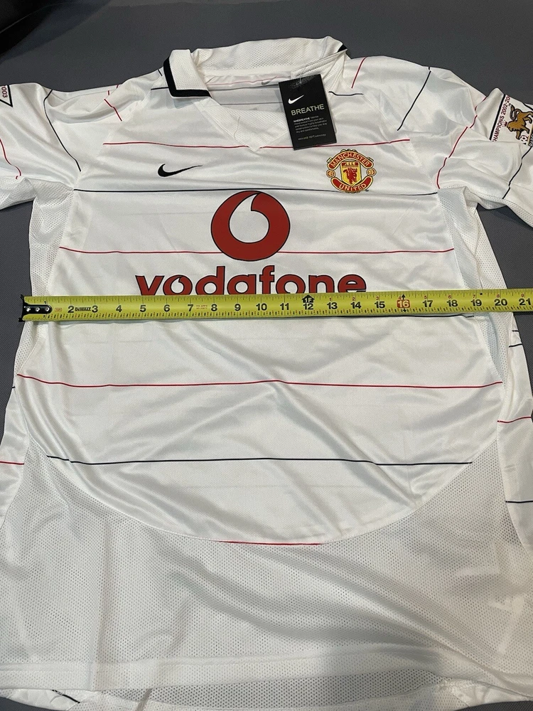 Show your love for Man United with this retro 2003-2005 away white jersey, featuring the legendary Ronaldo #7. This short sleeve jersey is perfect for any soccer fan, especially those who support Manchester United. The jersey is by Nike and is available in men's large size. The jersey is primarily white in color and features the iconic Manchester United logo on the chest. It's a great piece of fan apparel for any soccer match or game viewing party. This product is a must-have for any true Man United fan. Order as soon as possible to receive before the holiday if you have any questions lemme know