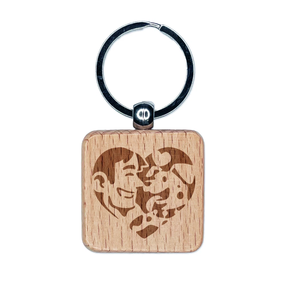 Man with Dog Puppy Pet in Heart Engraved Wood Square Keychain Tag Charm