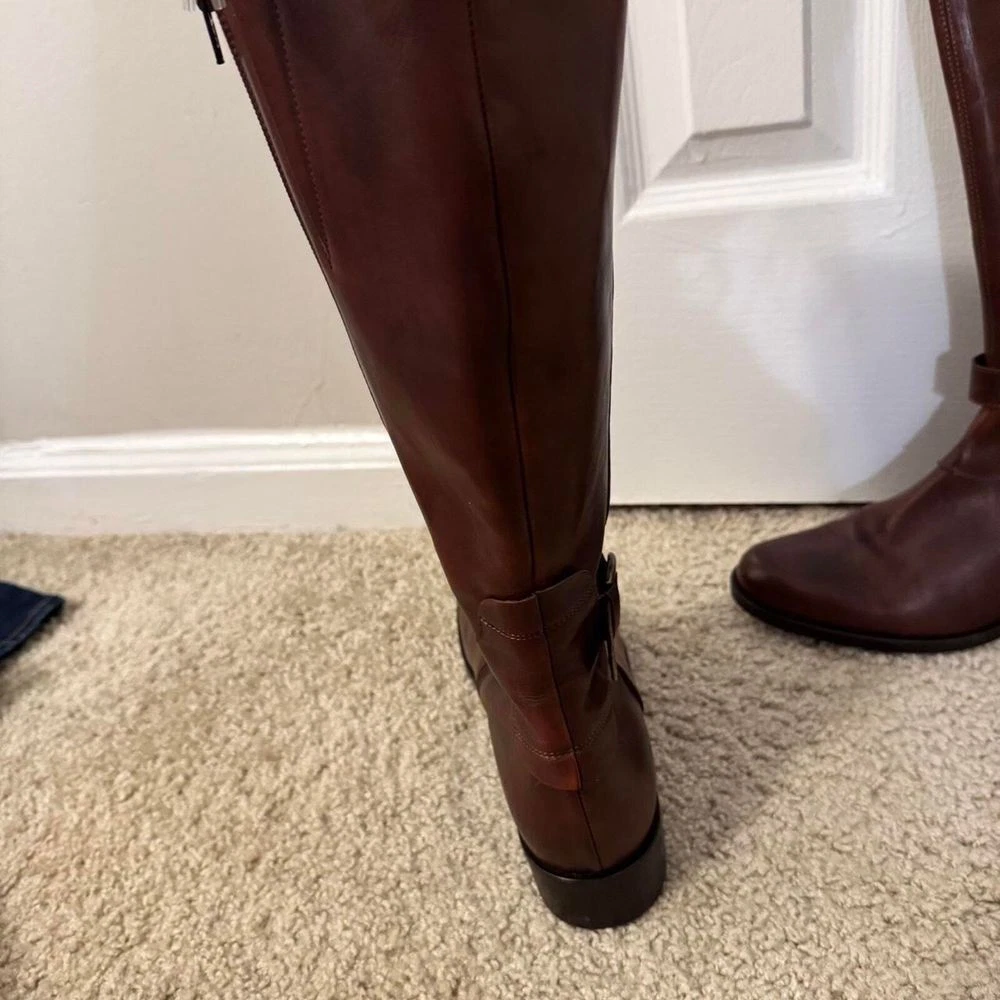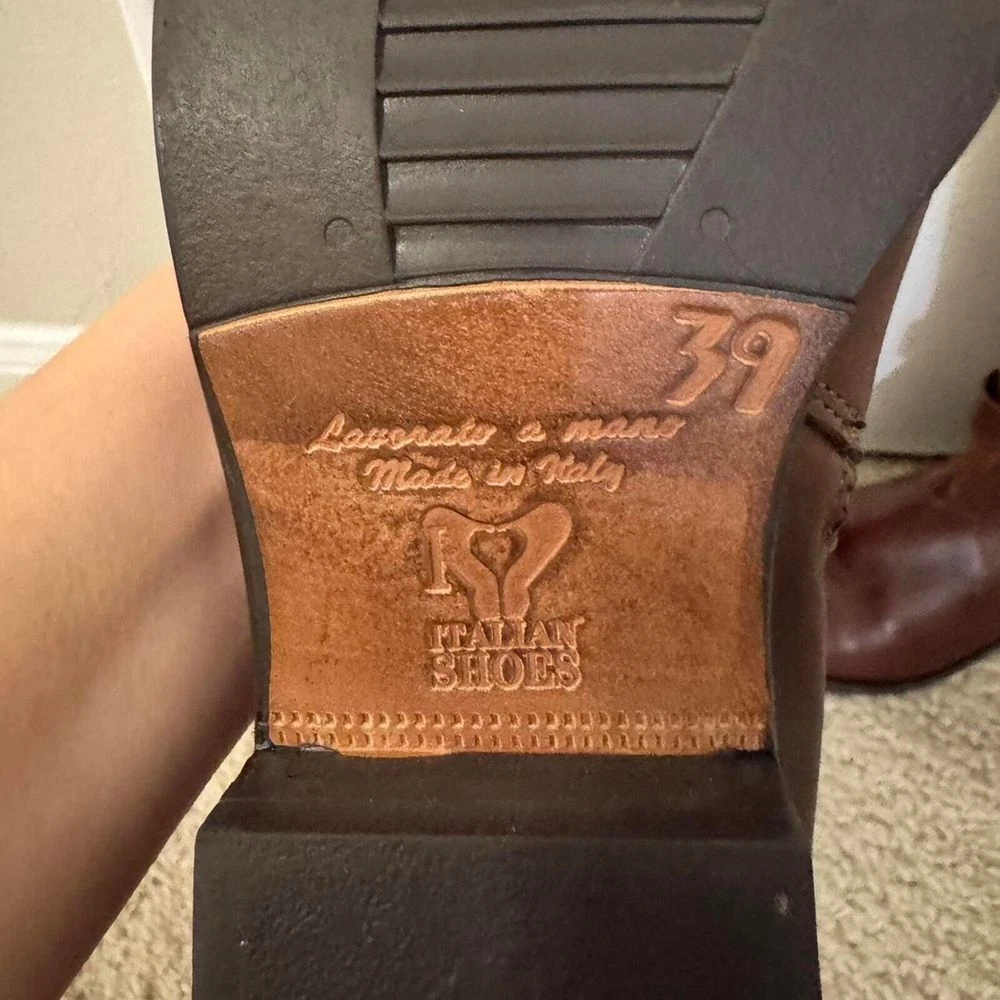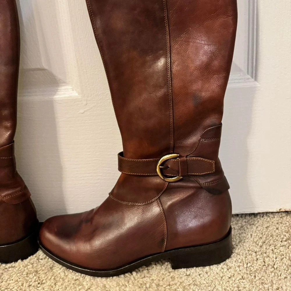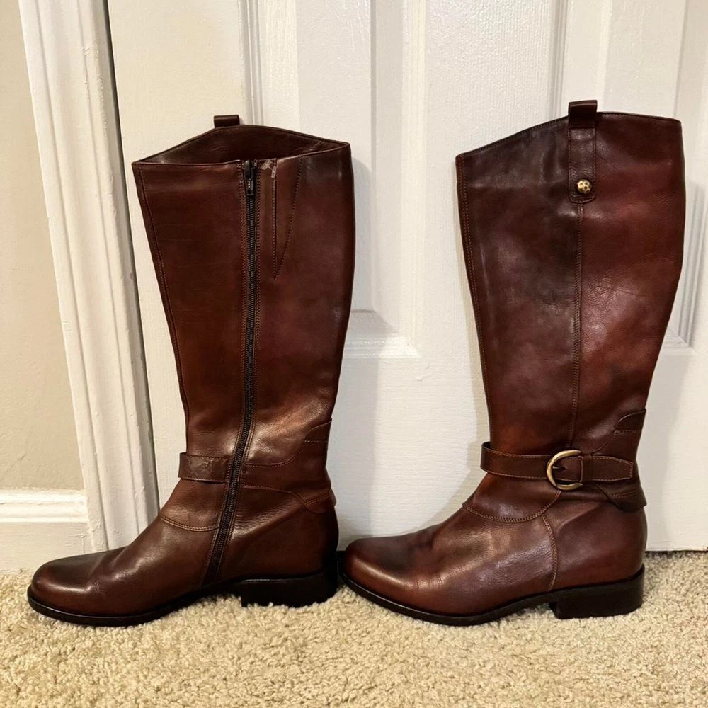 Elevate your fall and winter wardrobe with these classic Italian leather riding boots. Features a timeless equestrian design with elegant buckle detail and side zip closure. The rich brown leather and knee-high silhouette make these boots perfect for both casual outings and more polished occasions. Pair beautifully with skinny jeans, leggings, or flowing dresses for a sophisticated look. The durable construction and classic style ensure these boots will be a wardrobe staple for years to come. Style: Riding Boot Color: Brown Department: Women Upper Material: Leather Shoe Shaft Style: Knee High Outsole Material: Rubber Heel Height: Low (1-1.9 in) Heel Style: Block Occasion: Casual, Business, Workwear, Travel Features: Side Zip Closure, Buckle Detail, Knee High, Italian Leather, Equestrian Style Keywords: riding boots, knee high boots, leather boots, equestrian boots, brown boots, italian leather, buckle boots, zip up boots, tall boots, winter boots, classic boots