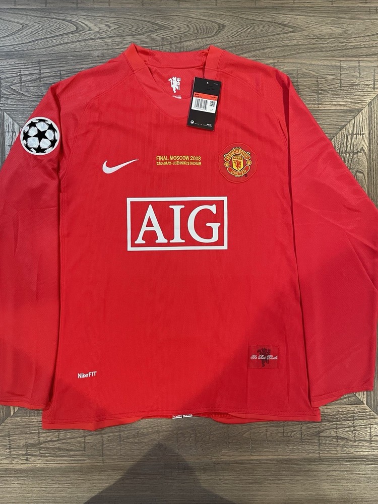 The product is a Manchester United 2007/08 Cristiano Ronaldo home red long sleeve UCL final soccer jersey by Nike. This officially licensed jersey is designed for men in size L and features the iconic red color and team logo. Perfect for fans of Manchester United and soccer enthusiasts alike, this jersey is a must-have for collectors and supporters of the team and player. Representing the iconic moments of Ronaldo's time at Manchester United, this jersey is a timeless piece of fan apparel for soccer fans.