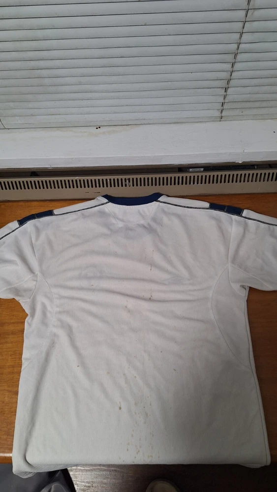 Show your support for Manchester United with this replica away jersey from adidas. The blue jersey features the team's logo on the chest and is available in size L for men. This jersey is perfect for any soccer fan, especially those who love to represent their favorite team. It has a stain on the back, but that won't stop you from showing your love for the Red Devils.