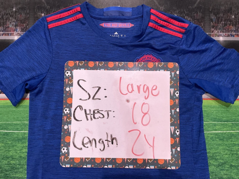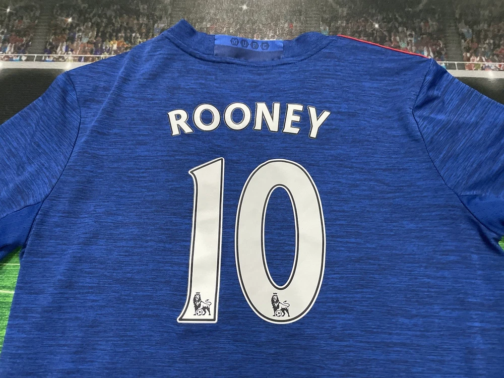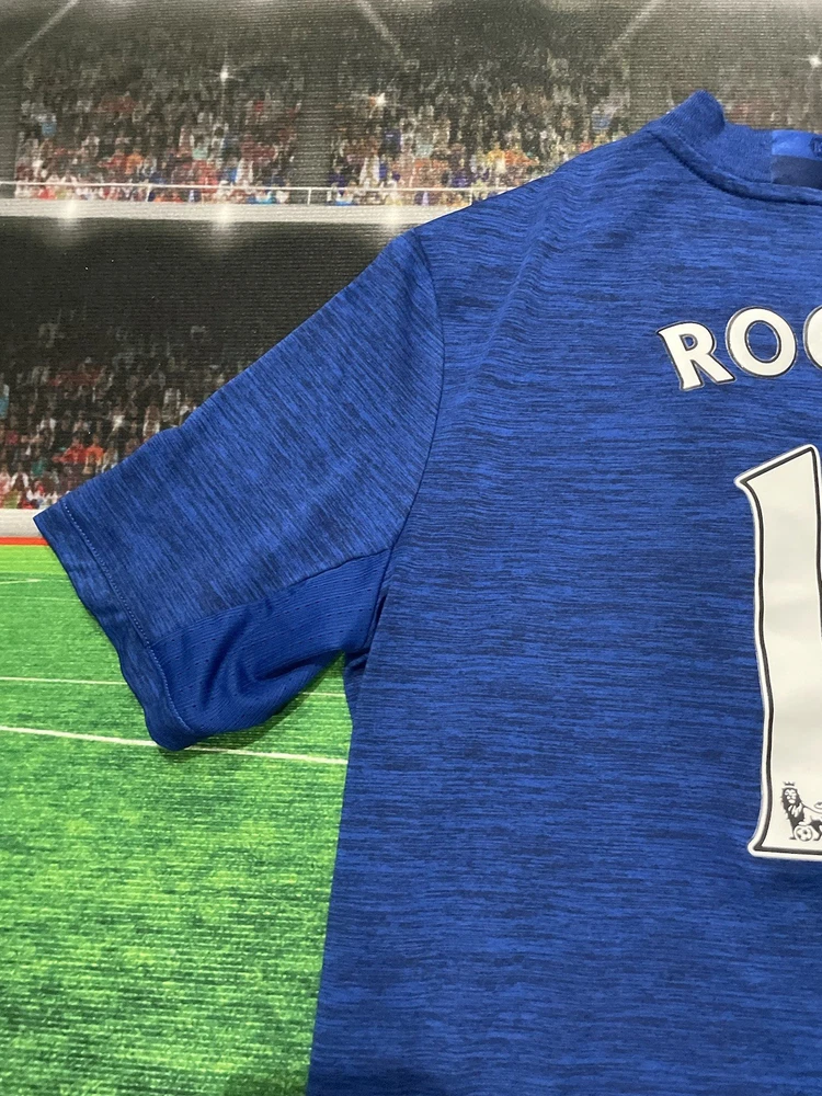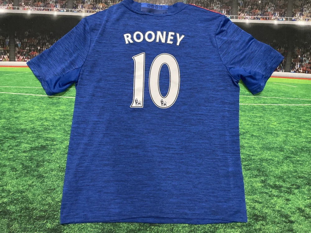 This product is a preowned youth size large Manchester United Wayne Rooney #10 Adidas jersey in blue. It is officially licensed by Adidas and features the iconic Wayne Rooney player name. The shirt represents the Manchester United team and is designed for unisex children. Made in Thailand, this jersey is a must-have for young fans of soccer and the legendary player, Wayne Rooney.